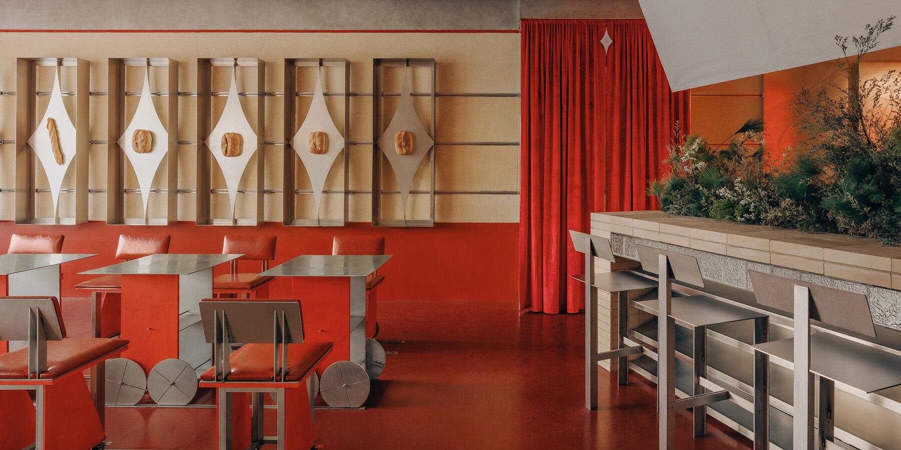 Стол с растением в центре стоит на месте, но в дальнем конце зала висит красная занавеска — ее можно задвинуть, чтобы сделать атмосферу более камерной и уединенной. Четырехконечная подставка для десертов подкатывается прямо к посетителю. В теплые дни столы выезжают на рельсах наружу, и кофе пьют уже на траве.
