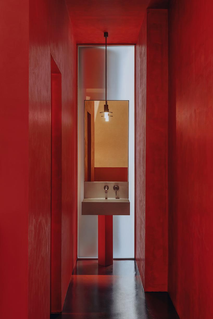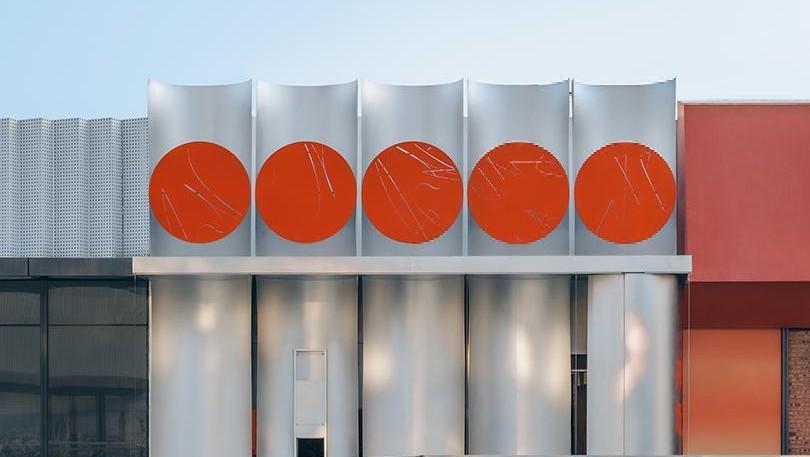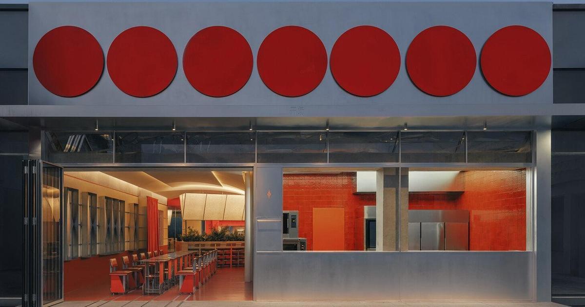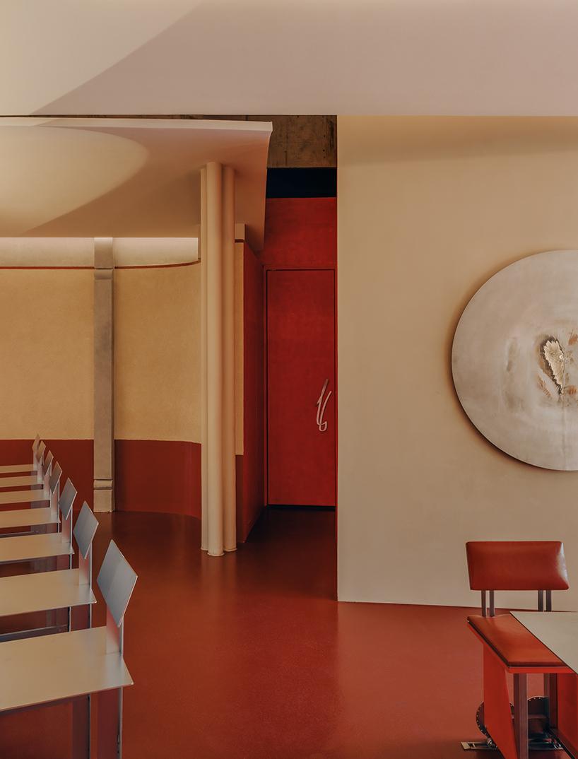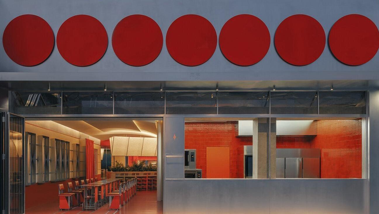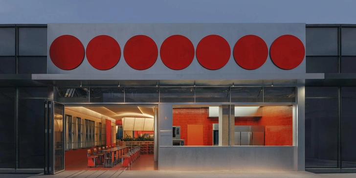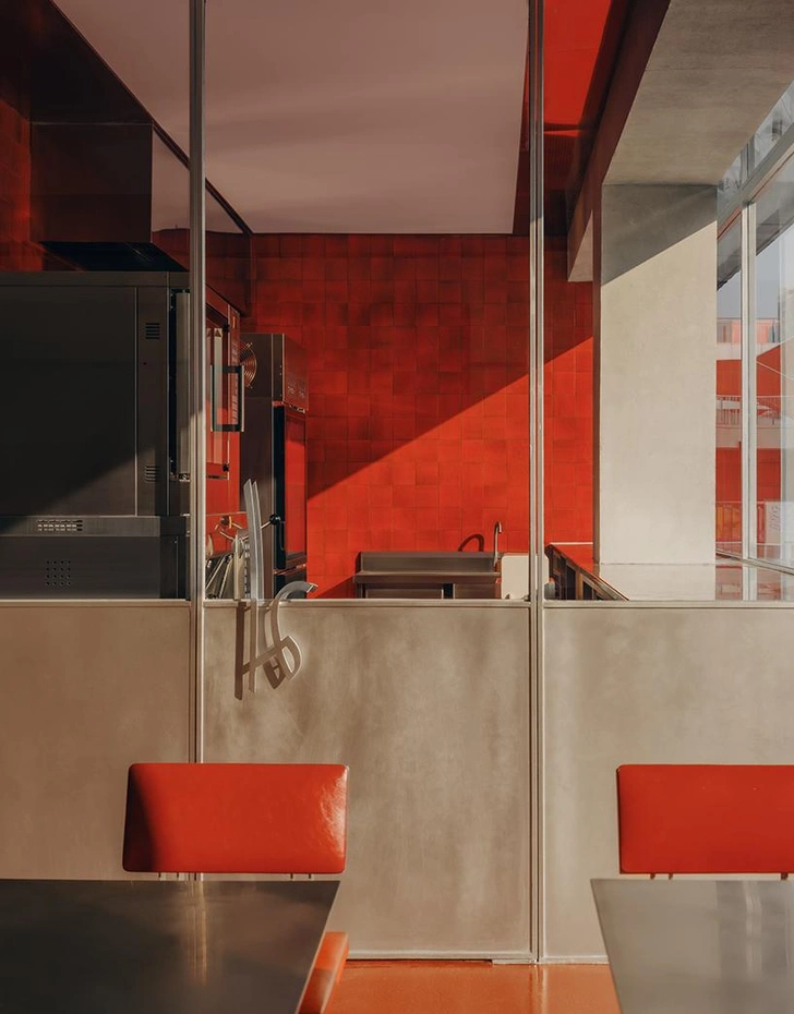 Эти красные объемы работают как фильтр — задерживают запахи и лишний шум, но не закрывают кафе полностью. В нижней части полуцилиндров сделали горизонтальные поверхности — на них можно облокотиться или присесть, пока ждешь кого-то. Вечером из сквозь фасад пробивается свет, и прохожие видят, что внутри что-то происходит.