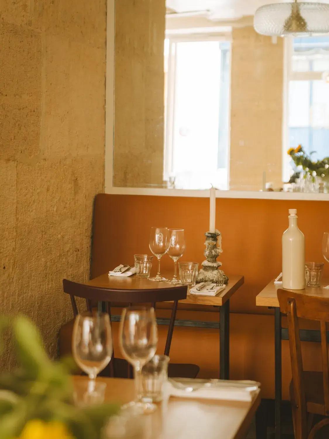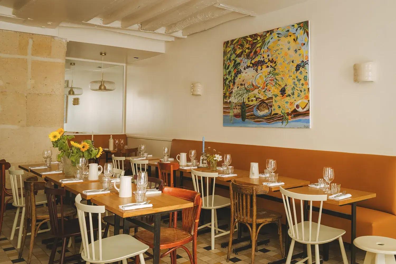 Интерьер дышит уютом: старинный кафель, деревянная стойка бара, банкетки в стиле 1950-х годов, масштабные полотна Джоанны Солаль и керамика. Атмосфера здесь напоминает обед в кругу друзей, за столом, за которым хочется задержаться.