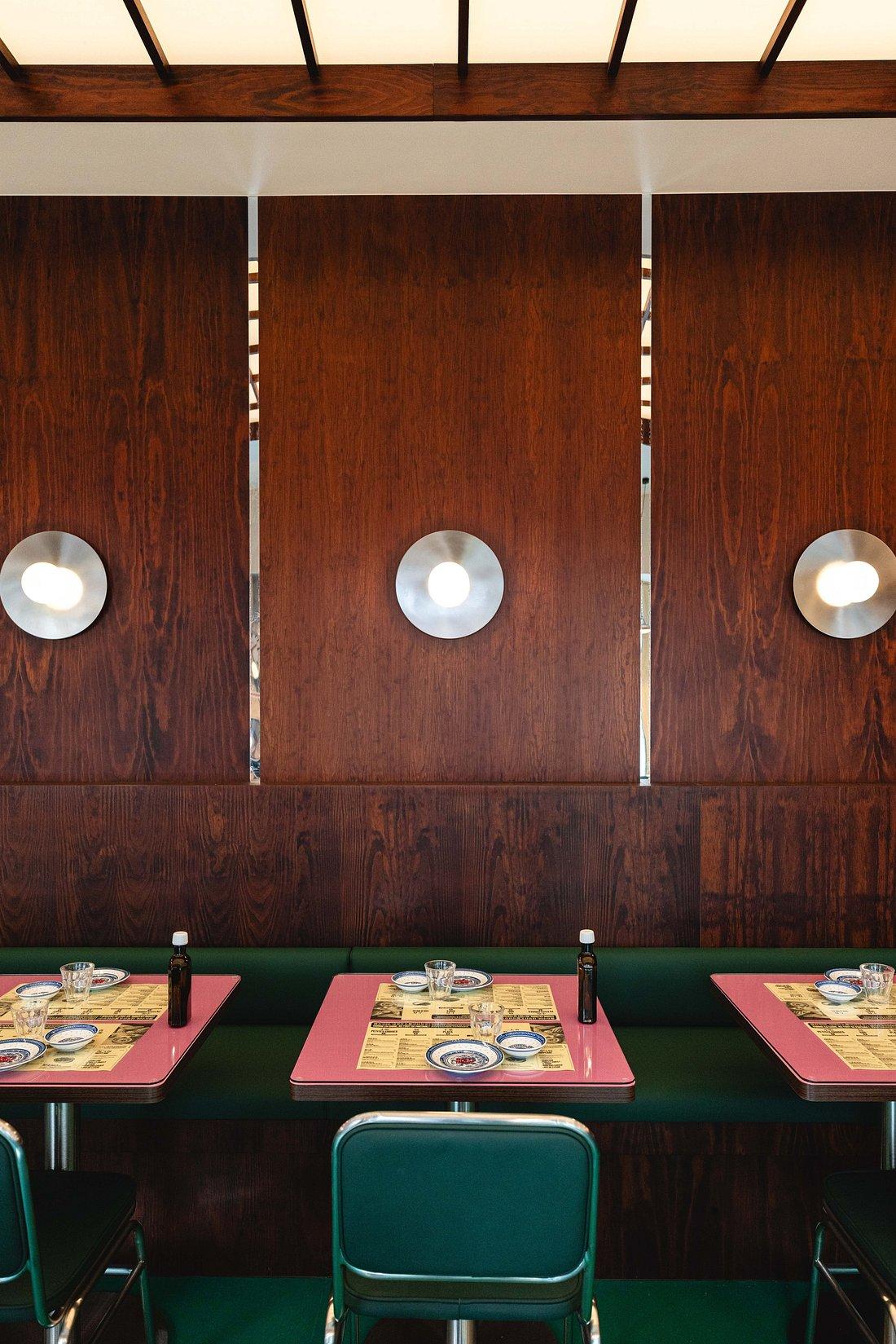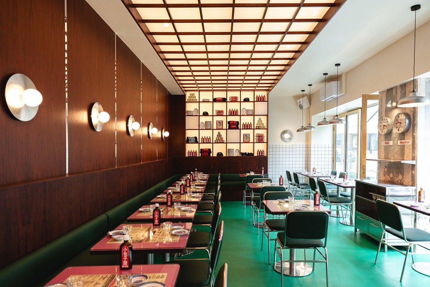 Пространство — это современная интерпретация китайской столовой с яркими и сочными акцентами: банкетки цвета хвои, фуксиевые столы, глянцевый белый кафель и лакированное дерево ореха. Центральным элементом стала монументальная потолочная лампа из деревянных панелей с ретро-подсветкой, отсылающая к традиционным чайным домикам.