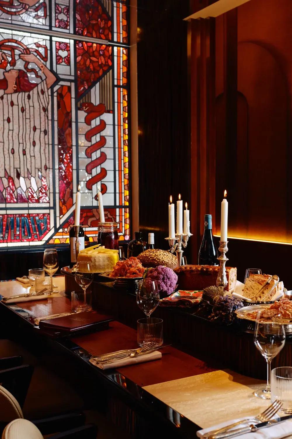Интерьер демонстрирует винтажную, почти кинематографичную элегантность: темное дерево, глубокие красные акценты, латунные детали. Ужин здесь однозначно пройдет в легкой и теплой атмосфере, располагающей к долгому вечеру.