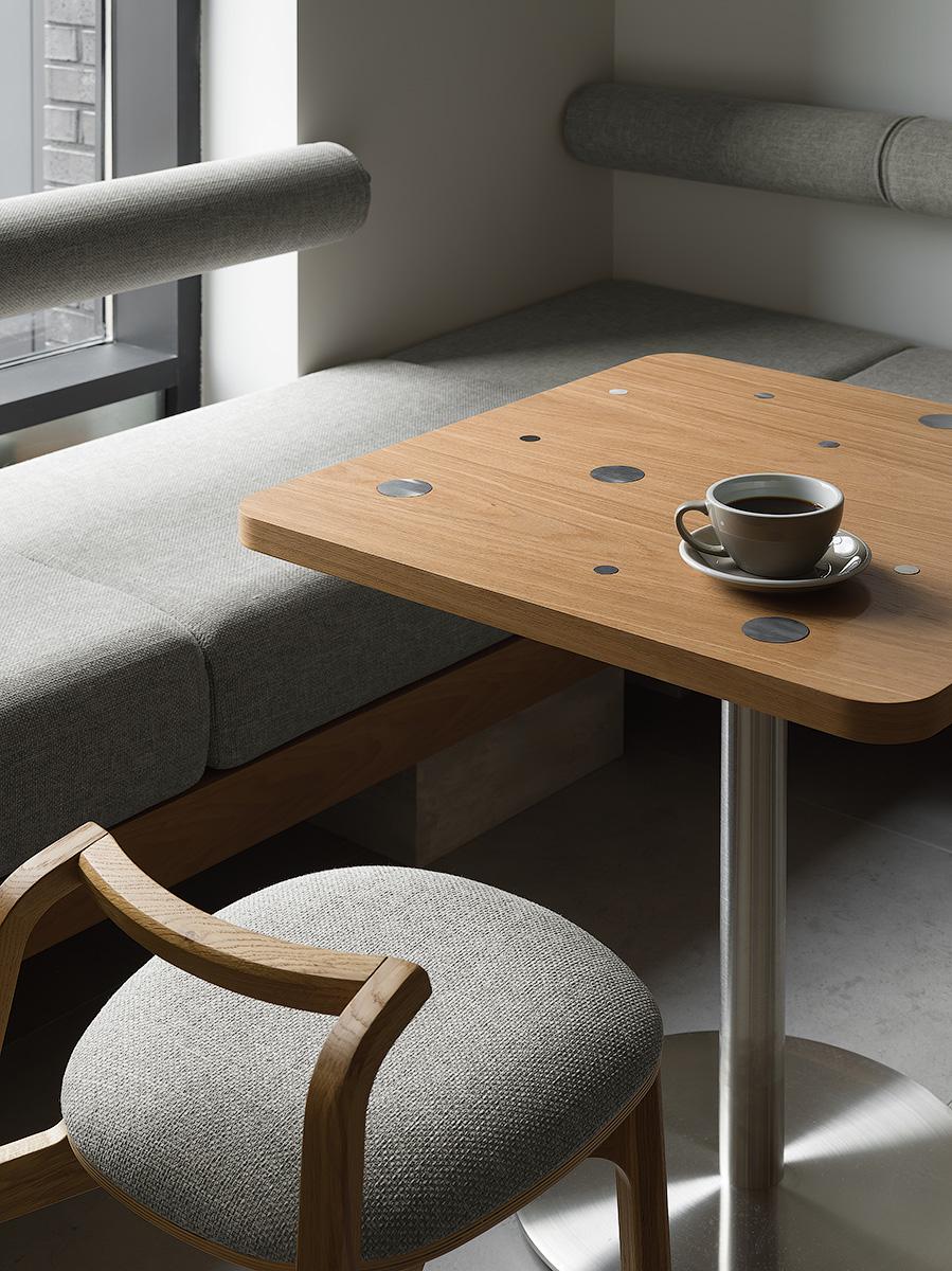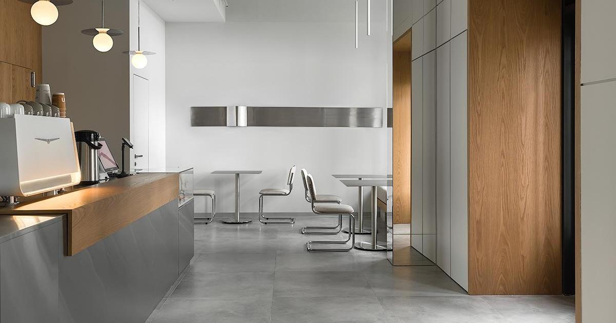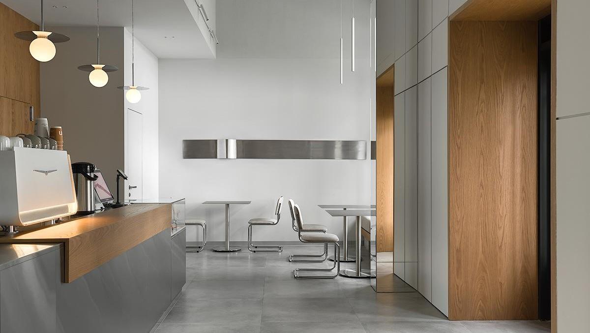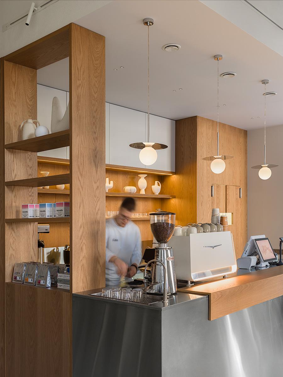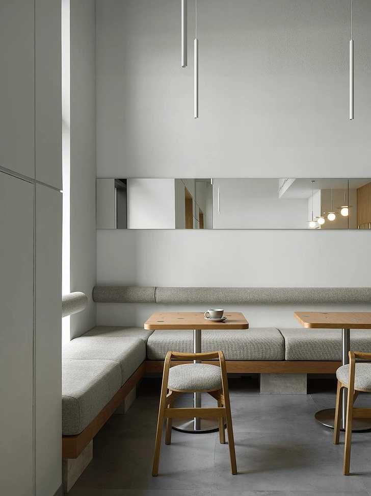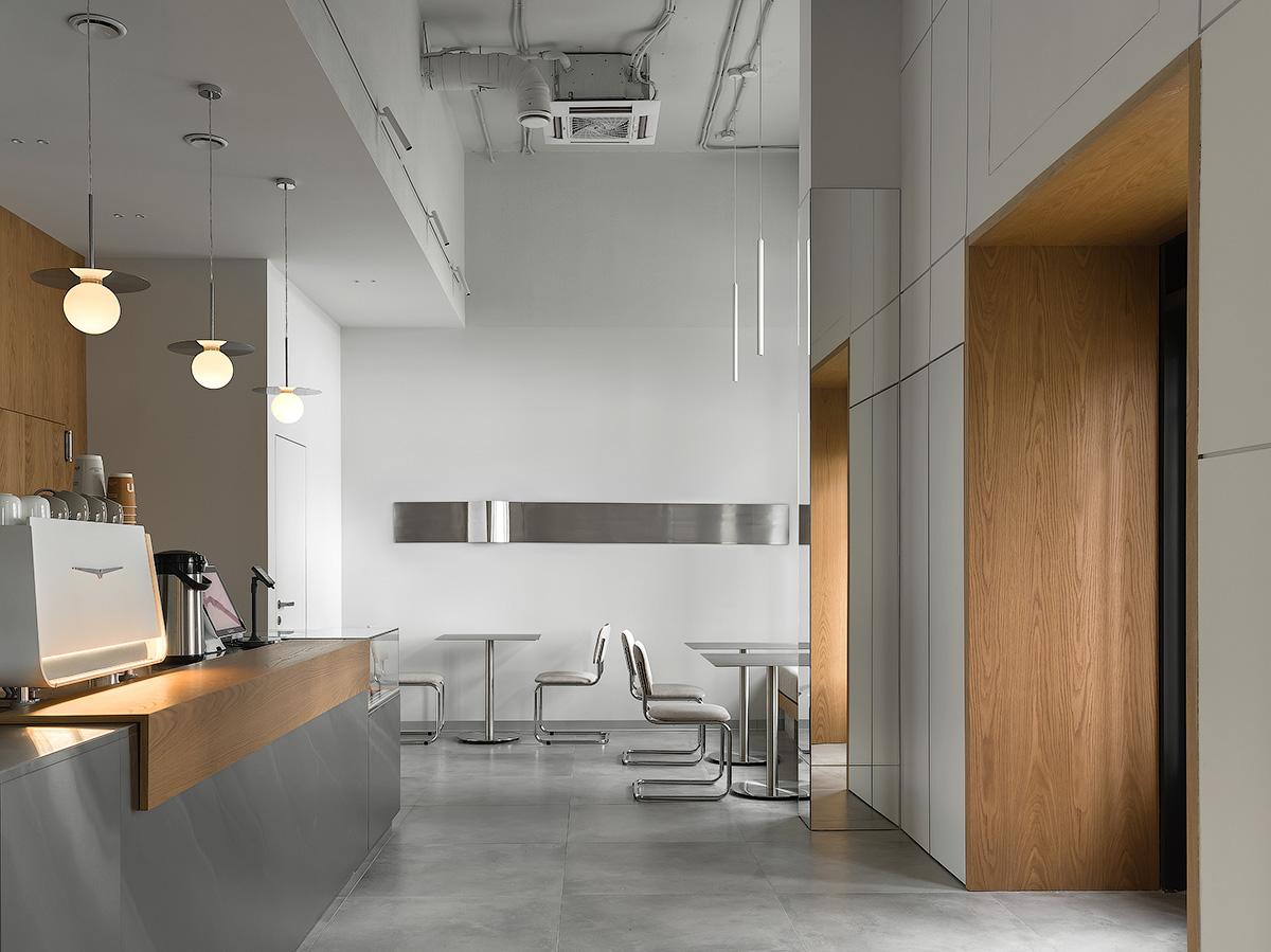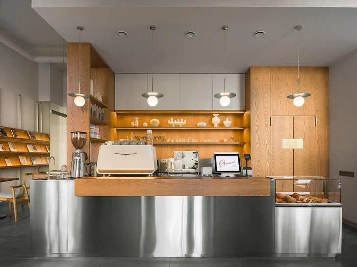 Кофейня занимает всего 60 м², поэтому планировка продумана максимально рационально. Здесь есть барная стойка, витрина-прилавок и зона посадки гостей. Пространство спроектировано без перегородок, чтобы сохранить визуальную легкость. Прямые линии, чистые поверхности и минимальное количество мебели помогли избежать ощущения загроможденности. Естественное и искусственное освещение распределено так, чтобы подчеркивать зоны барной стойки и столиков, создавая сбалансированный световой ритм.