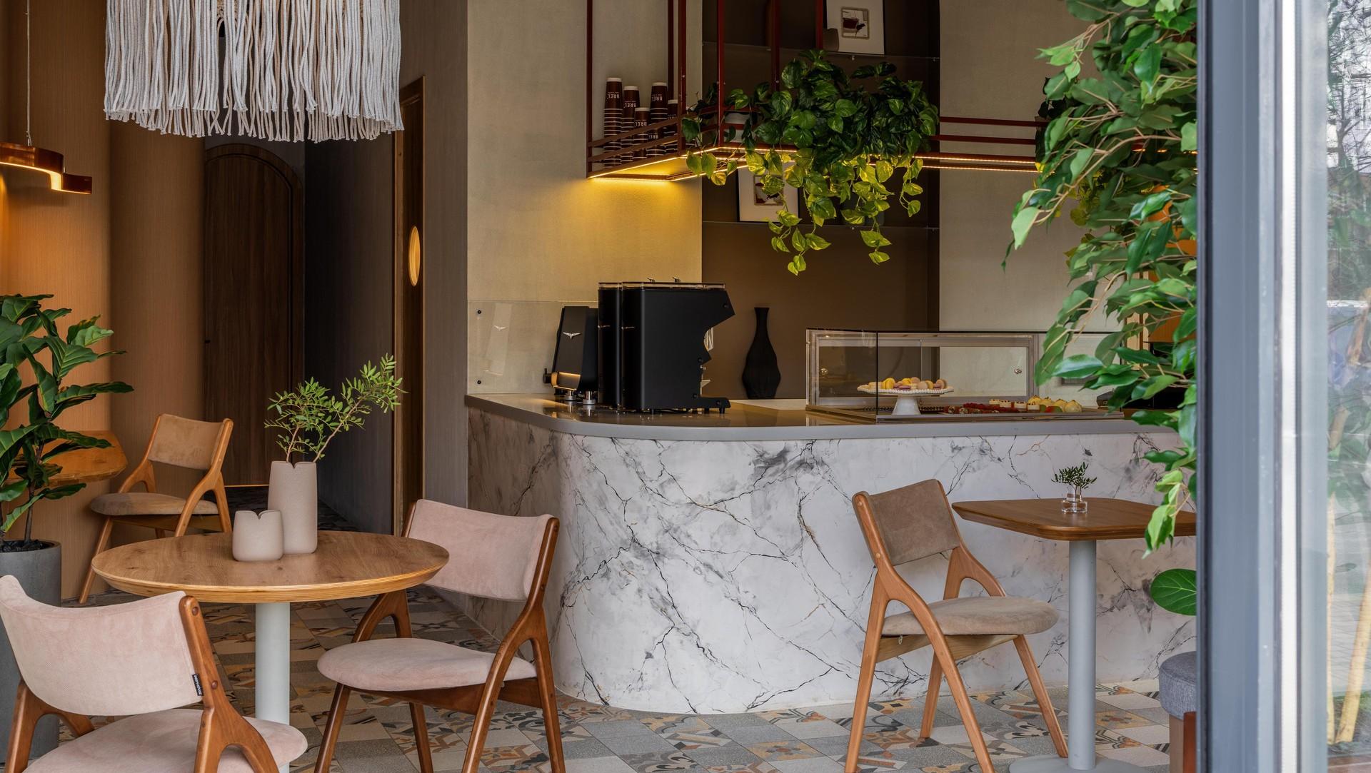 «Основная идея этой кофейни — современное уютное пространство с добавлением акцентов, с узорчатой плиткой на полу, геометрией открытой вентиляции и необычным большим абажуром в технике макраме, который привлекает к себе внимание на входе. Самый необычный элемент в интерьере — 4,5 метровая волнообразная деревянная стена и медный линейный волнистый светильник, который повторяет контуры стены, его дизайн разработала наша студия», — рассказывает дизайнер и основатель студии Wow Buro Дина Теодорович.