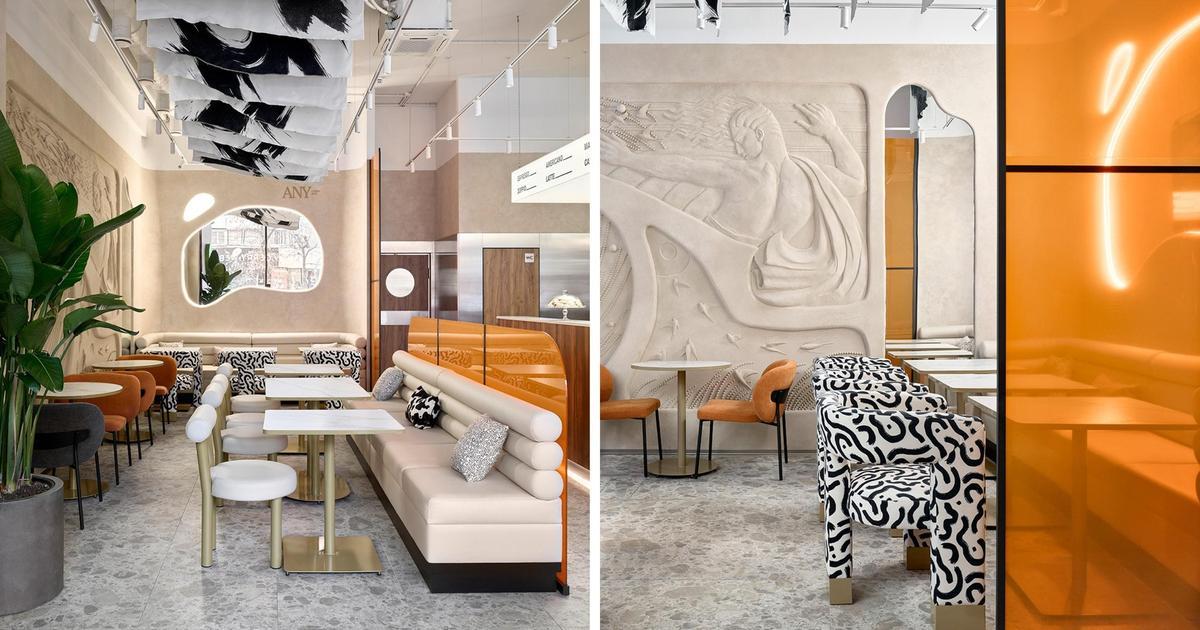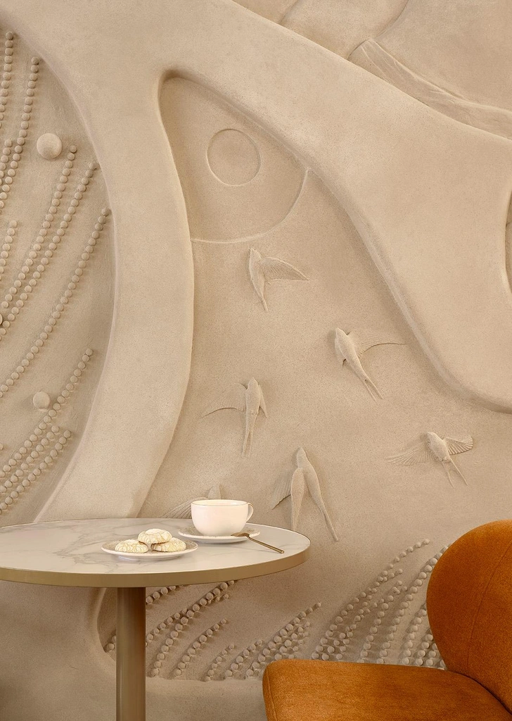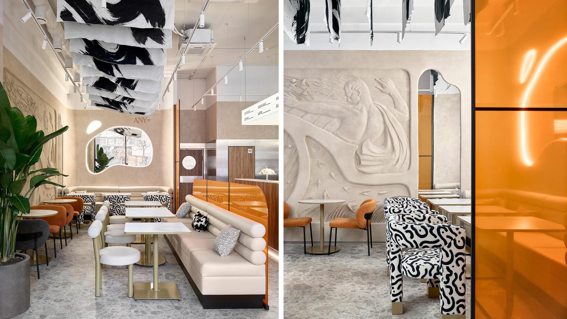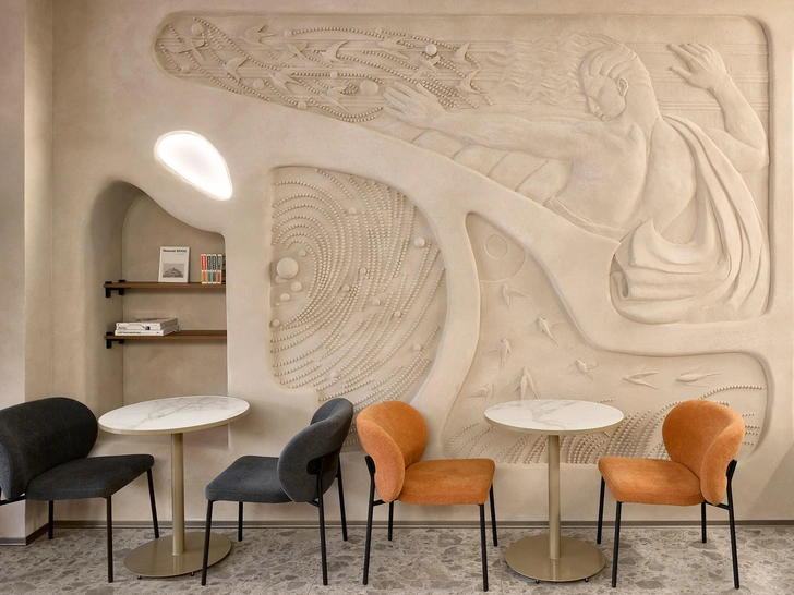 На центральной стене мы создали крупный барельеф с фигурой атлета — это не просто украшение, а символ здорового образа жизни: в кофейне фитнес-меню. Кроме того, большое внимание мы уделили фактурам и материалам: дерево теплого оттенка, каменный пол с эффектом терраццо, матовые и глянцевые поверхности, плотный текстиль и рельефные стены.