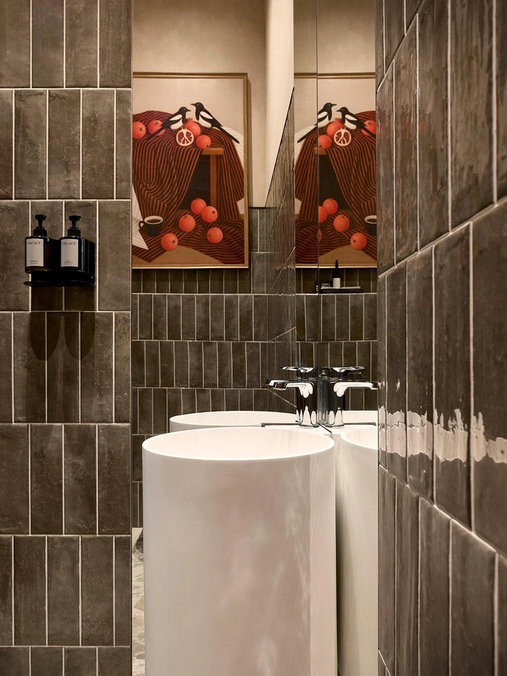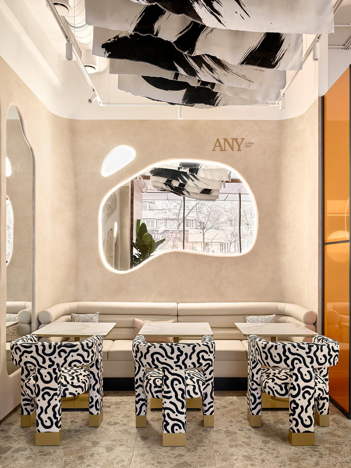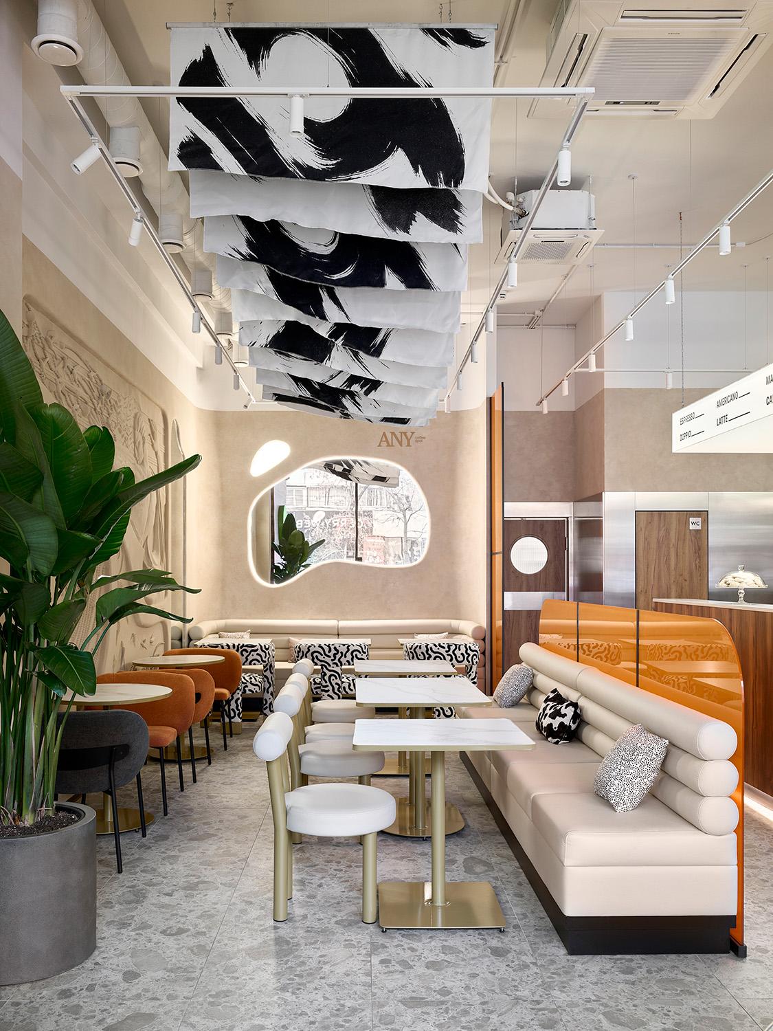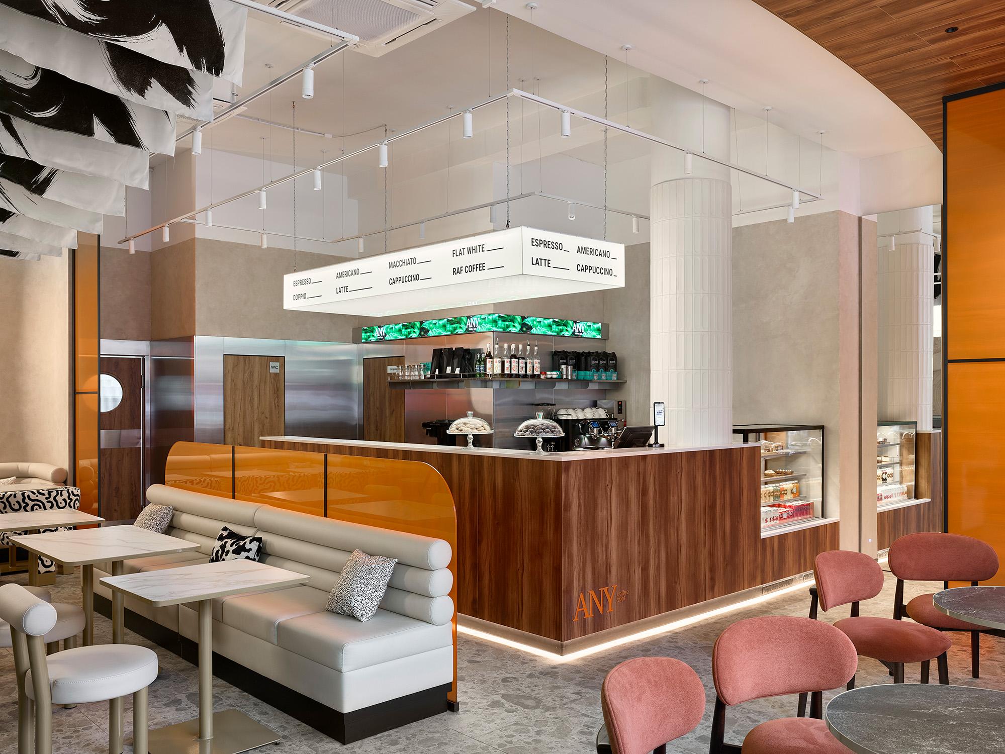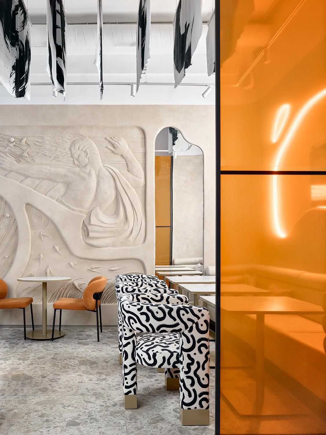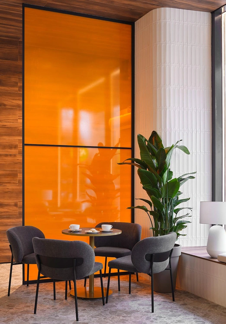 Чтобы интерьер не потерял выразительность, мы ввели яркие, но точечные цветовые акценты: полупрозрачные панели теплого оранжевого оттенка, мягкие коралловые и графитовые кресла. Они добавляют энергии и динамики, не нарушая спокойной атмосферы, и тонко зонируют пространство, создавая разные сценарии посадки. Именно эта многослойность делает интерьер насыщенным и «живым», но при этом не перегруженным.