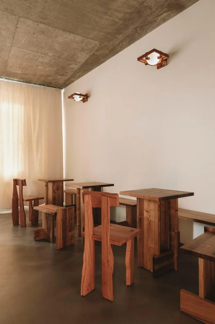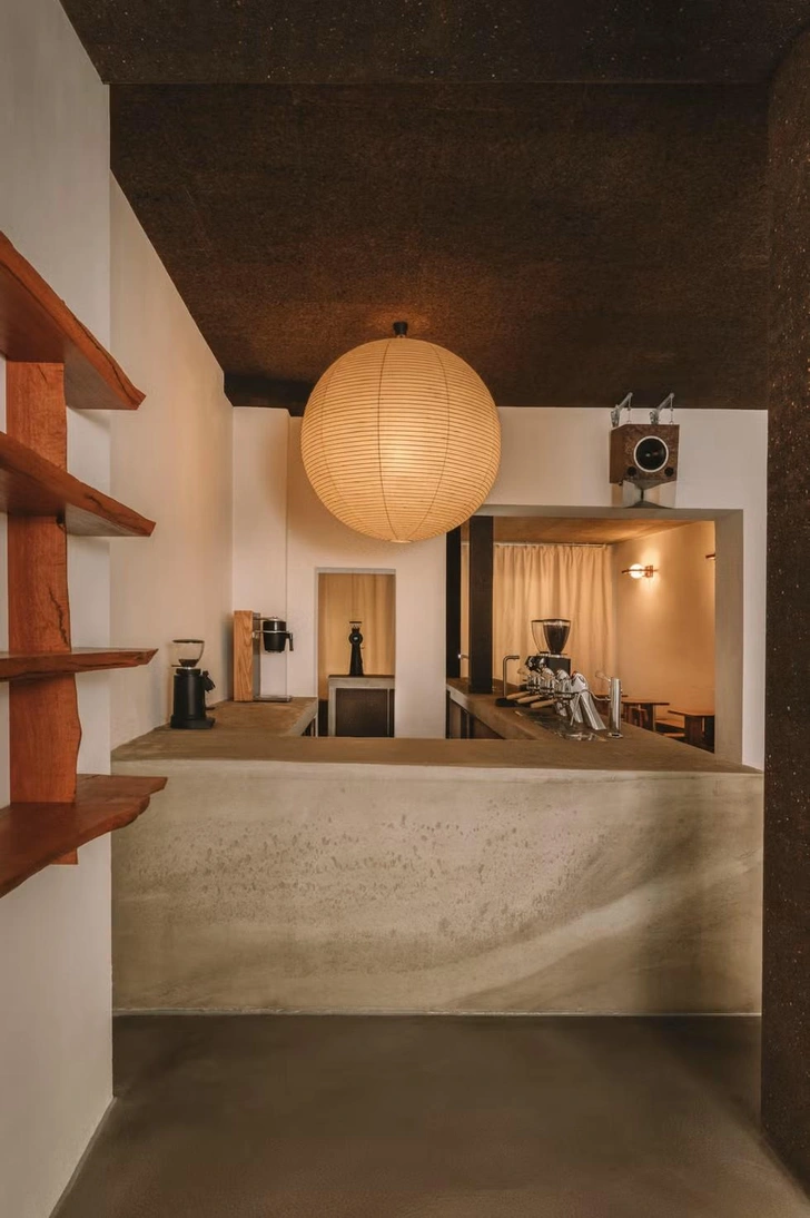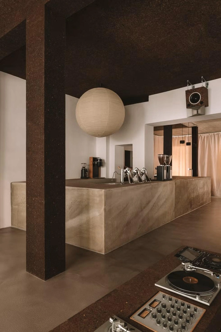 Интерьер сознательно сделан простым и лаконичным, чтобы ничто не отвлекало внимание. Центральным элементом стал массивная стойка из необработанного бетона — одновременно скульптура и функциональный центр зала. В нее встроена хромированная кофе-машина Modbar, чей лаконичный дизайн не перегружает пространство и подчеркивает фактуру бетона.