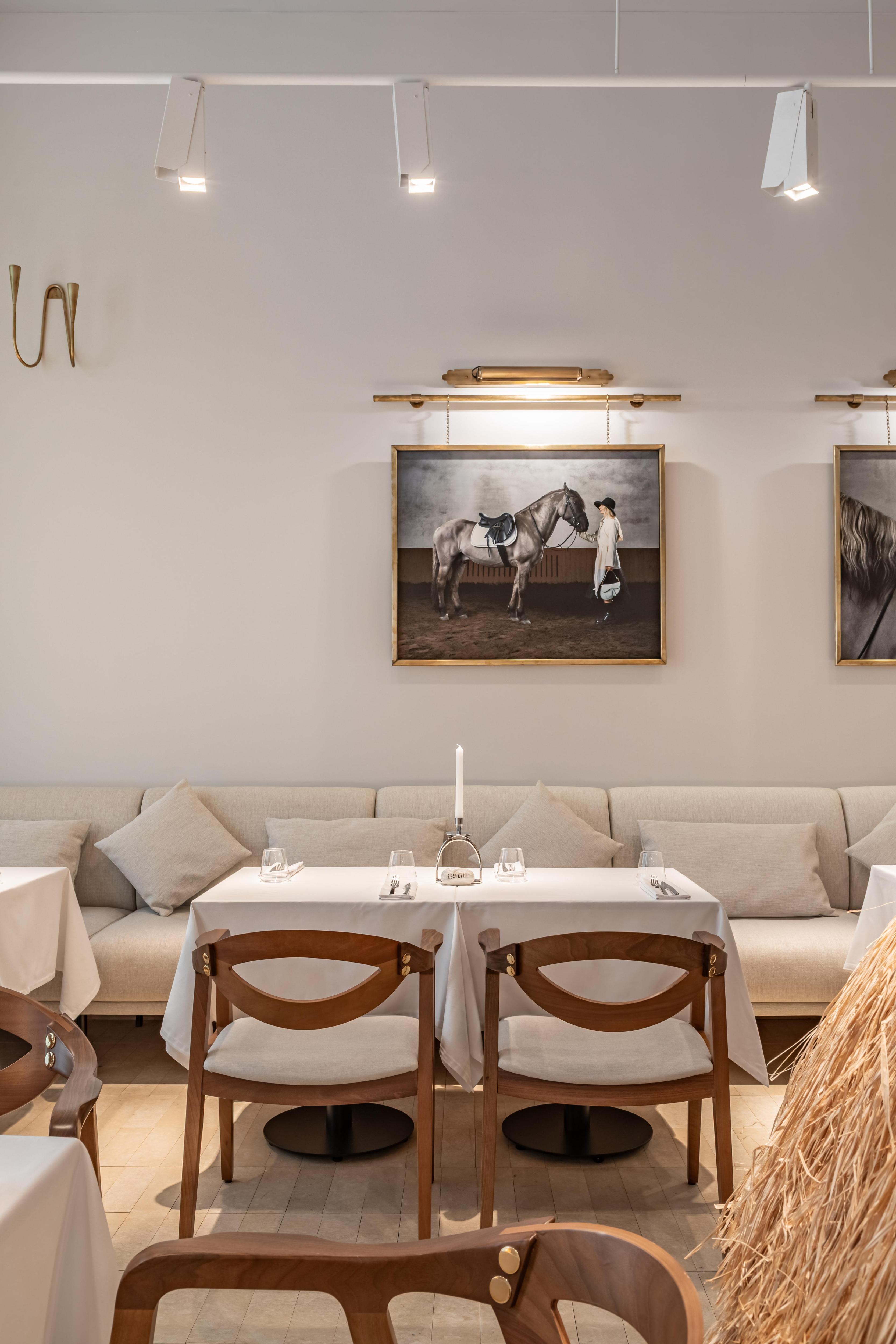 Теперь плавно переходим во второй зал, обеденный. Светлые тона, белый и дерево, интересные светильники — один их них, например, в форме стремени. Стены украшают фотографии лошади в стиле модного fashion-фотографа Ивана Рудыка. Это, кстати, лошадь хозяев. Особенно выделяется и станция официантов, она находится в центре — ее декорировали так, чтобы она напоминала копну сена.