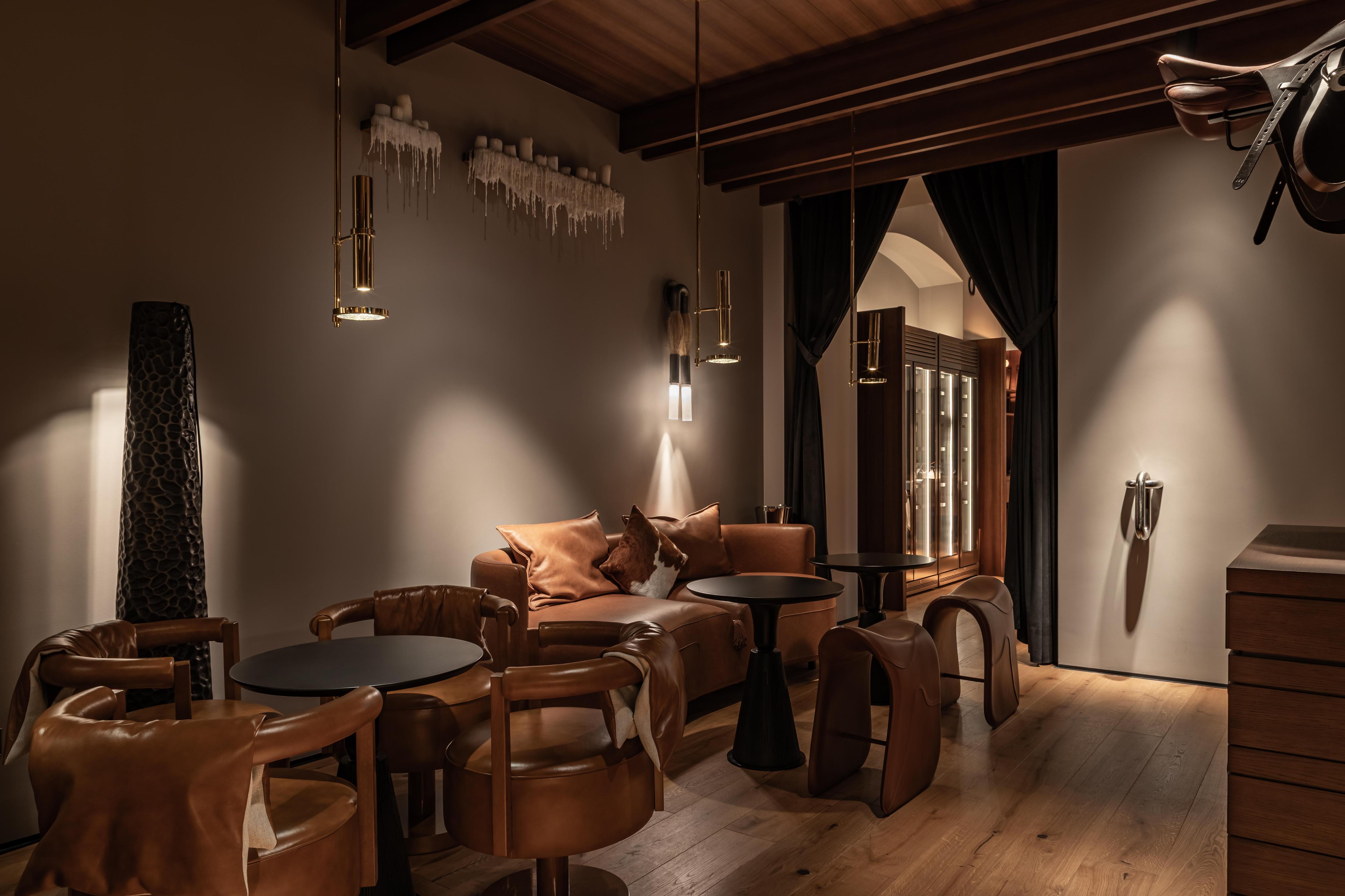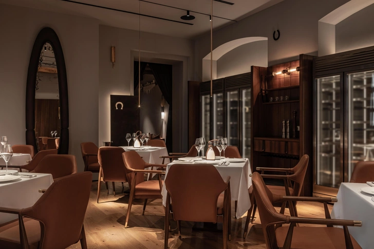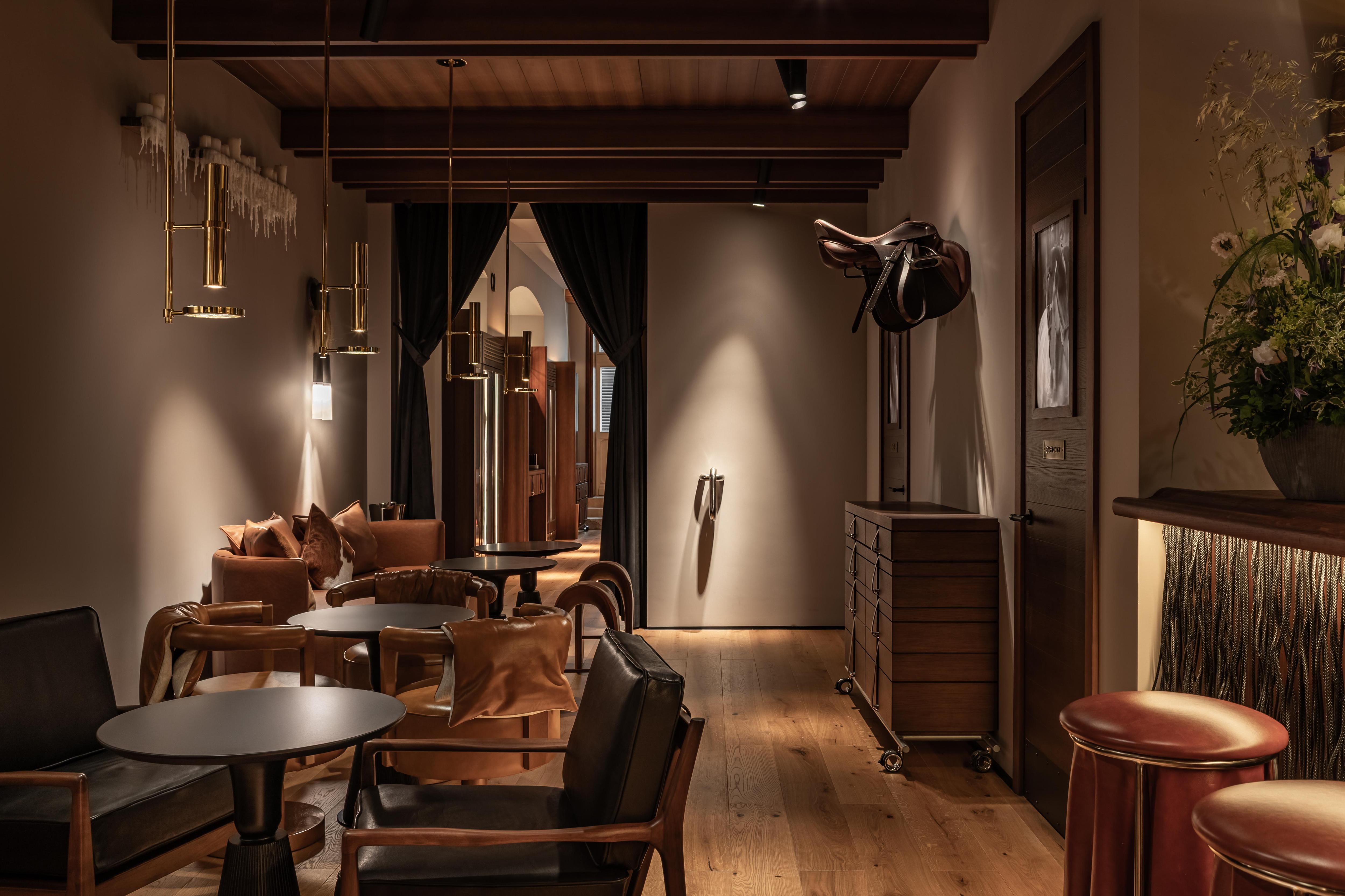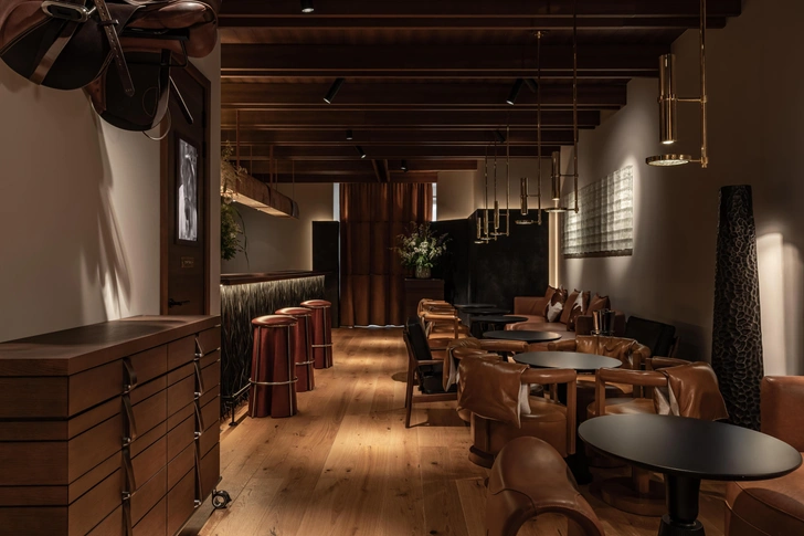 В баре и зале — уже темная гамма и камерная атмосфера, приглушенное освещение. Они отличаются от предыдущих залов. Здесь есть другие интересные детали: подковы, стулья в виде седла, мягкие кресла и диваны, отделанные седельной кожей. А с потолка свисает настоящее конкурное седло!