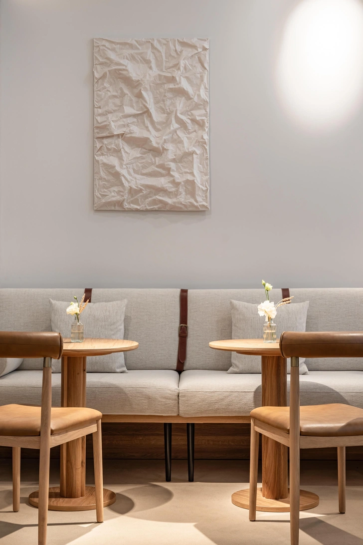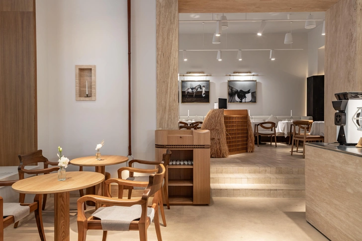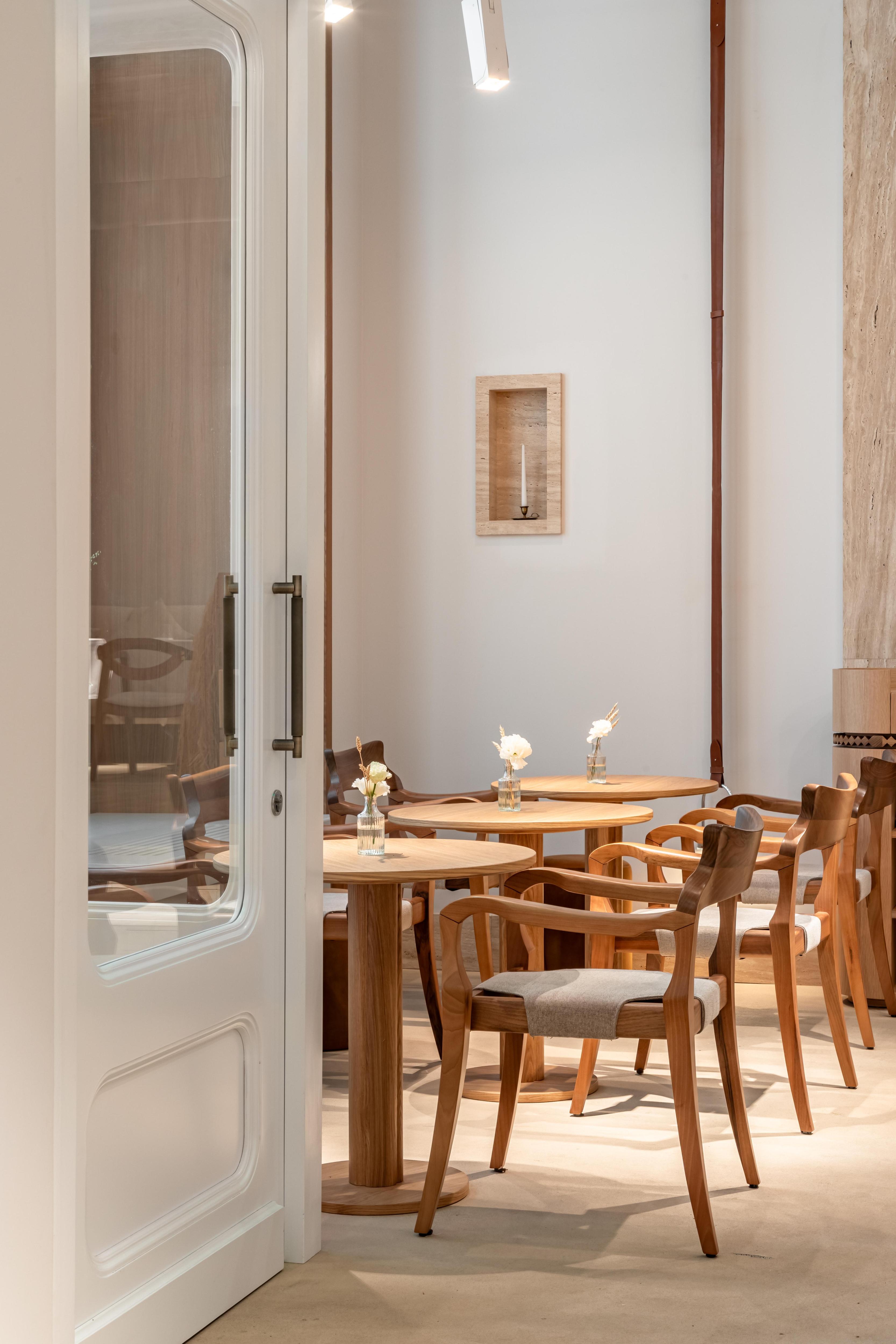 На каждом столе — белая скатерть и изящный подсвечник. Деревянная мебель здесь легкая, не массивная, вместе с деталями из нержавеющей стали она придает интерьеру винтажное настроение. К тому же, мы восстановили по фрагментам серо-голубой потолок с лепниной. А на полу выложили травертин в раскладке под брусчатку, но в современной интерпретации. Слэбы травертина можно увидеть и в кондитерской витрине.