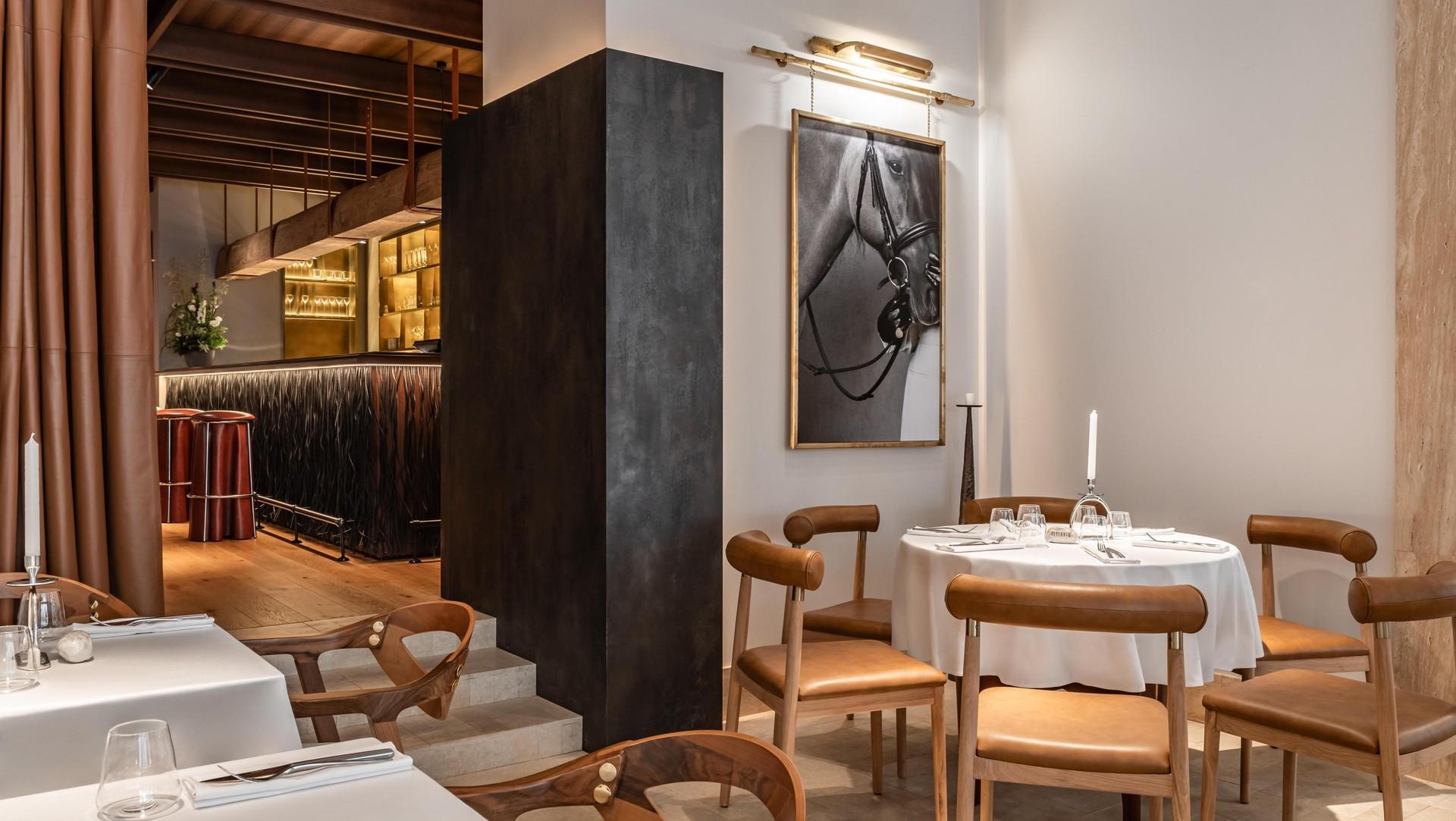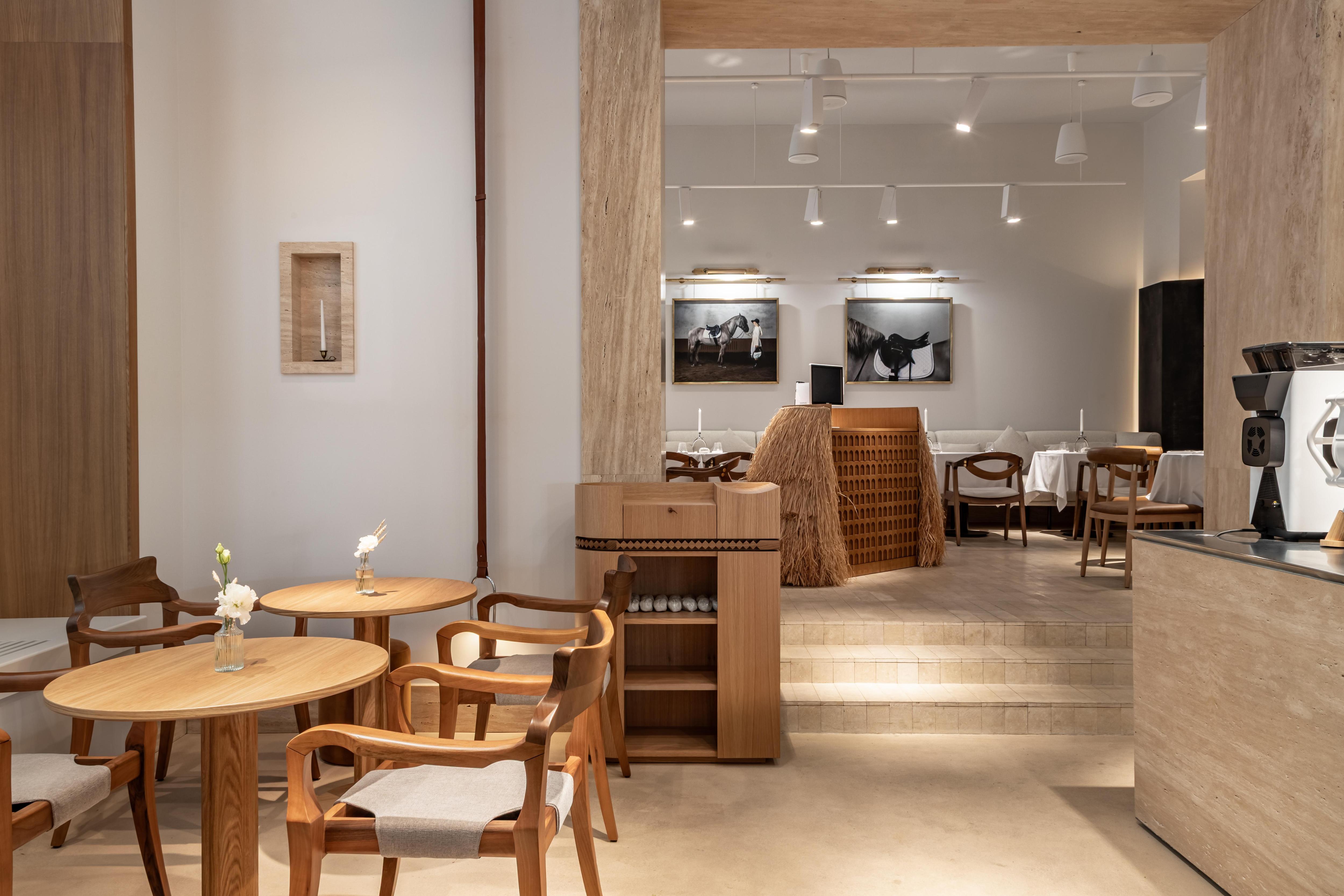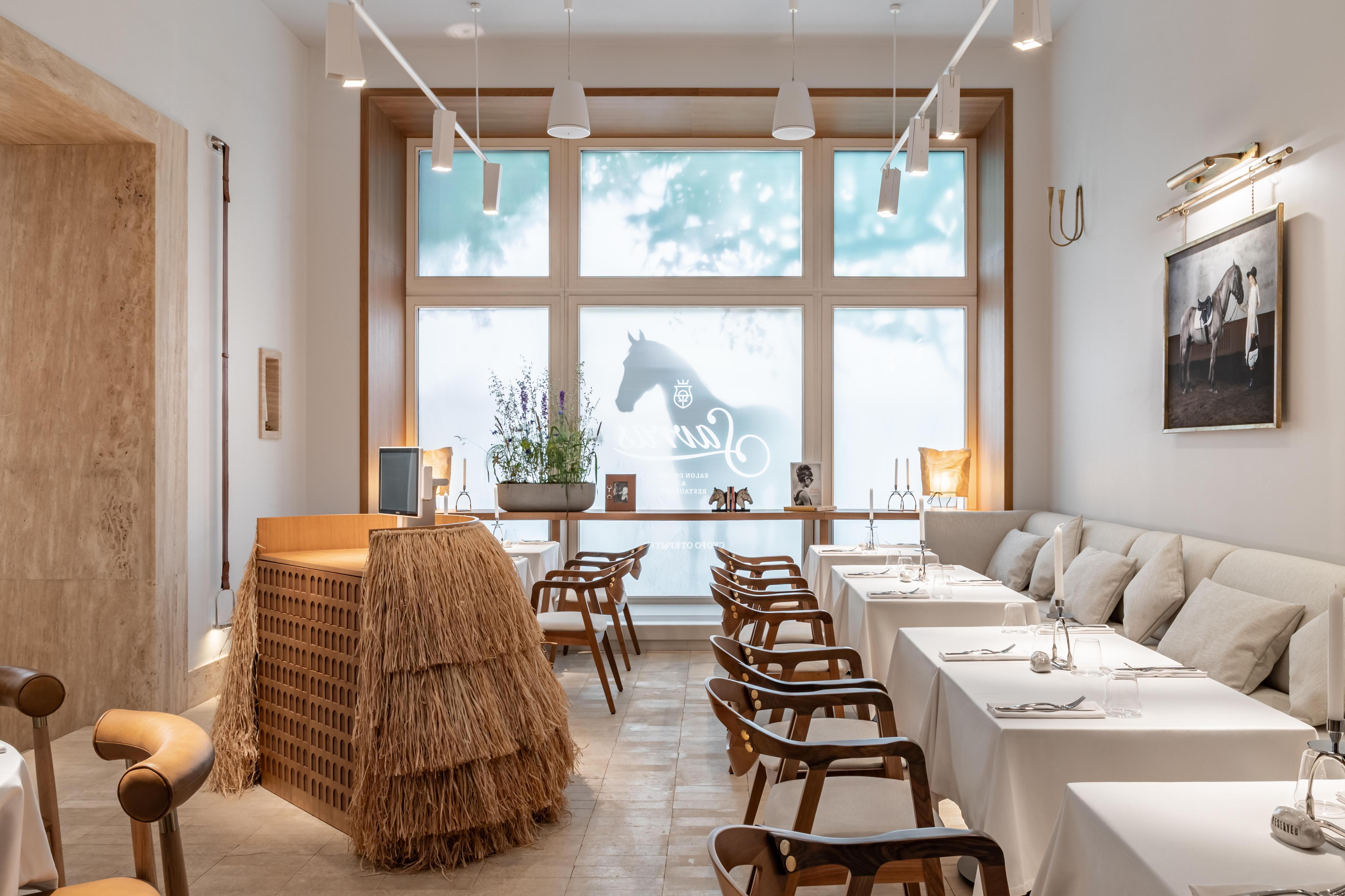 Всего в ресторане четыре зала, и в каждом из них — свое настроение. «Конная» тема развивается постепенно, и полностью раскрывается в двух дальних залах. Сначала посетитель заходит в светлое пространство — благодаря панорамным окнам здесь много солнца. Первый зал напоминает французское кафе, он делится на две части: кондитерская-«библиотека», где прямо в зал мы вынесли «сладкий» цех, и элегантная брассери с изящными этажерками в стиле high tea.