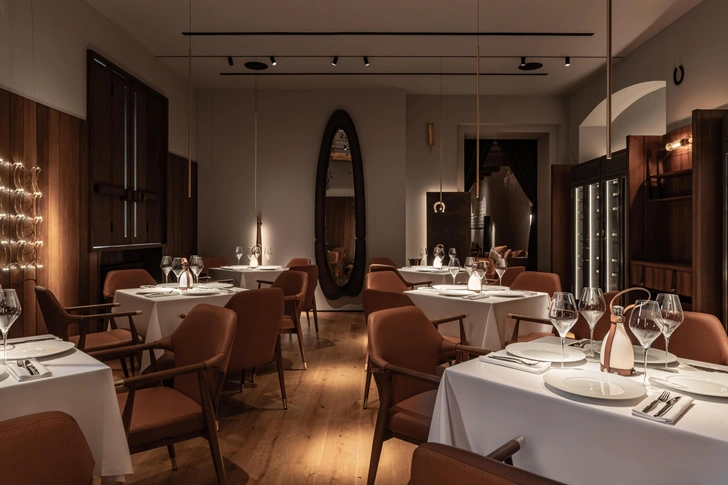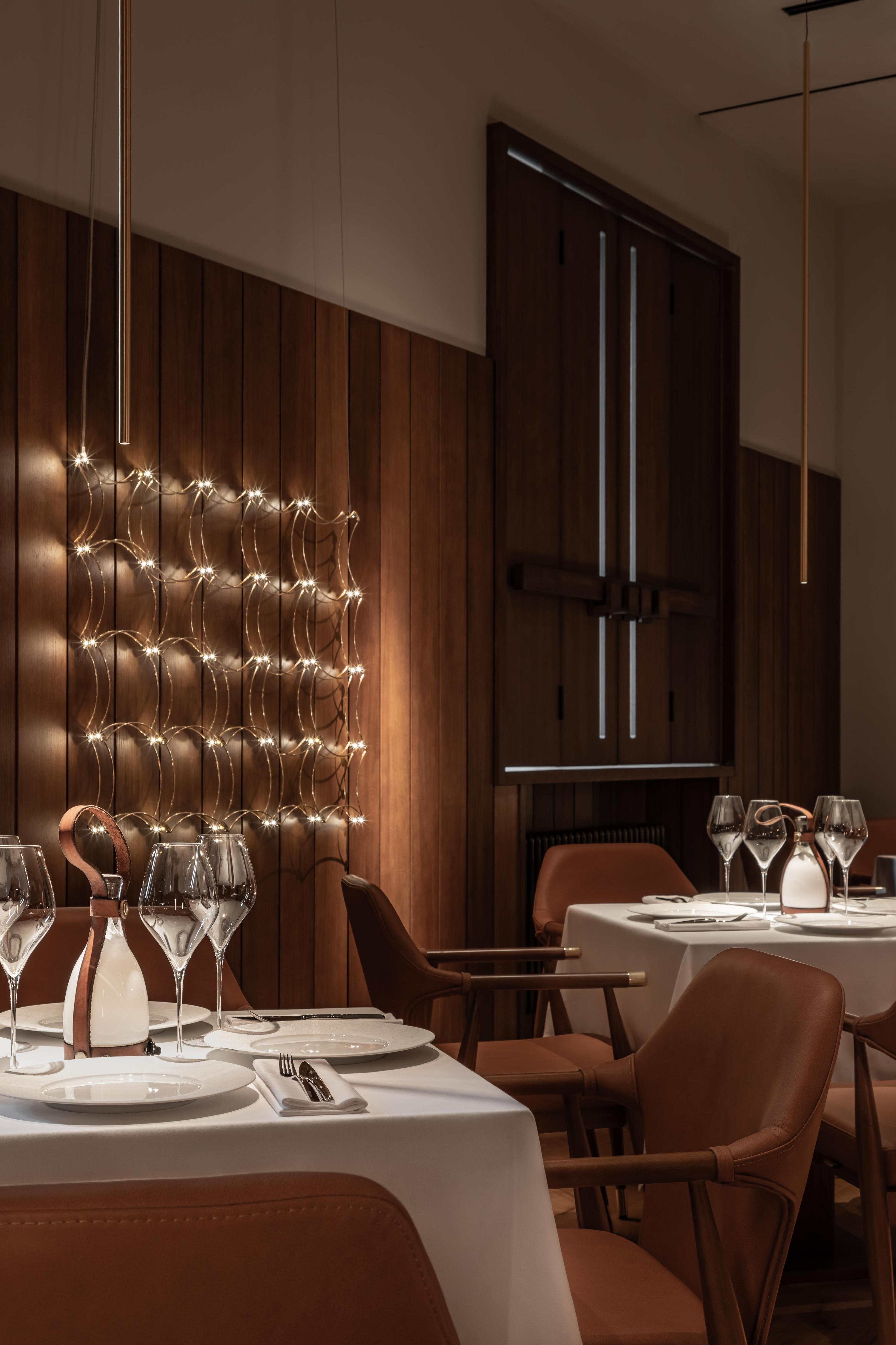 У потолка и стен приятная деревянная фактура: они отделаны шпоном экзотического дерева этимое, оно известно своим природным красно-коричневым оттенком. Он напоминает старые доски в конюшнях и при этом выглядит очень благородно. Винные шкафы, станции официантов, ставни, светильники, мы оформили в таком же экологичном стиле — все сделано по нашим чертежам.