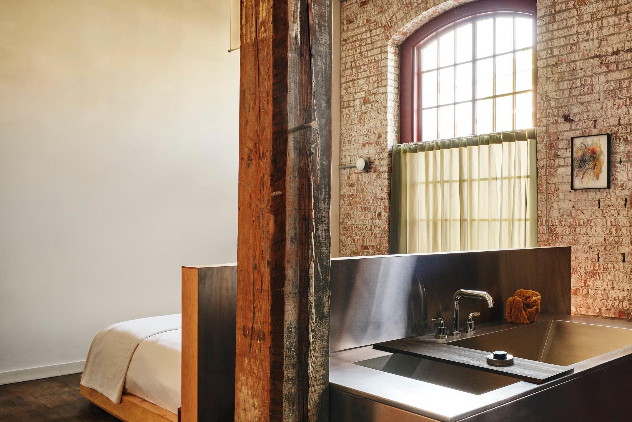 Первым шагом стала масштабная реконструкция внутреннего пространства. Однако дизайнеры намеренно сохранили арочные окна и ряд колонн, которые диктовали расположение общественных мест и размер комнат для гостей.