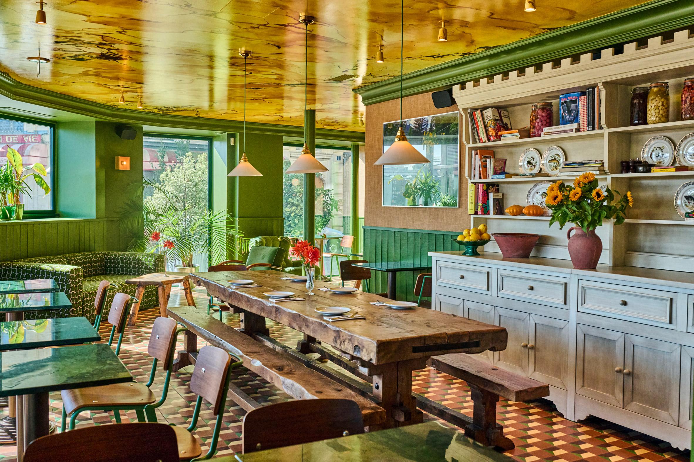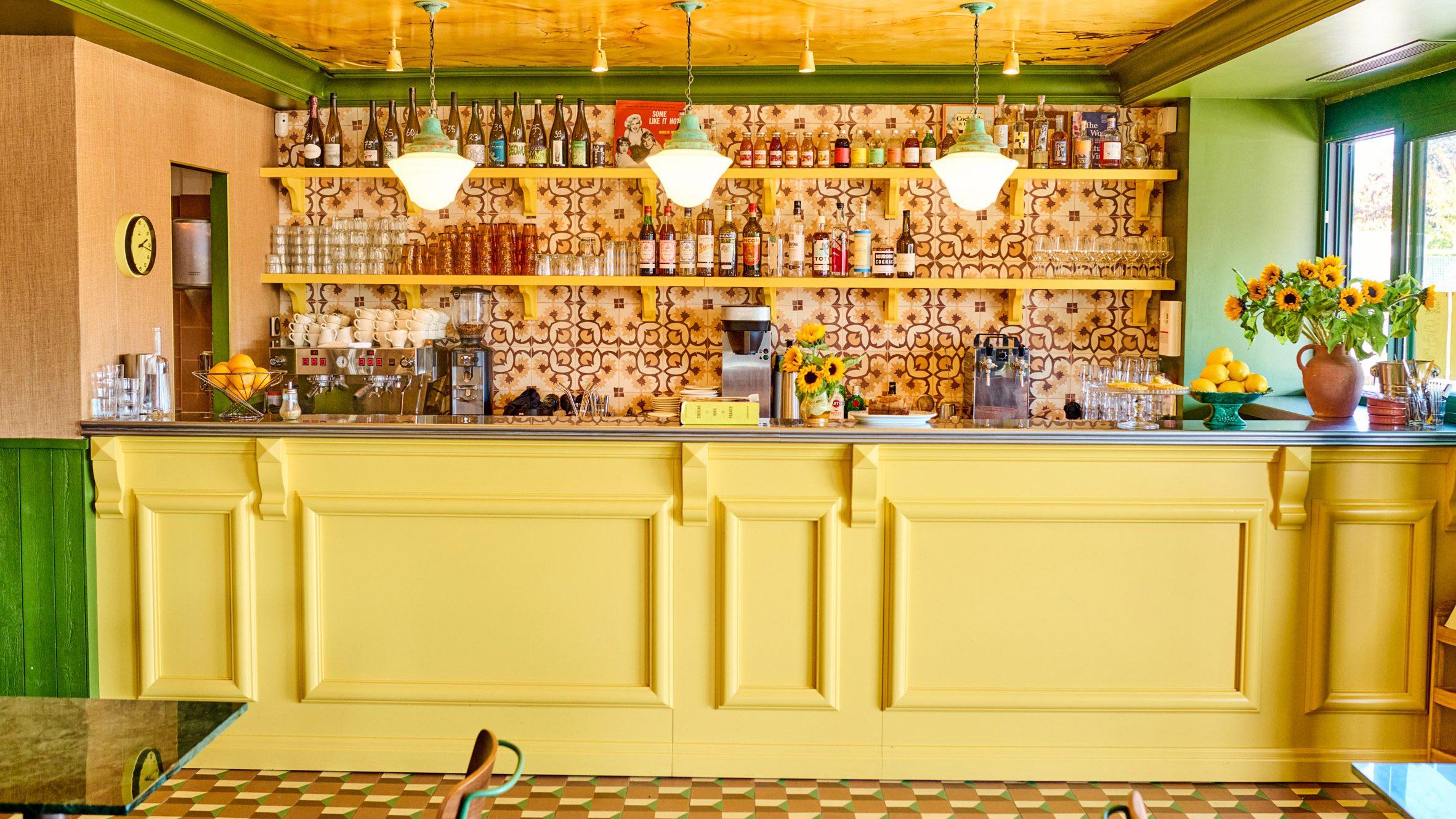 Люк всегда любил эклектику — в этот раз он смешал английский и французский стиль. И, конечно, добавил от себя несколько необычных деталей: например, обои из мешковины и потолок под желтый мрамор, его расписала художница Полин Лейраво. Люк улыбается: «Мне нравится обман зрения. Зачем использовать настоящий мрамор, если можно добиться более смелого эффекта красками? Нужно делать что-то неожиданное, необычное и, конечно же, веселое». С желтым потолком рифмуется барная стойка цвета сливочного масла, а ритмичный контраст создает геометрический узор на полу с зелеными, коричневыми и желтыми тонами.