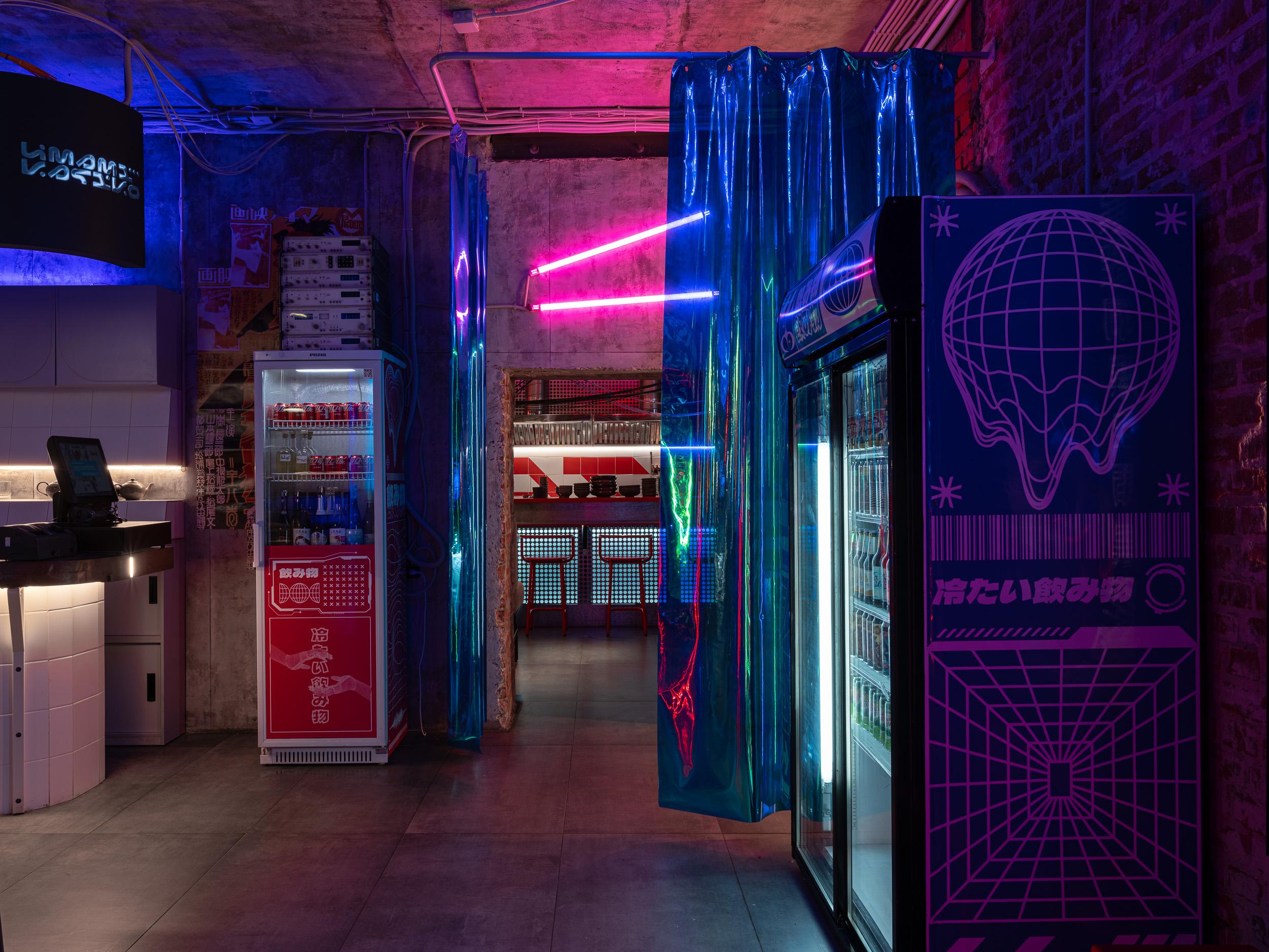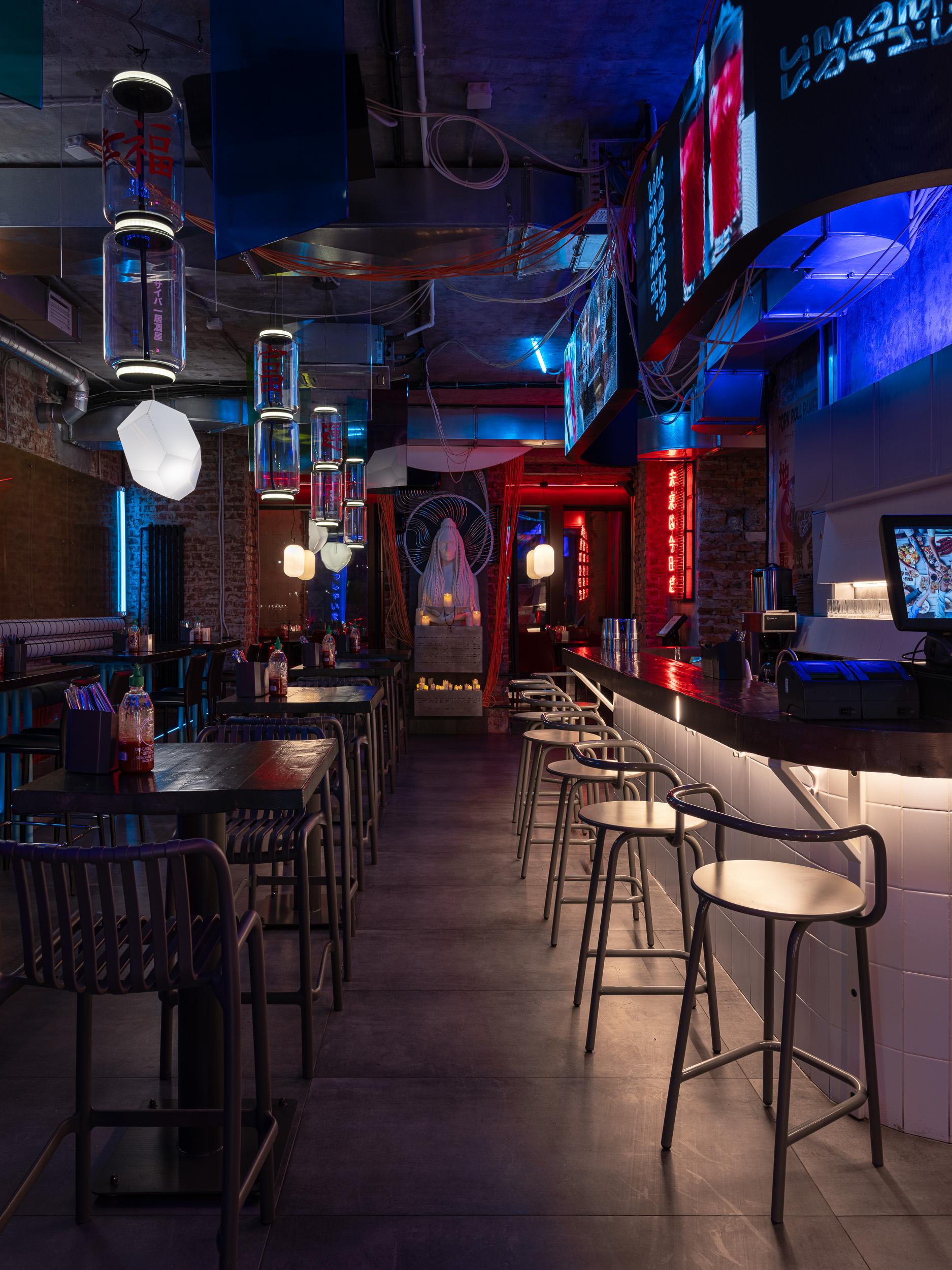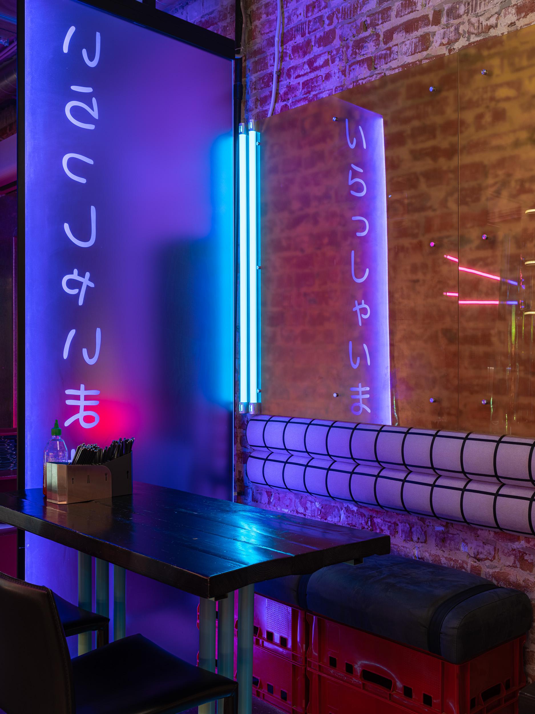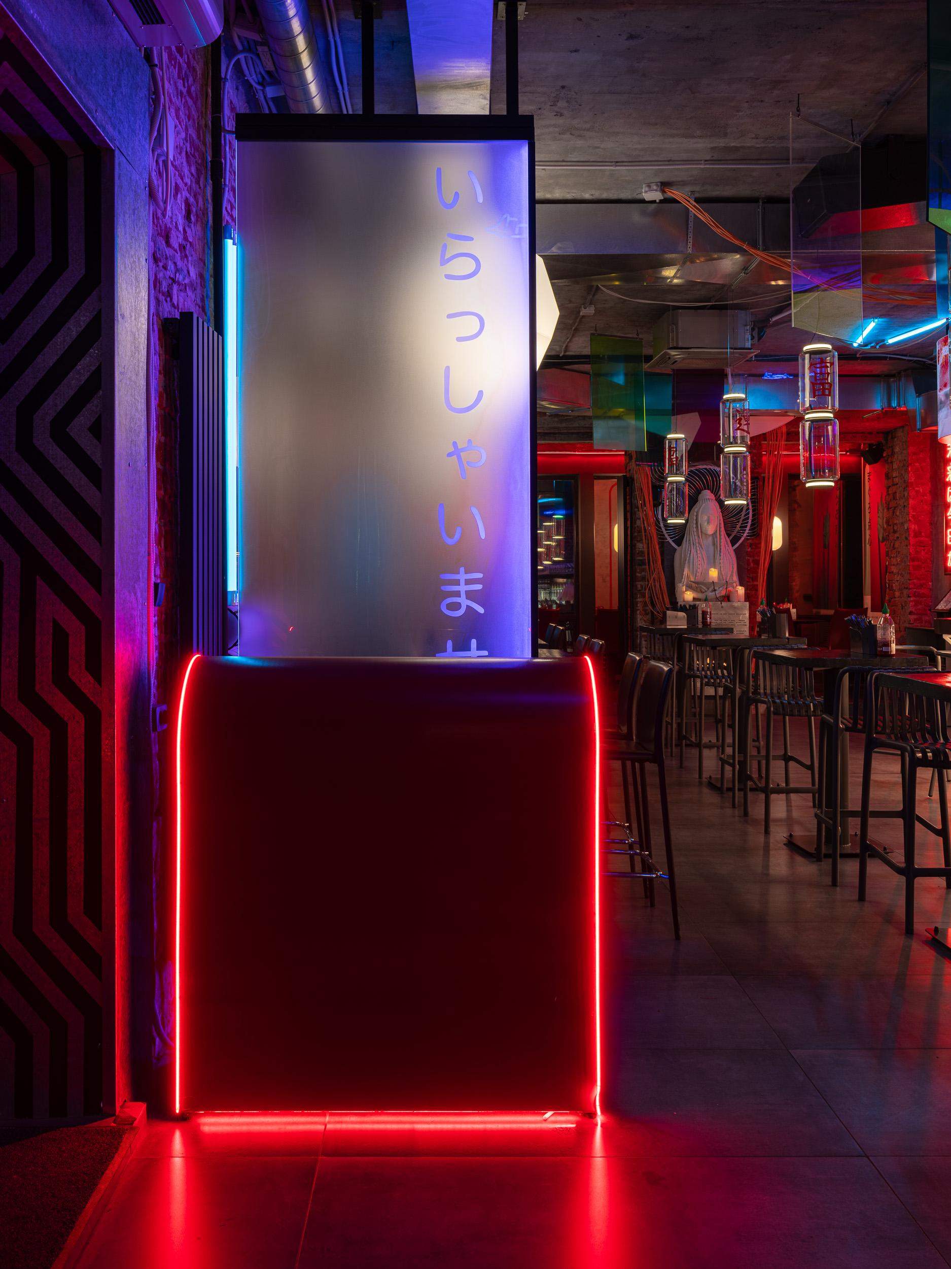 Стиль интерьера нового кафе можно назвать кибер-Азия. Хотелось создать образ города будущего — имитацию того, что гость находится не в помещении, а где-то между домами, среди проводов, граффити и старых кондиционеров. Эффект усиливает неоновая цветовая гамма.