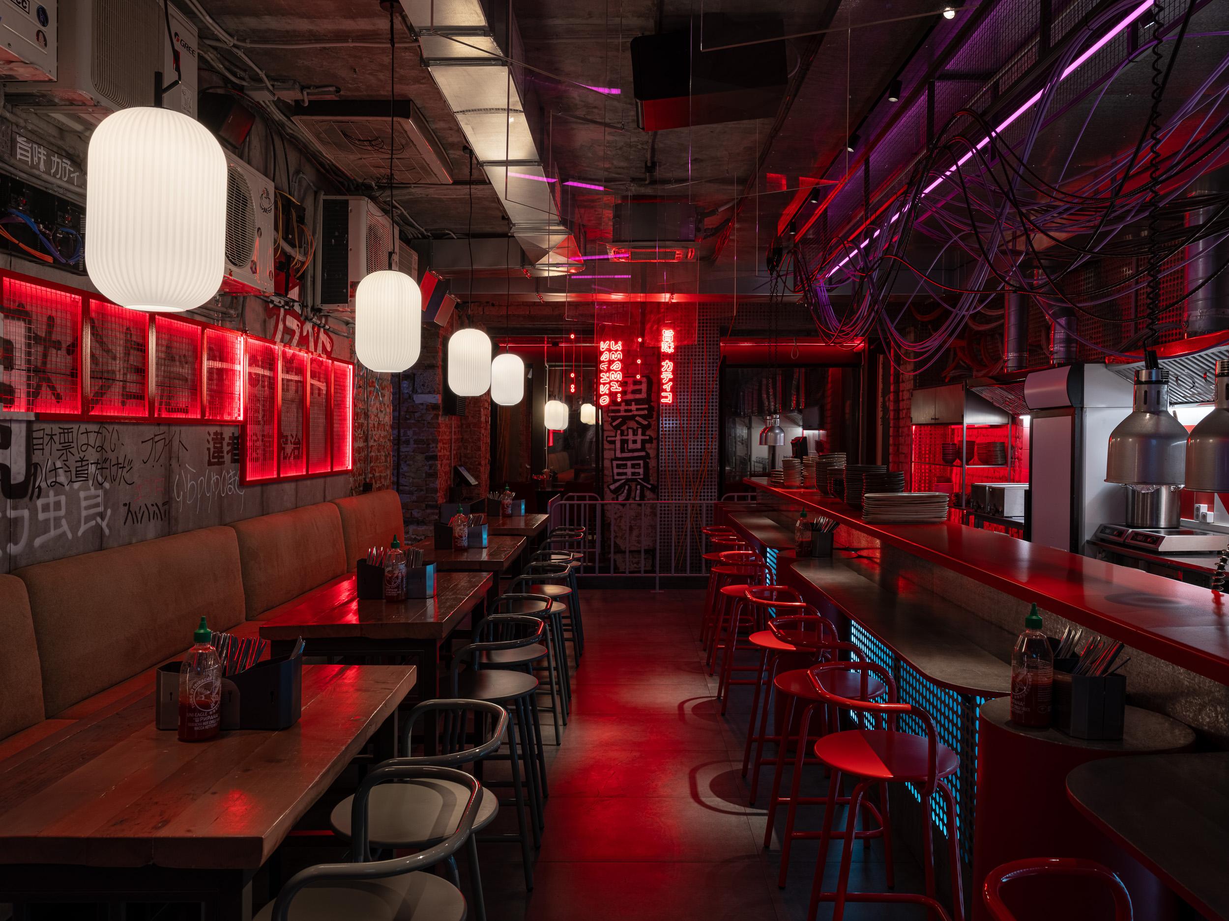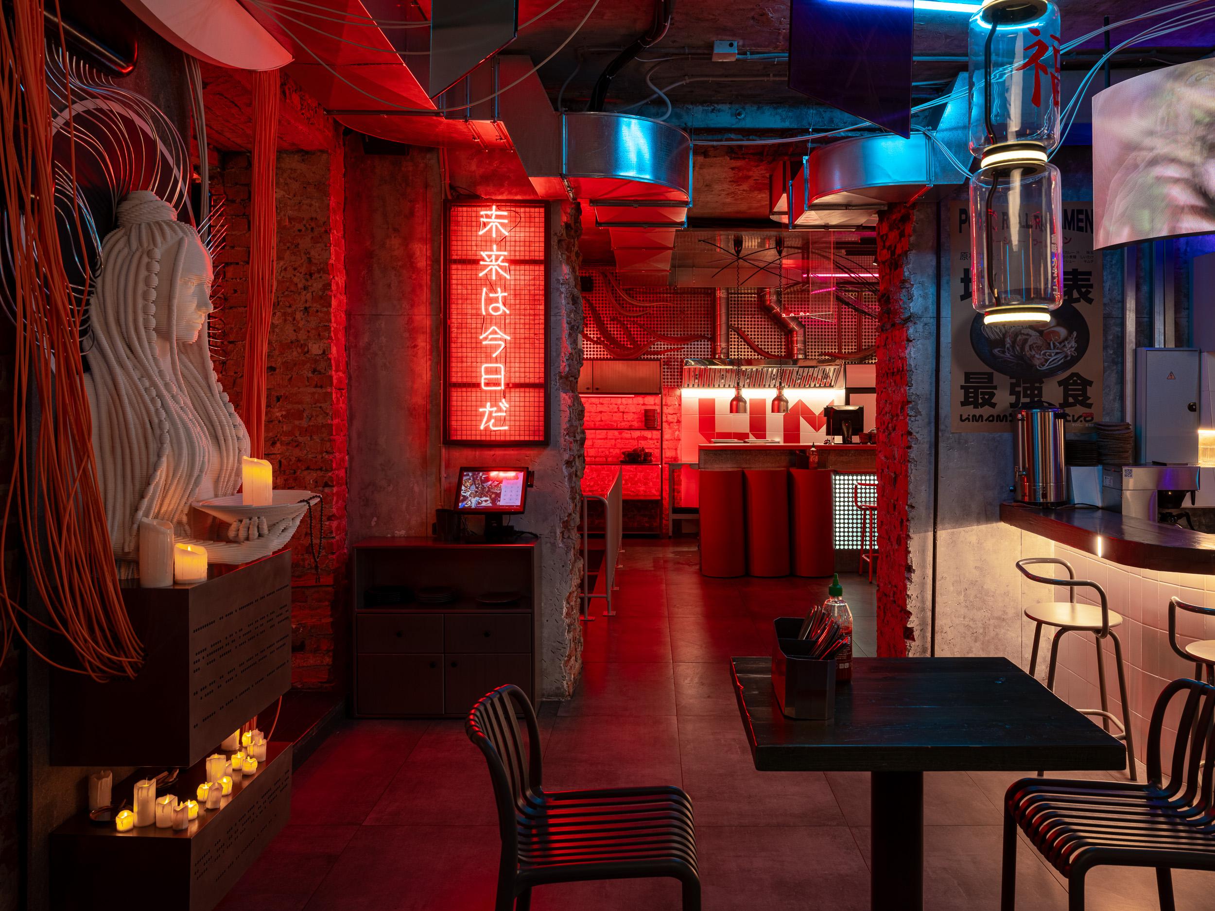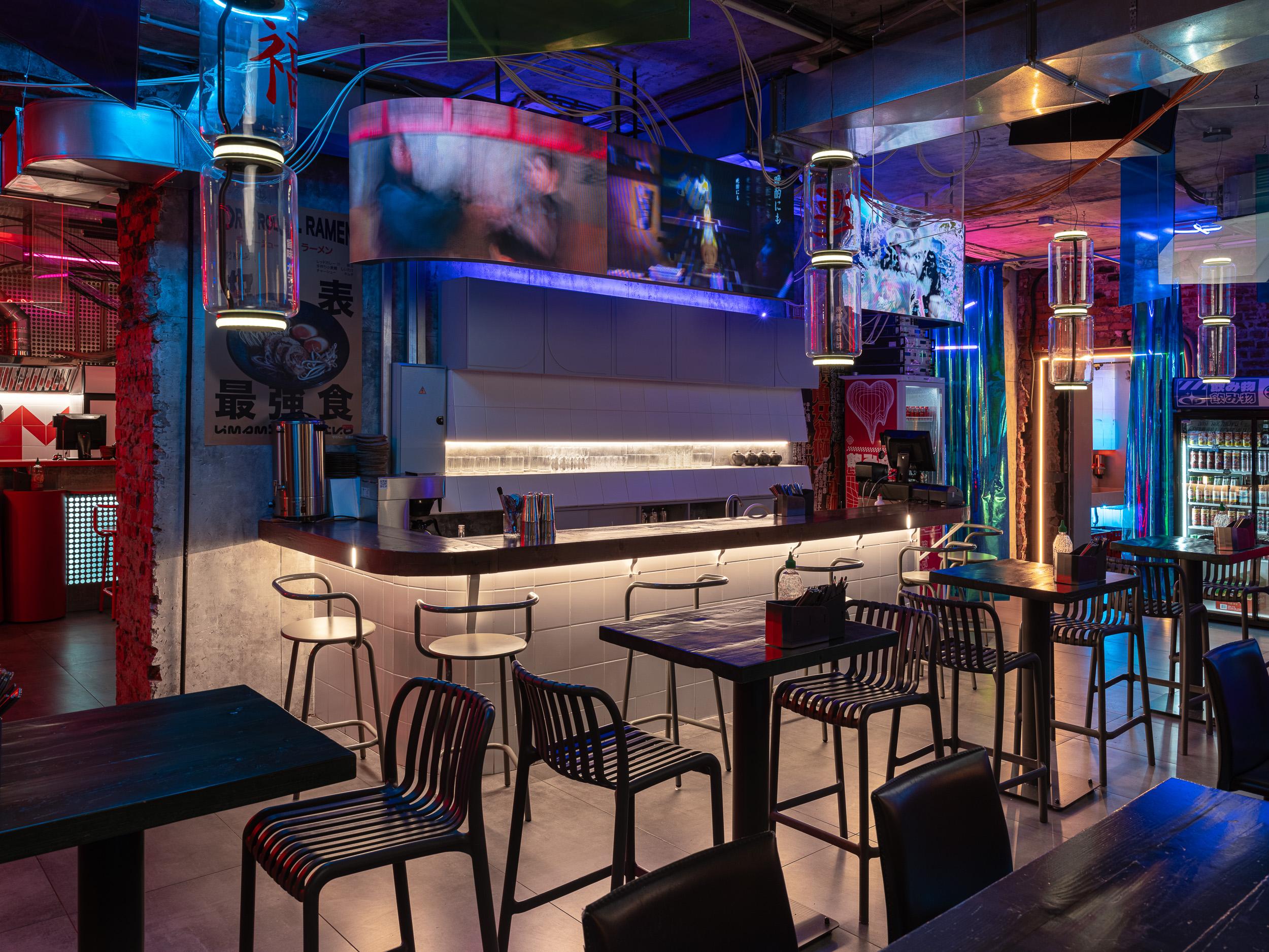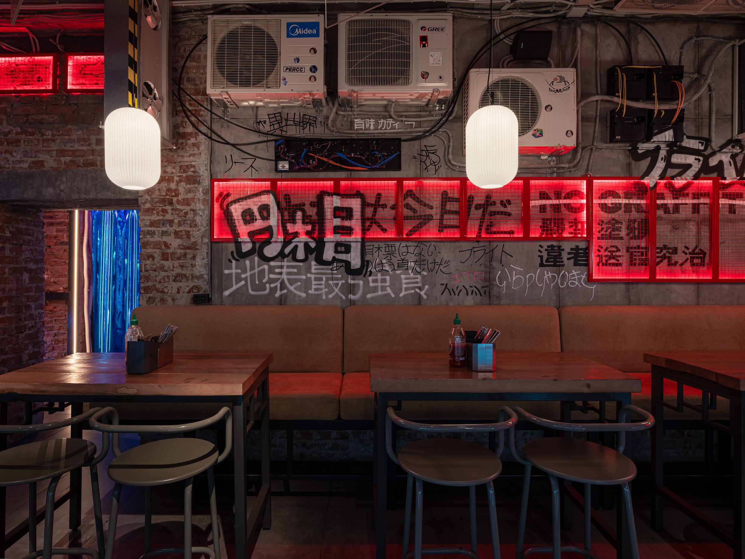 Стиль интерьера нового кафе можно назвать кибер-Азия. Хотелось создать образ города будущего — имитацию того, что гость находится не в помещении, а где-то между домами, среди проводов, граффити и старых кондиционеров. Эффект усиливает неоновая цветовая гамма.