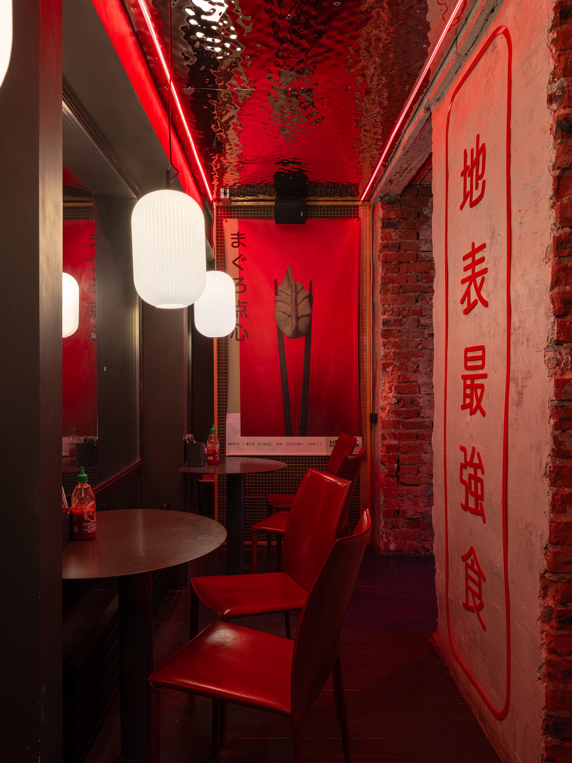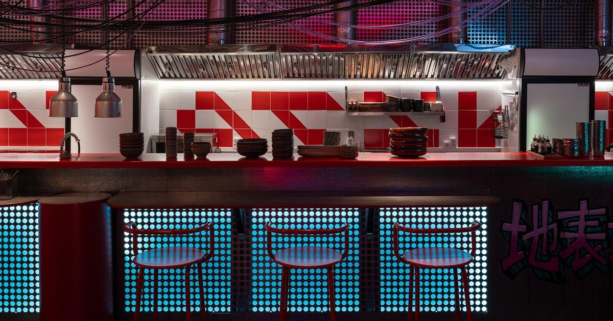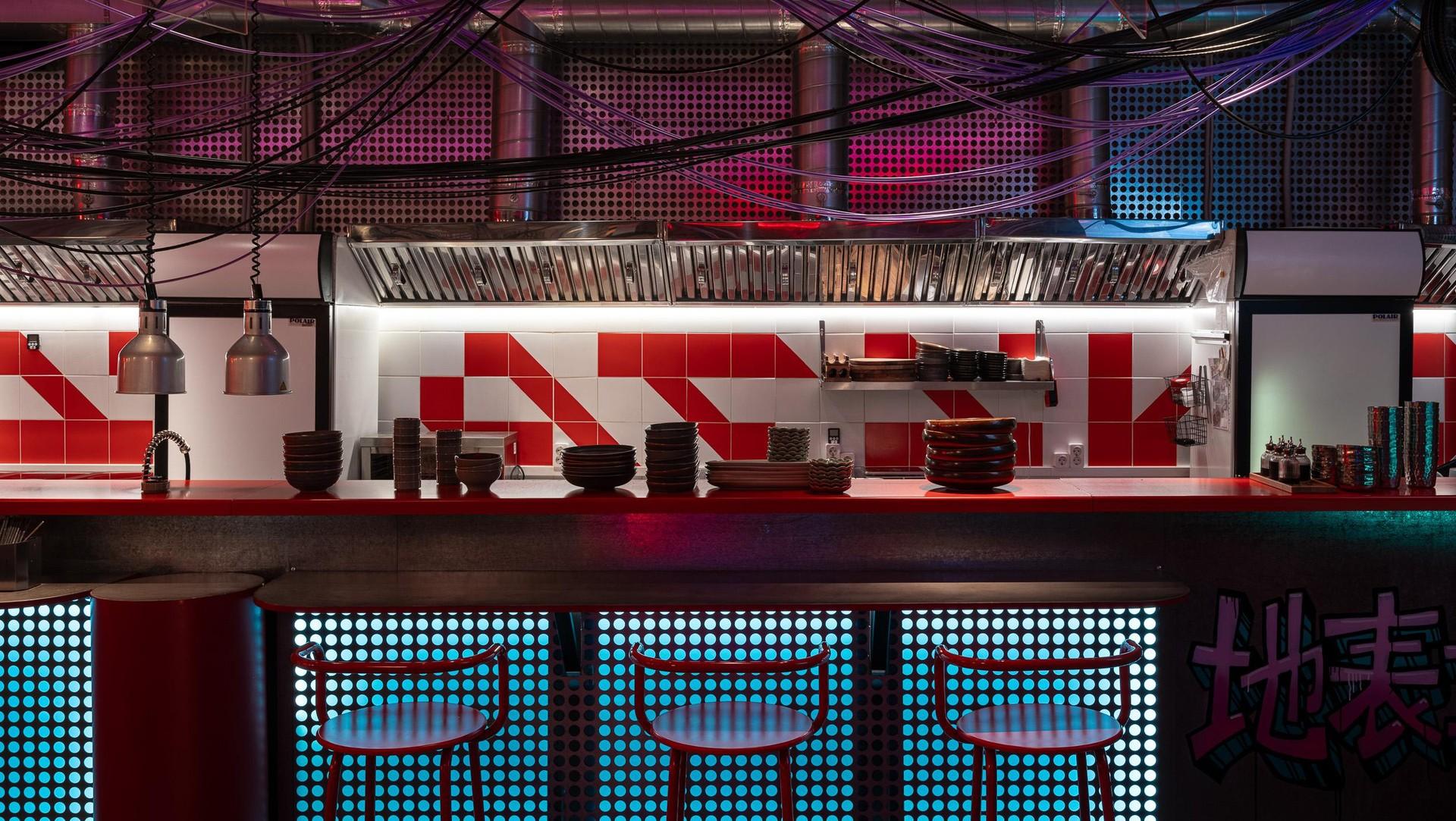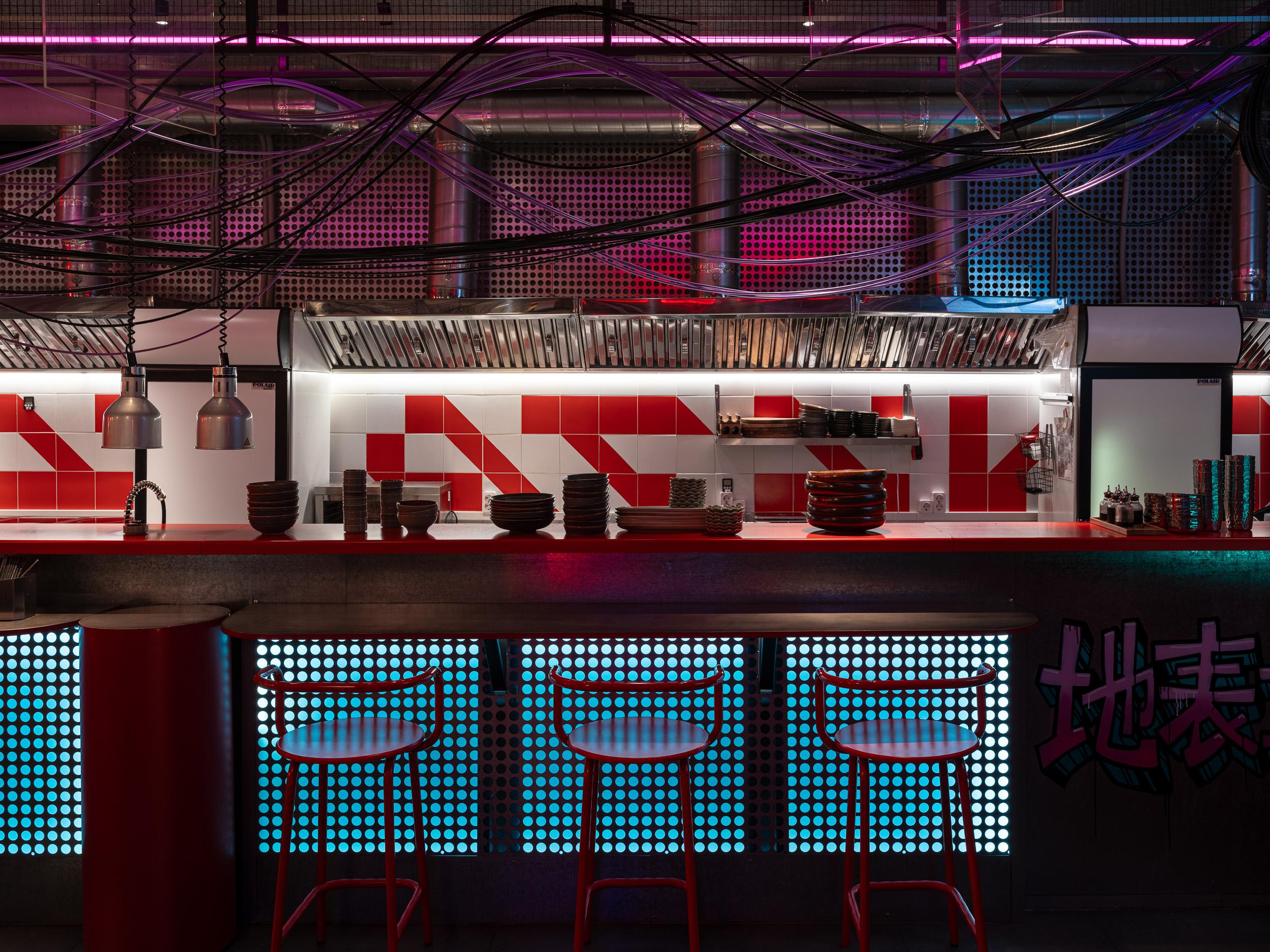 Стиль интерьера нового кафе можно назвать кибер-Азия. Хотелось создать образ города будущего — имитацию того, что гость находится не в помещении, а где-то между домами, среди проводов, граффити и старых кондиционеров. Эффект усиливает неоновая цветовая гамма.