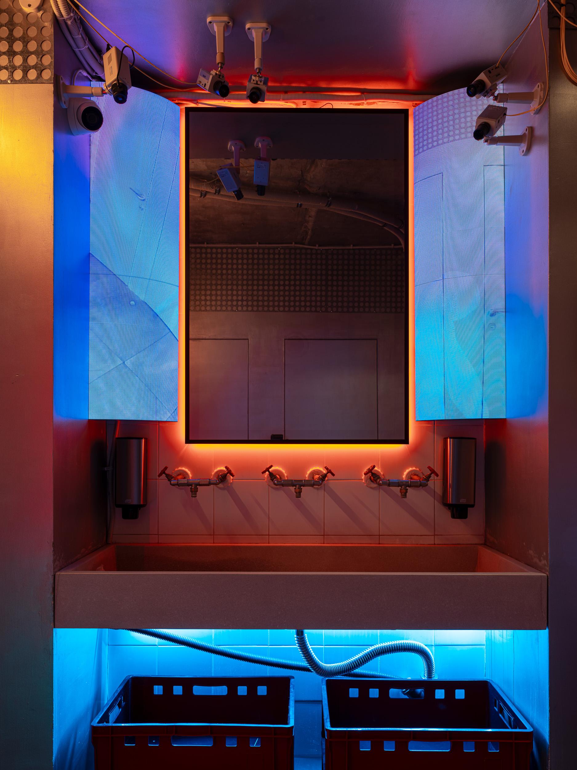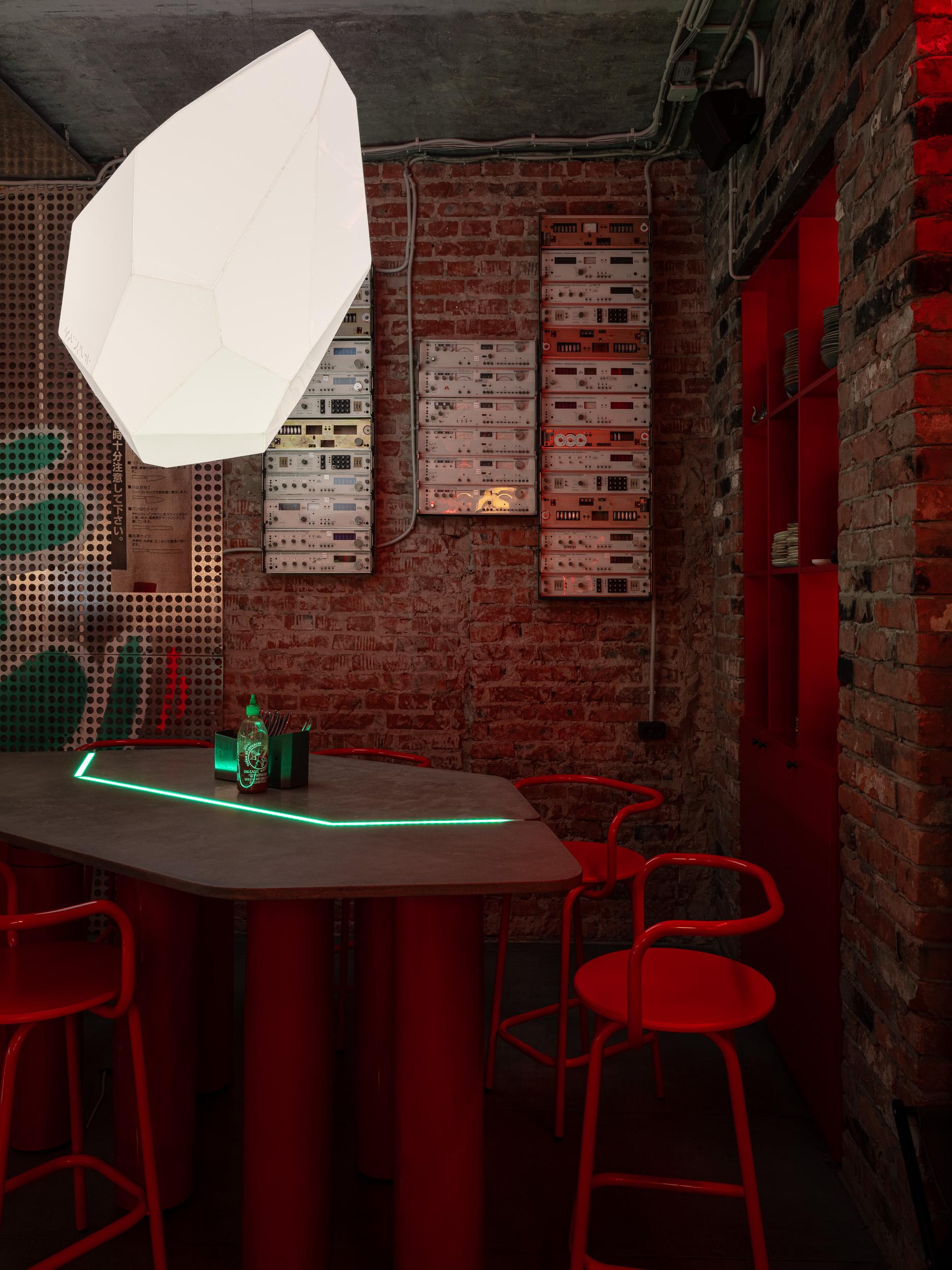 Столы собрали из старых досок и покрыли краской — нашли их на старых советских дачах. Здесь есть как нотки старой аутентики, так и бутафорские предметы современного искусства. Например, инопланетные светильники непонятной формы, кибер-алтарь девушки с дредами (это бюст хозяйки заведения) и изогнутые LED-экраны, многообразие цветного неона.