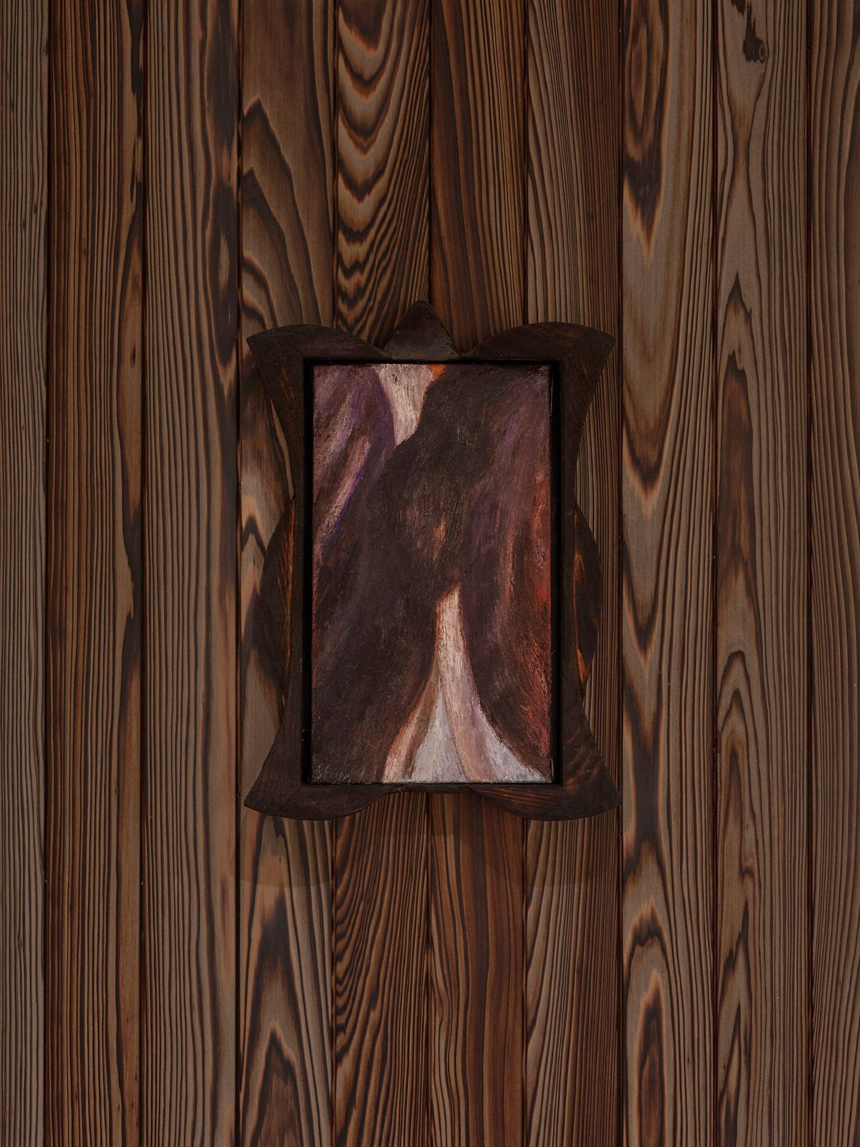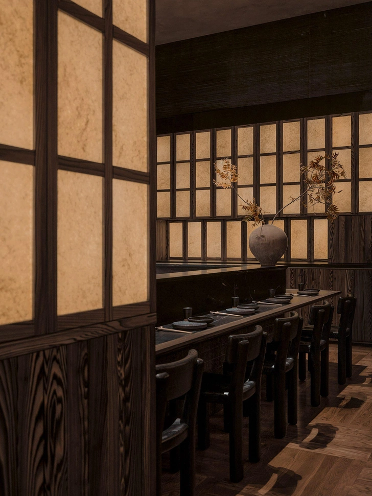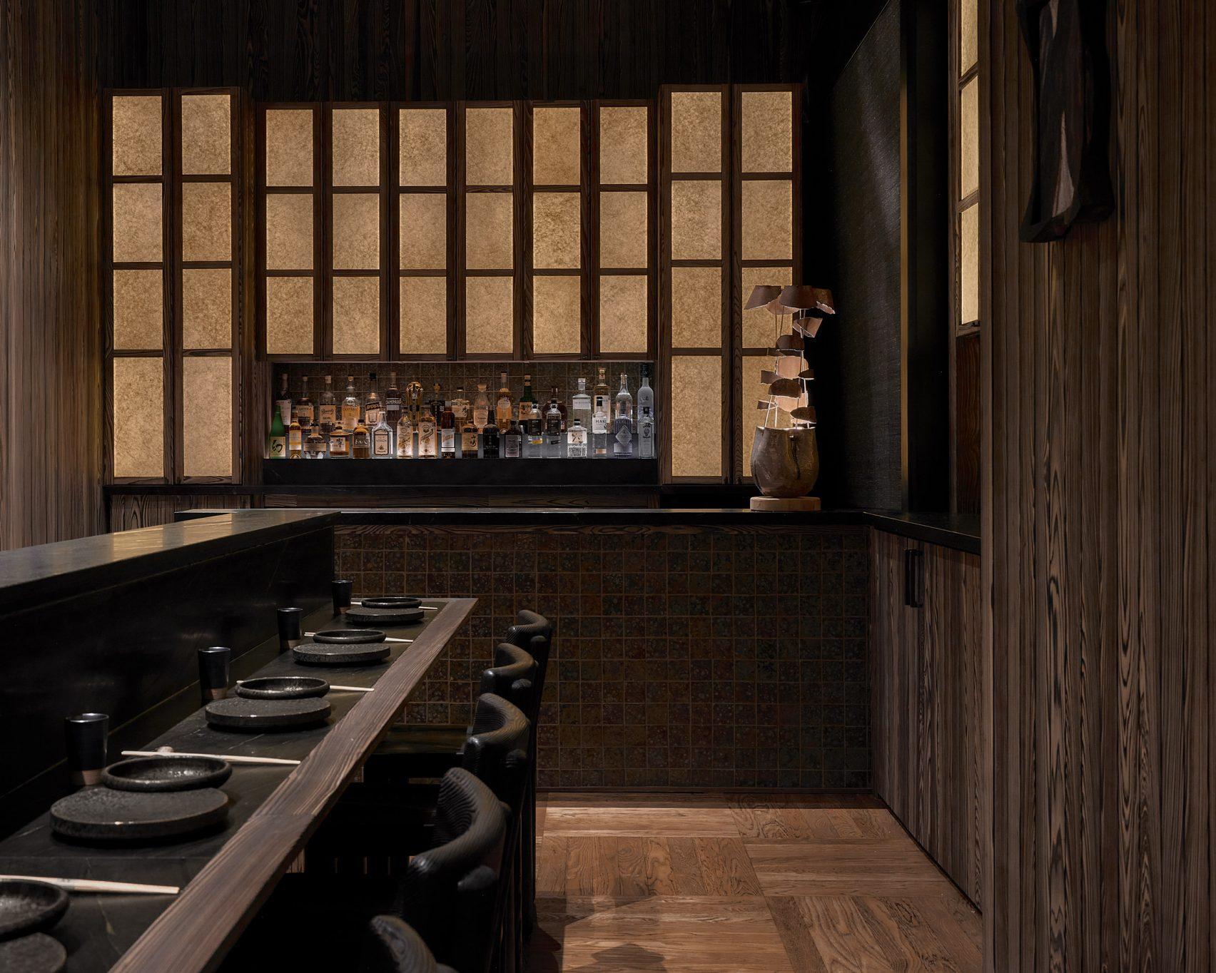 Стены от пола до потолка обшиты обугленным кипарисом, обработанным по традиционной японской технологии шу-суги-бан. Древесину произвели в Остине и дополнительно выкрасили в глубокий зеленый. Цвет придает теплоту и отсылает к японской эстетике без прямого цитирования.