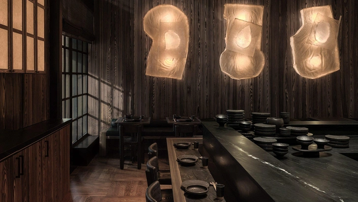 Решетчатые деревянные экраны с подсветкой прячут за собой стеклянные бокалы и керамические тарелки ручной работы. Дизайнер переосмыслила традиционные японские перегородки седзи, сделав их более игривыми.