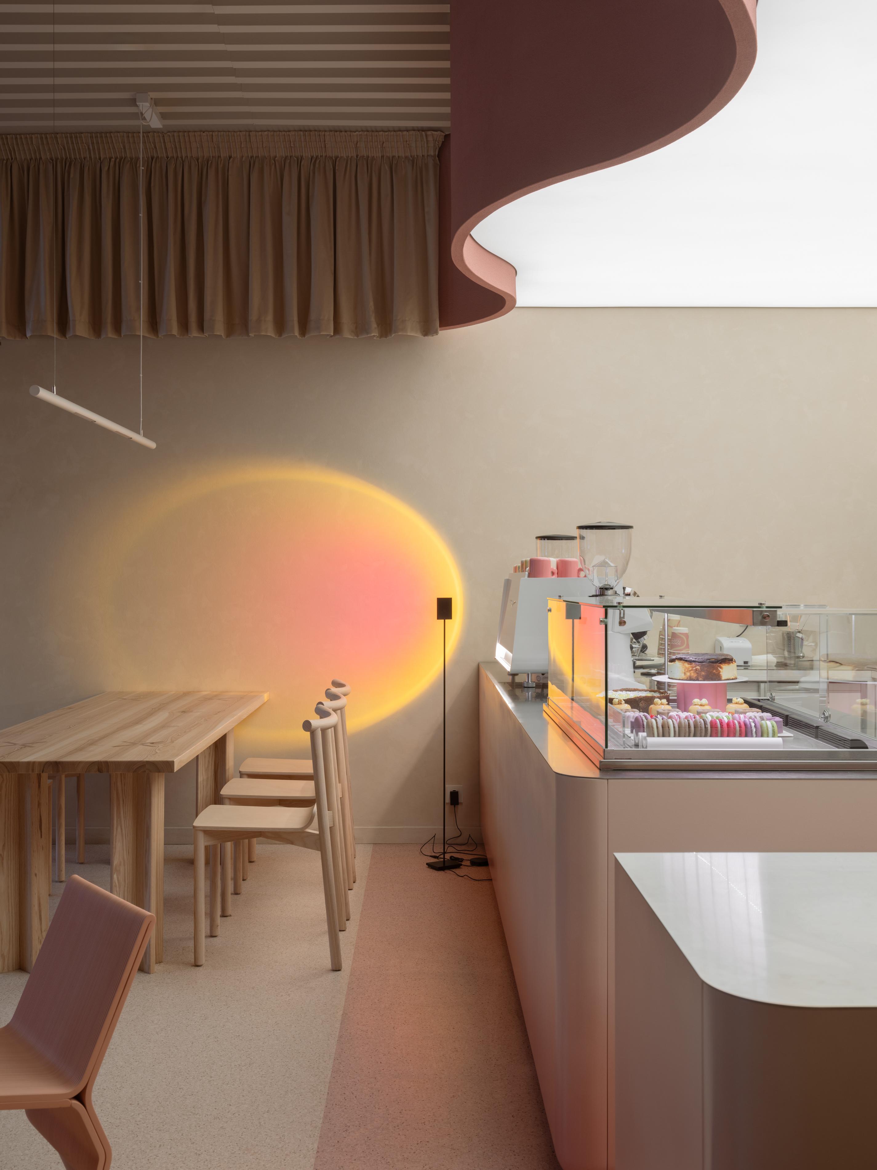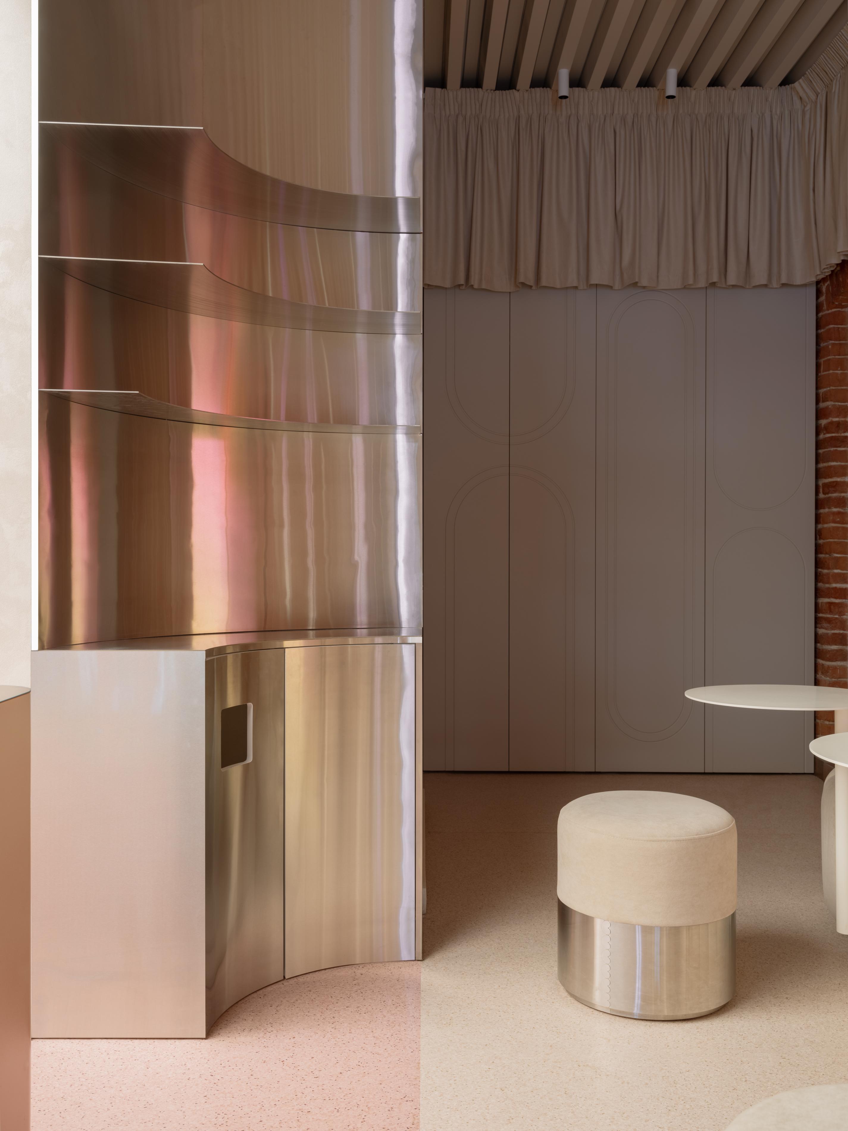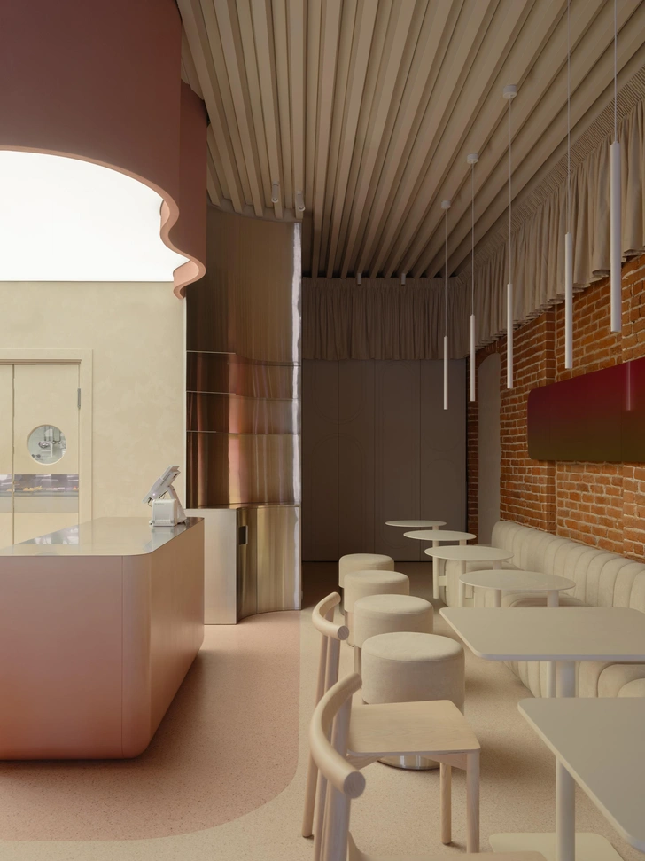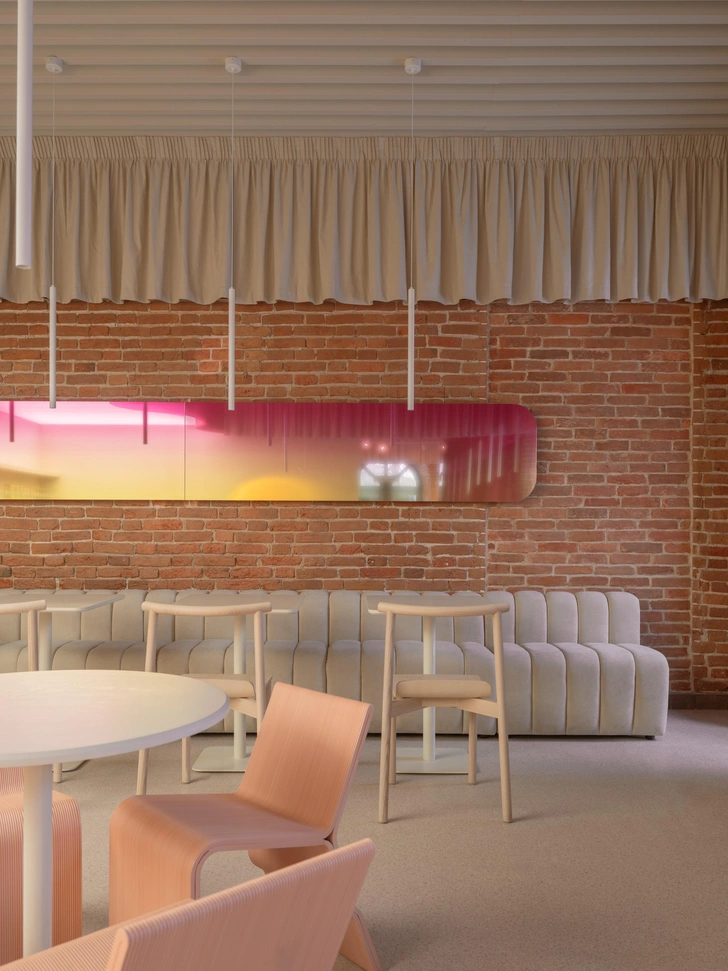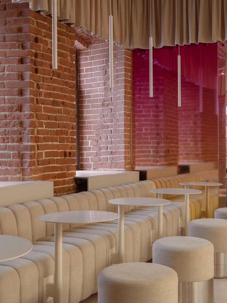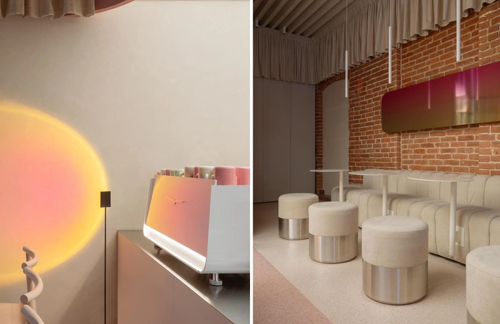 Здание историческое, в нем сохранилась оригинальная кирпичная кладка — делать с ней ничего было нельзя. Мы особенно гордимся тем, что в эту архитектуру удалось вписать современный, смелый дизайн. Центральную часть двух пространств занимают барная стойка и стойка продаж, она объединяет две зоны воедино. Та же роль и у тонированного зеркала с розовым градиентом, мы разместили его по периметру. Нежных цветовых растяжек здесь довольно много: и бело-румяная глазурь в барной части, и оригинальные световые решения. Стоит обратить внимание и на световой потолок, напоминающий облако.