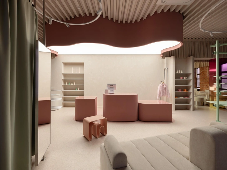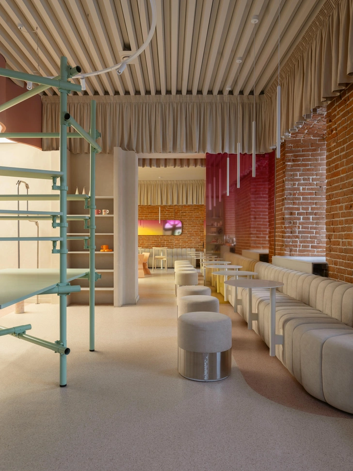 Мы ориентировались на молодую женскую аудиторию, стремились к яркому и эмоциональному пространству с дружелюбной атмосферой — месту, которое с порога вызывает ощущение радости и легкости. У нас получился целостный интерьер: мы продумали все траектории движения, чтобы посетителям было удобно переходить из одной зоны в другую. Главное было сохранить воздушность и открытость, никаких нагромождений.