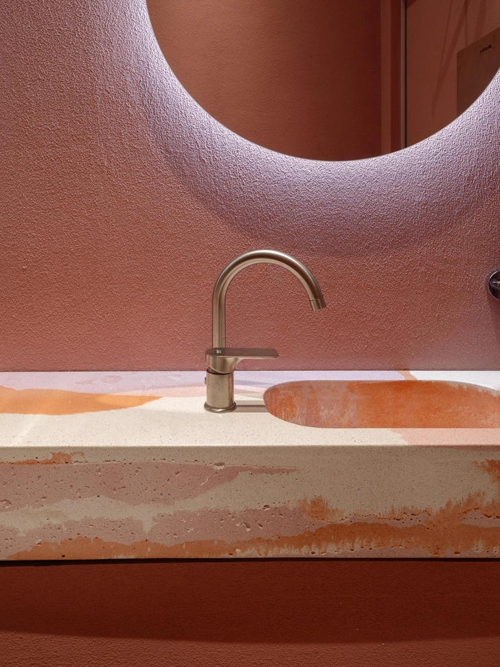 Общая геометрия получилась плавной, но вместе с тем динамичной. К декору мы тоже подошли с особым вниманием: пуфы с декоративными сердечками, мягкие диваны, мебель с эффектными формами из переработанных материалов от российского бренда Eburet, раковина из цветного бетона — все эти элементы выстроились в единый ансамбль. Они будто оживают, когда проходишь мимо.