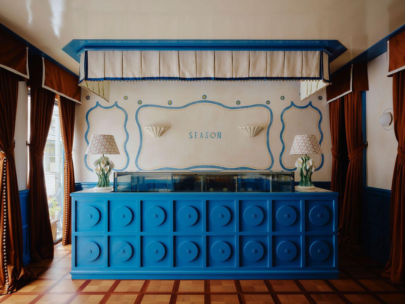 Главную роль в этой постановке играет цвет. Входная зона решена в успокаивающих оттенках синего — фирменного цвета Season, задающего настроение сдержанной элегантности.