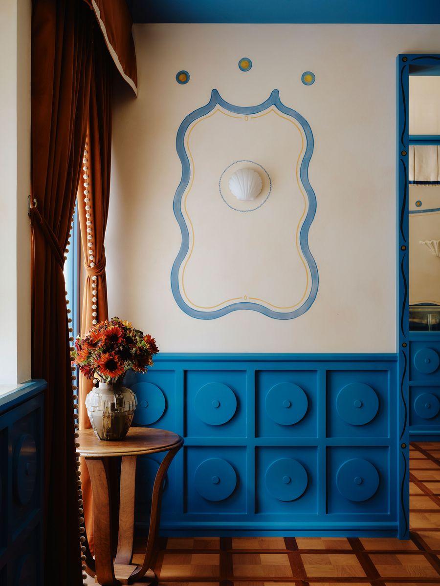 Бархатные портьеры цвета жженого апельсина с жемчужными подхватами, раковины-бра, ручная роспись на стенах и лаковая отделка — каждый элемент добавляет свой акцент в эту симфонию.