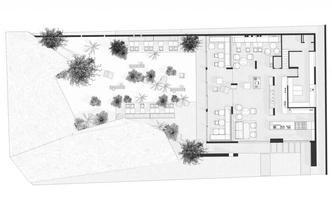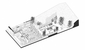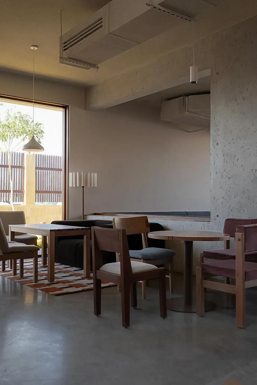 Внутренний двор стал центром кафе. Вокруг него организованы все основные зоны. Через большие панорамные окна открывается вид на каменную стену. Свет проникает глубоко в помещение, а граница между интерьером и природой становится почти неощутимой.