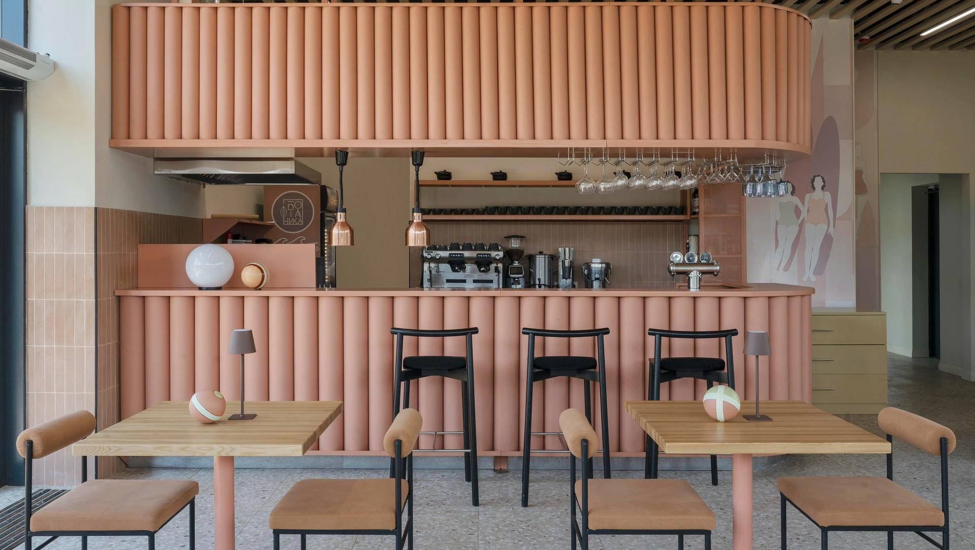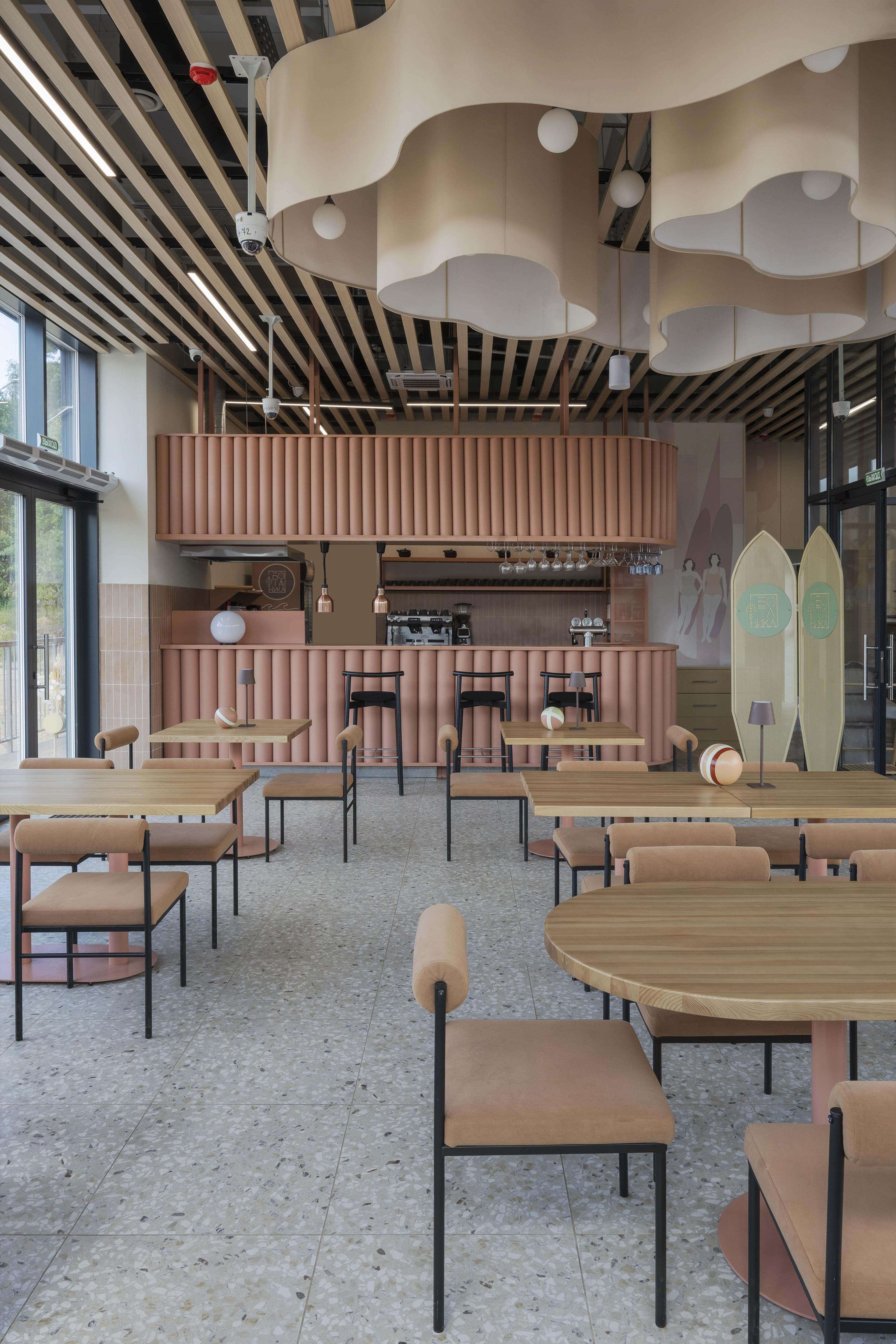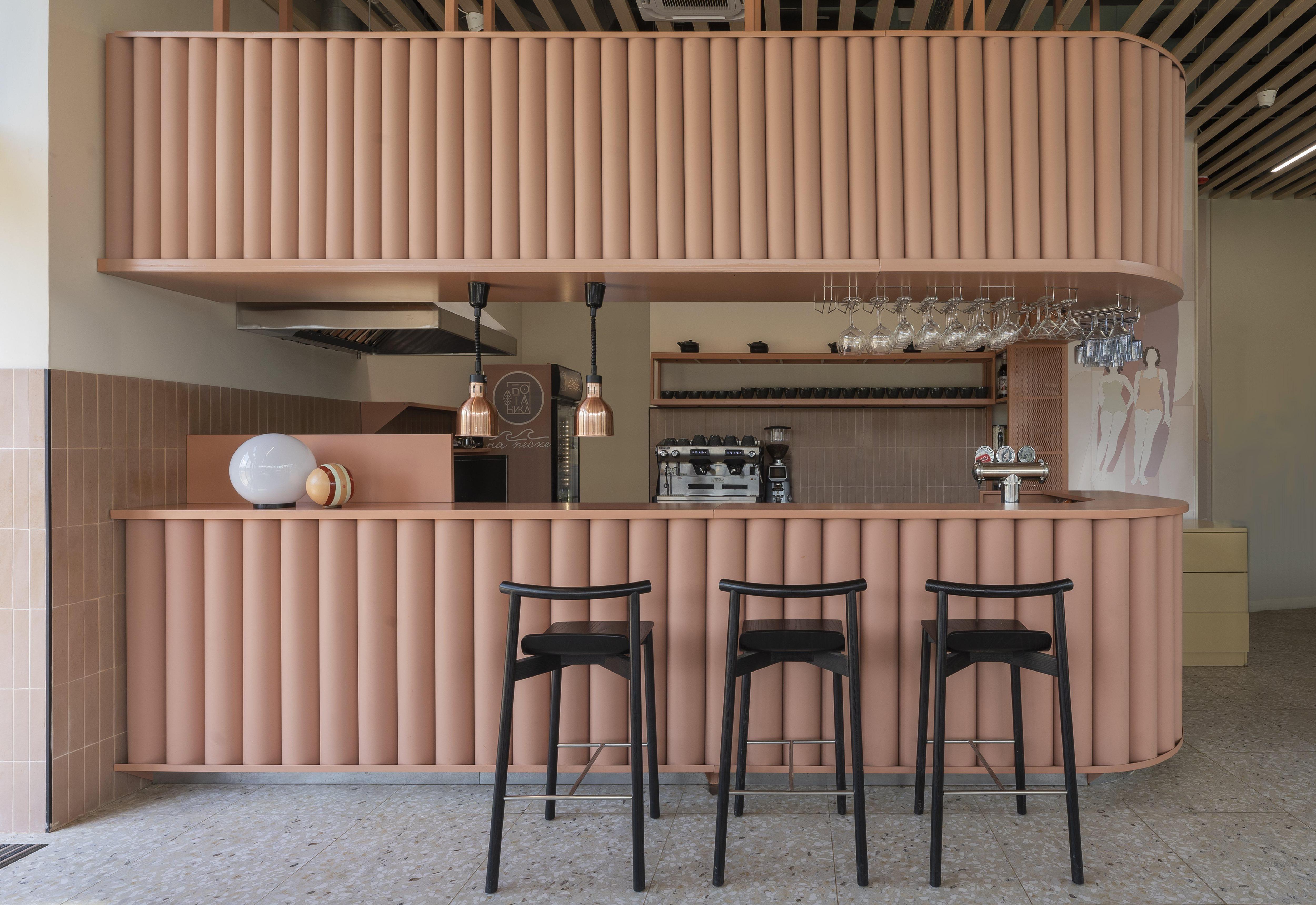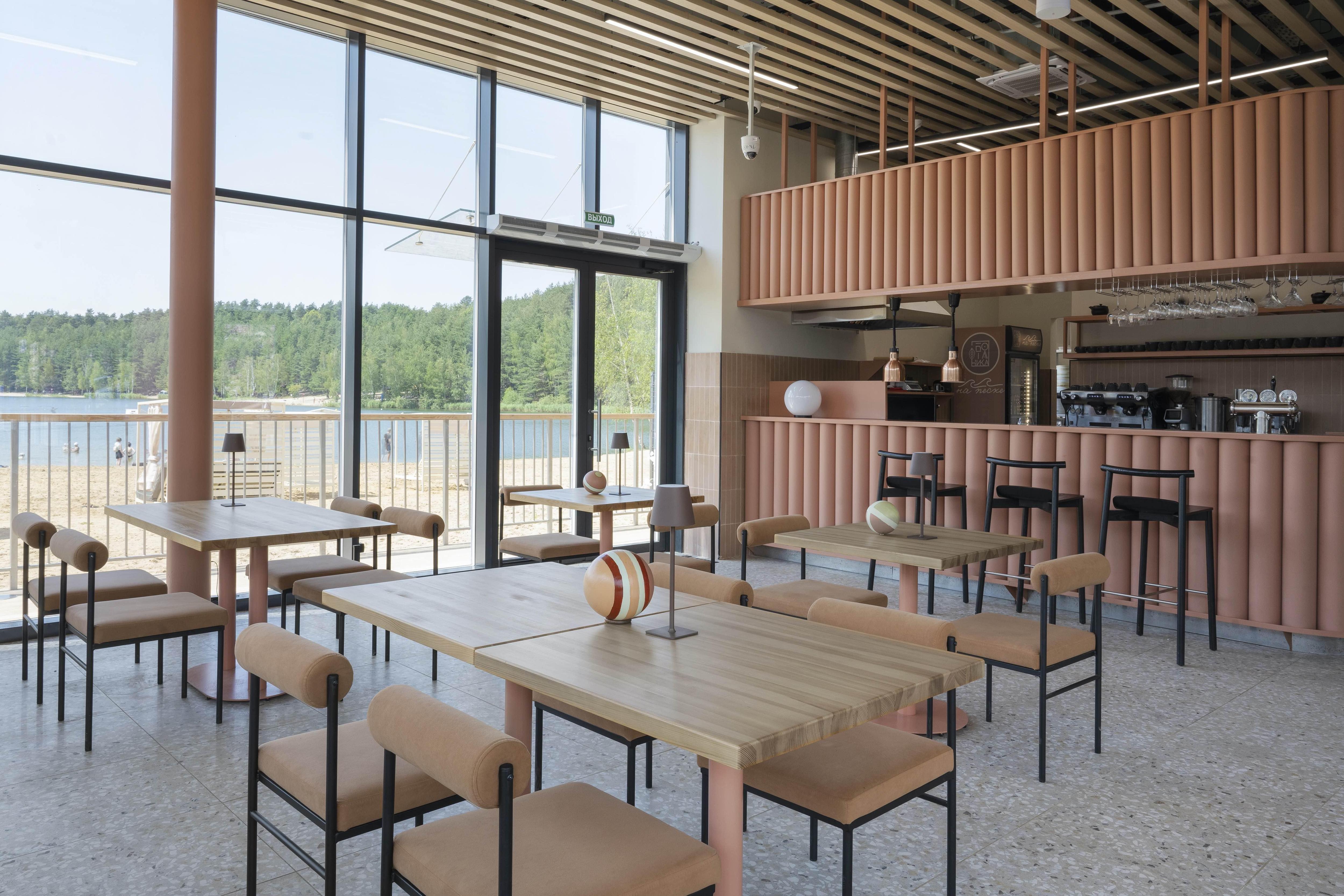 При планировке мы выделили акцентную барную стойку, общий зал, детскую зону и санузлы (в том числе для лиц с ограниченной мобильностью). На мой взгляд, самый интересный предмет — это барная стойка: для нее я предложила очень простой материал, но в такой конфигурации и в таком цвете он, можно сказать, заиграл. Так нам удалось найти баланс между бюджетом и зрелищностью.