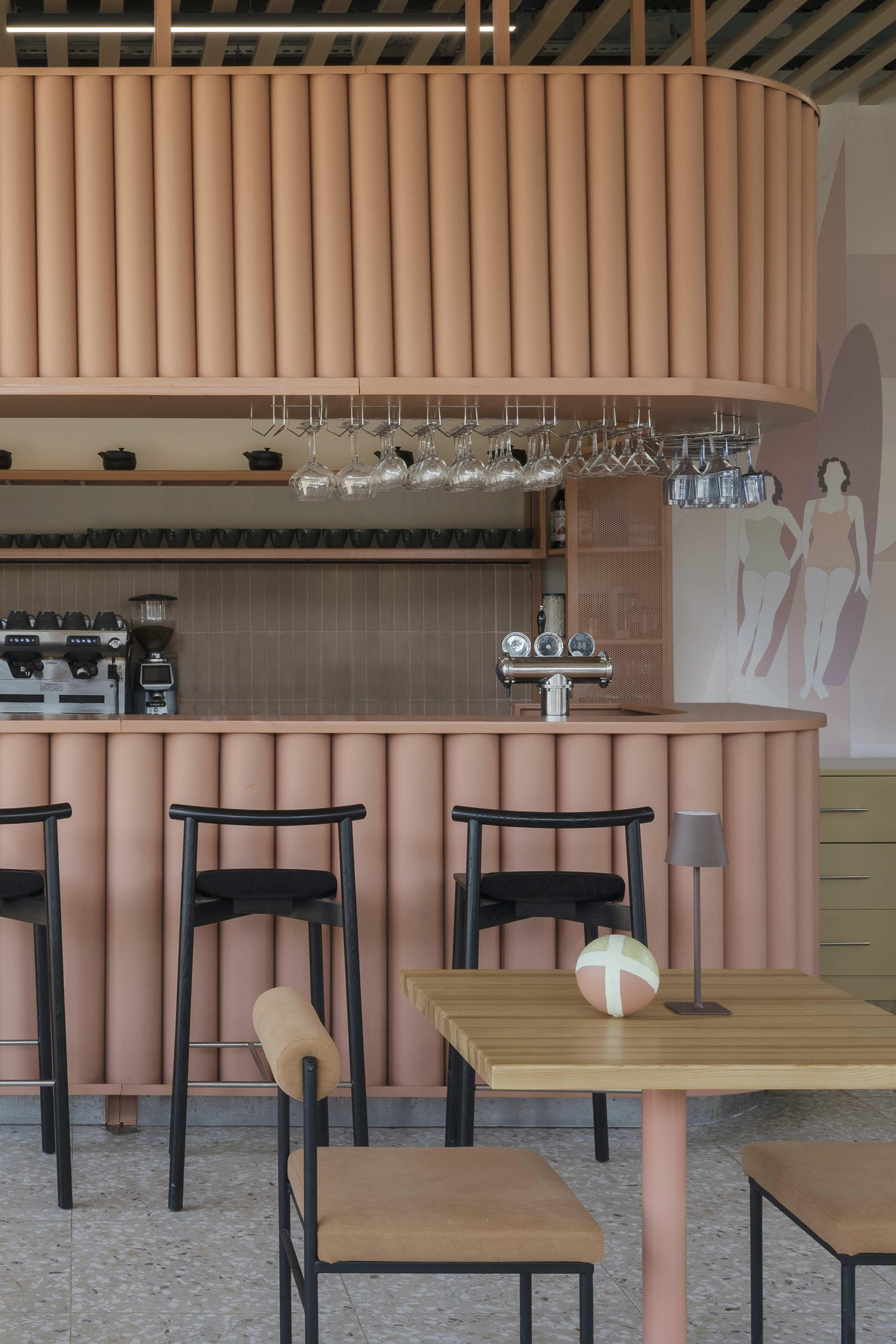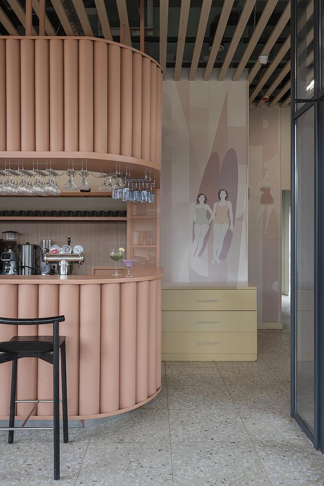 Стоит обратить внимание и на красивые обои-панно от Factura с купальщицами. Я давно заметила эту стильную серию, и когда появился запрос на пляжный ресторан, поняла, что панно должно быть здесь! Его беззаботная эстетика 1960–70-х и лаконичные образы как нельзя лучше подходят этому месту.