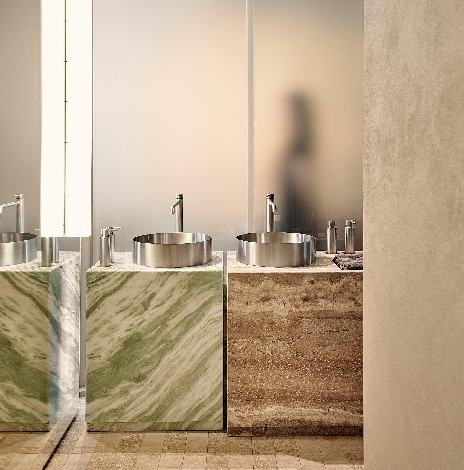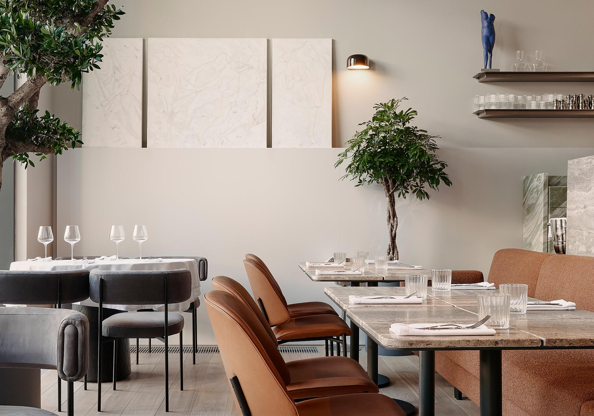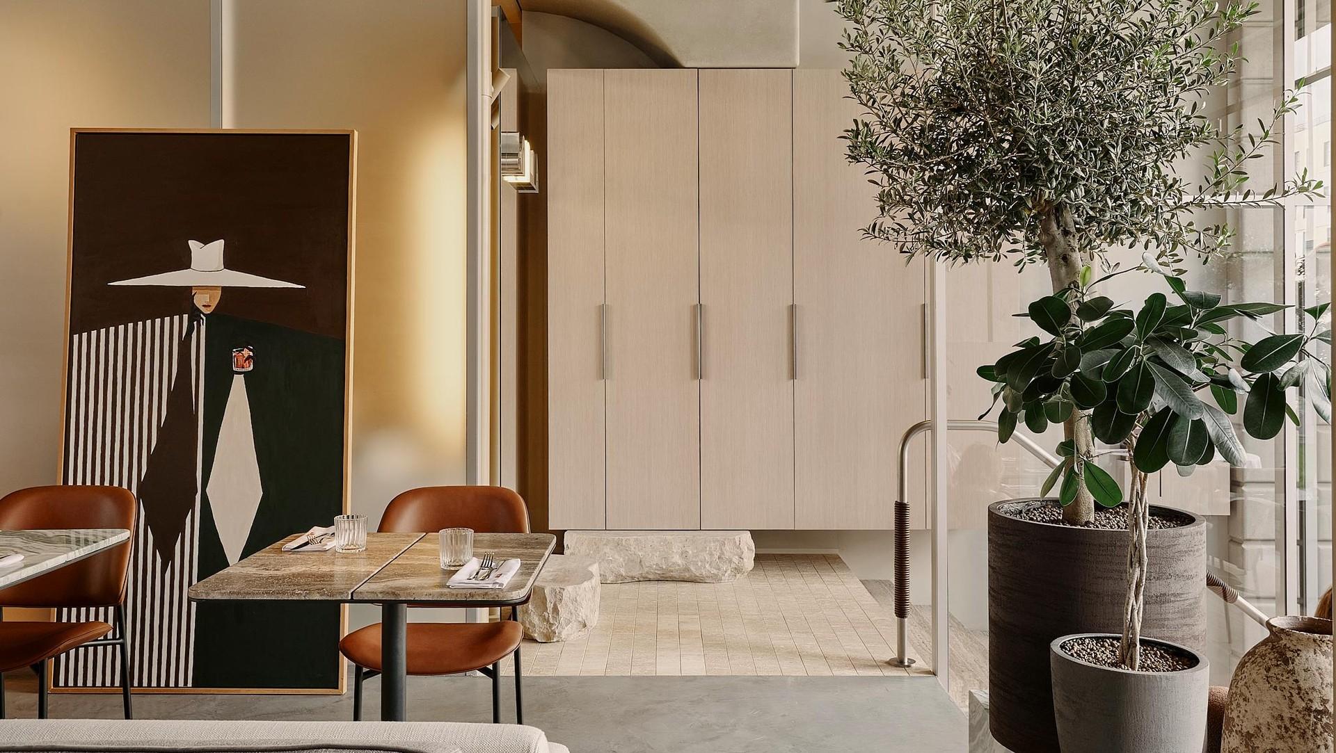 Эти разные по форме и материалам элементы выстроены в единую линию, создавая атмосферу настоящей миланской улицы — одновременно строгой и слегка хулиганской. Мебель подобрана намеренно разноплановая — она словно собрана по частям из частных интерьеров, что создает живую, уличную сцену. Ее поддерживает и пол, выложенный авторской мозаикой.