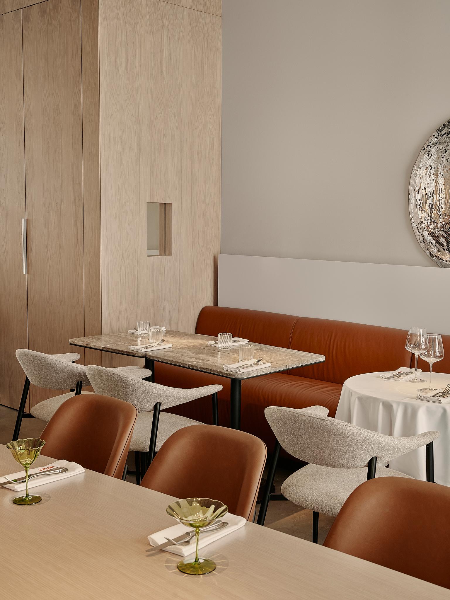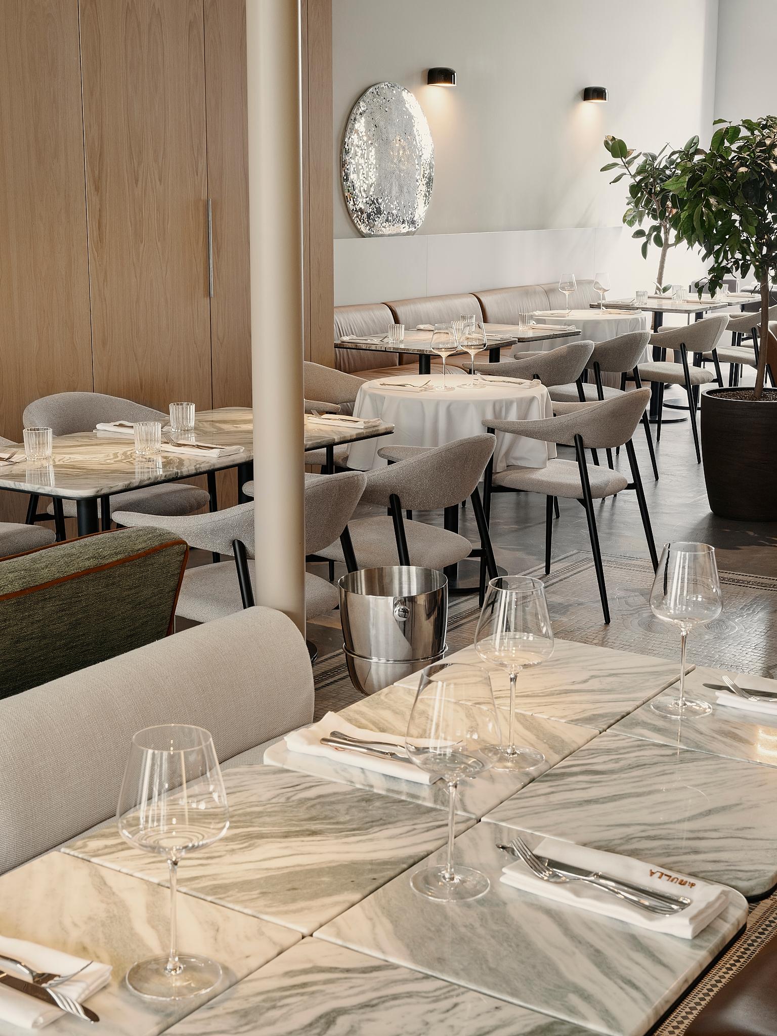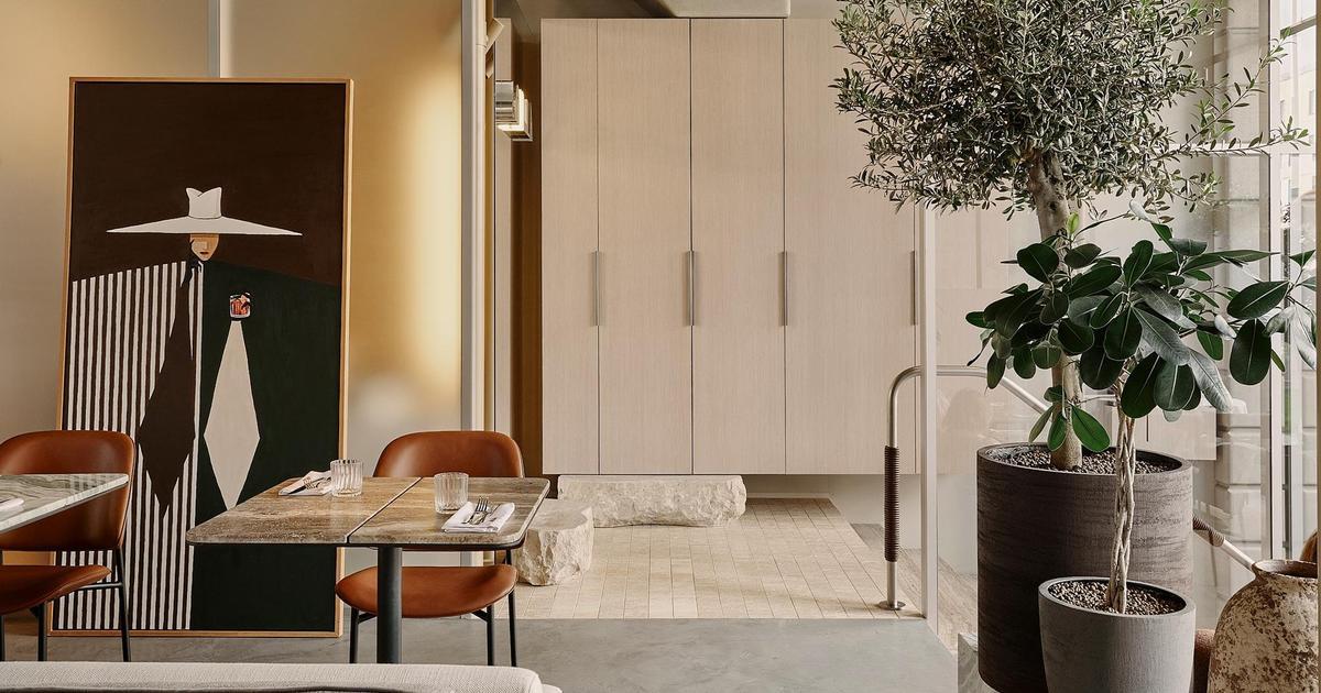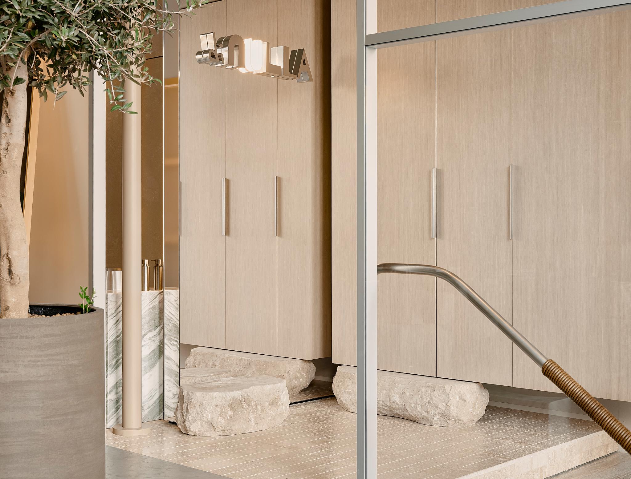 Эти разные по форме и материалам элементы выстроены в единую линию, создавая атмосферу настоящей миланской улицы — одновременно строгой и слегка хулиганской. Мебель подобрана намеренно разноплановая — она словно собрана по частям из частных интерьеров, что создает живую, уличную сцену. Ее поддерживает и пол, выложенный авторской мозаикой.