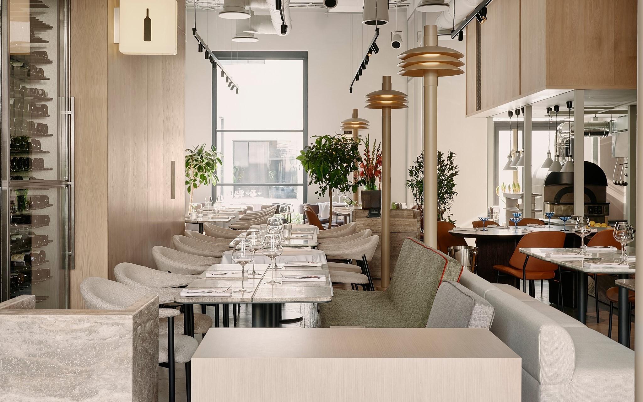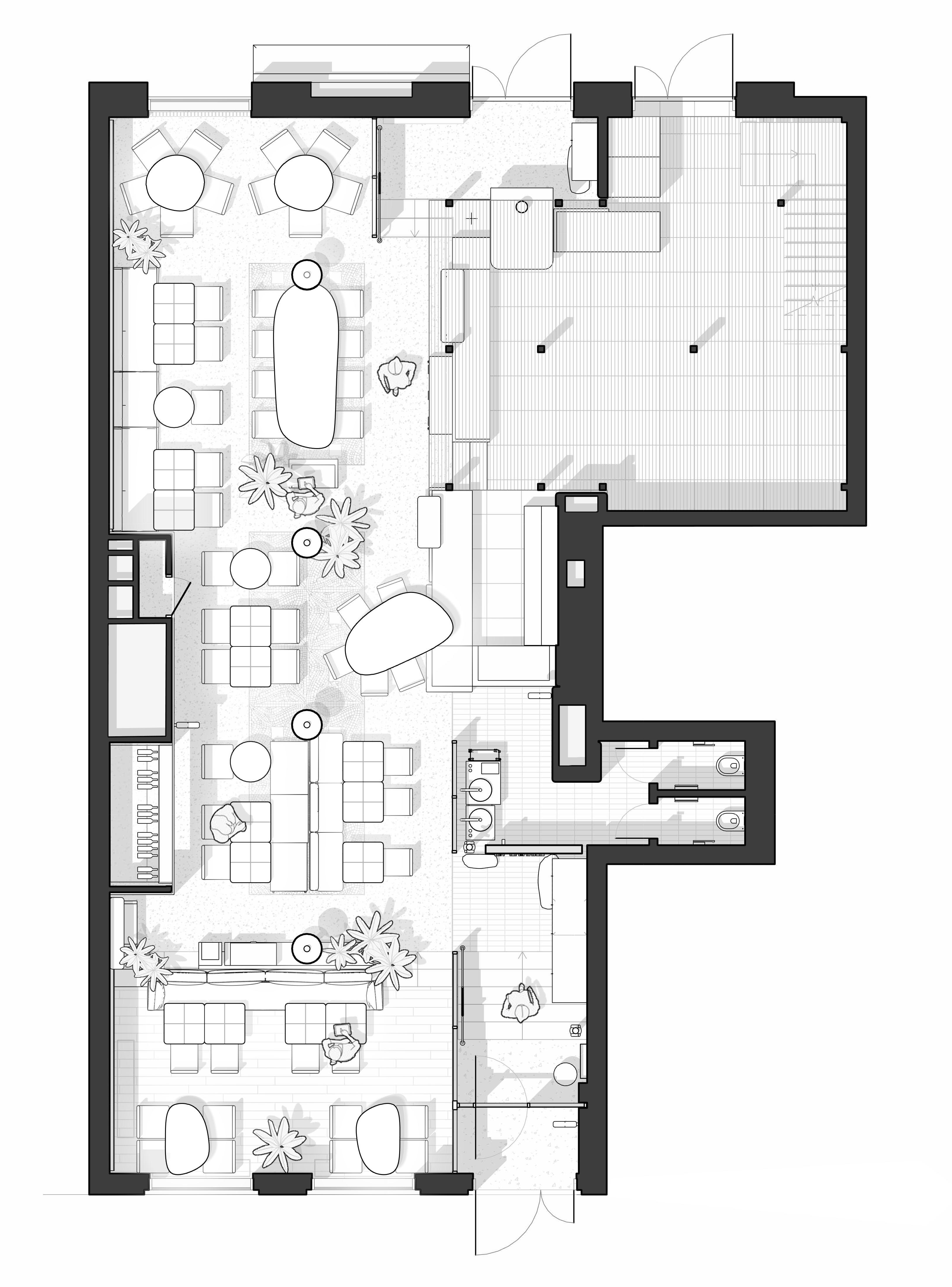 Чтобы передать ощущение гедонизма, мы вдохновились образом модного и быстрого Милана — города, живущего в быстром, но особом, естественном ритме. Так родилась идея контролируемого хаоса, которую мы выразили в архитектурной композиции пространства: смещенные оси, разнообразие текстур, рваная геометрия — все это создает ощущение энергии и движения.