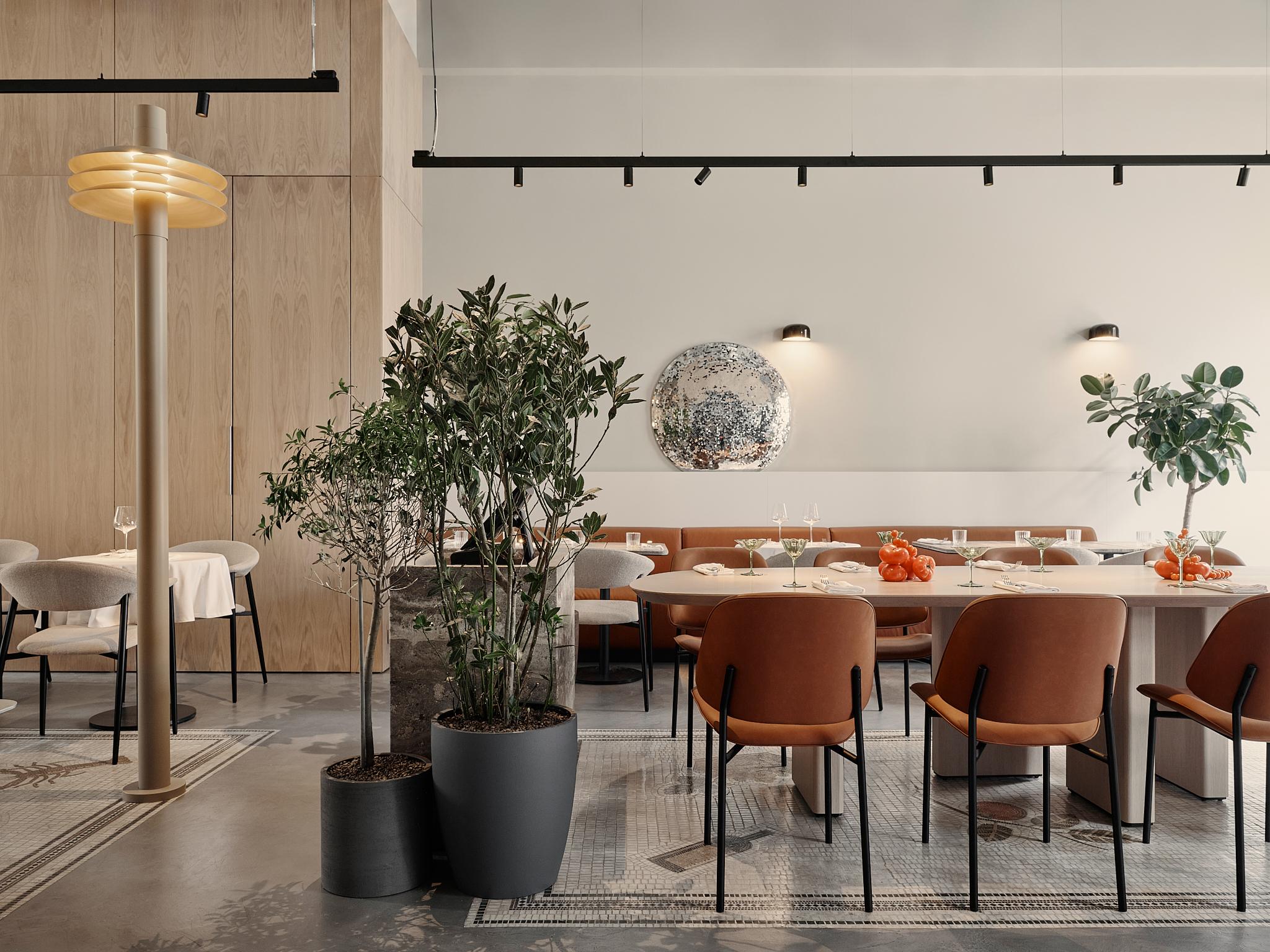 Сценография зала выглядит непринужденно: центральная зона напоминает улицу с фонарями и деревьями. Здесь нет симметрии — наоборот, все собрано будто случайно, спонтанно: как будто жители соседних домов вынесли на улицу свою мебель и присели отдохнуть в тени. Эффект усиливается благодаря комбинации фасадных элементов вдоль стены: где-то выступает антресоль кухни, где-то — козырек бара или арка.