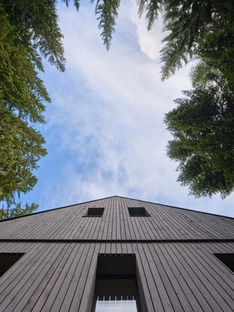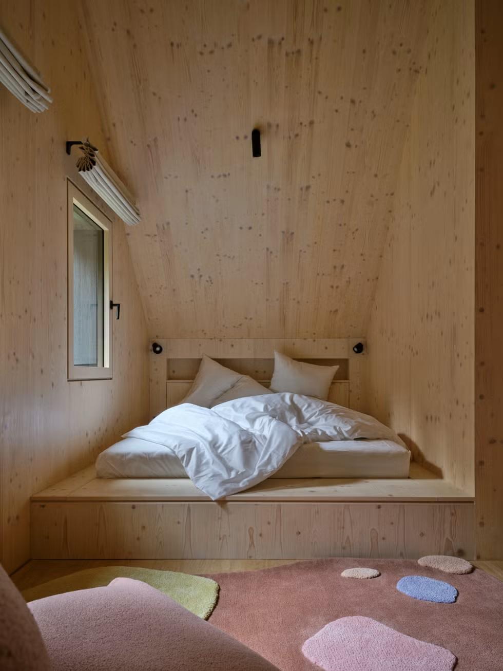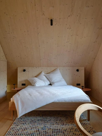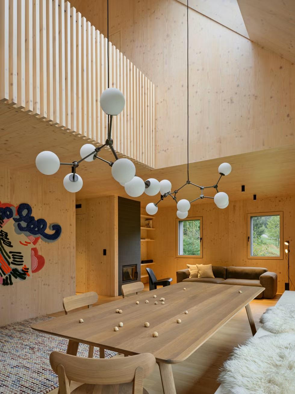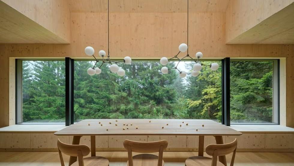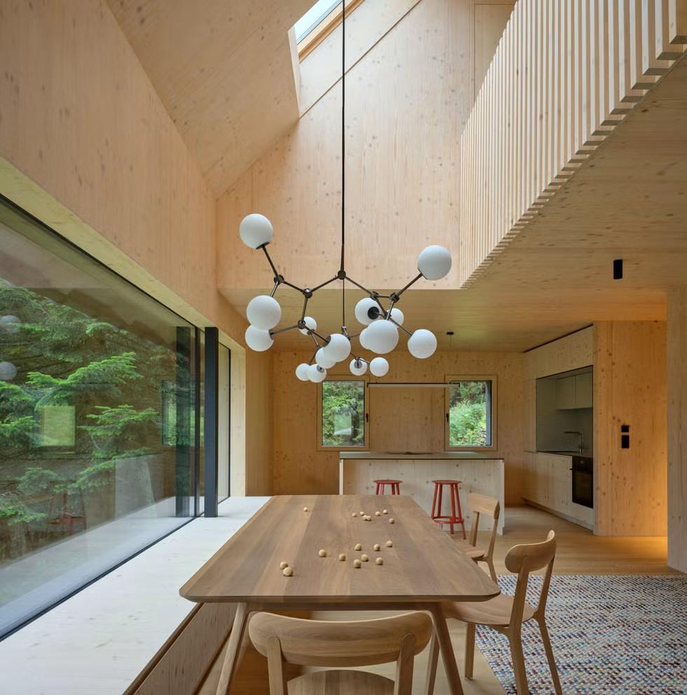 Для строительства архитекторы выбрали CLT-панели. Их привезли на участок и собрали за несколько недель прямо на бетонном цоколе. Панели настолько ровные и красивые, что их не стали закрывать отделкой — они сами стали частью интерьера внутри дома.