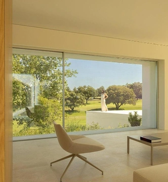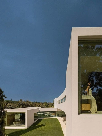 Все помещения соединены центральным «стержнем» с лестницей. Стены дома — гладкий белый бетон, а окна — от пола до потолка. Это создает ощущение простора и света. Изогнутые линии стен мягко направляют движение по дому и саду, связывая их в одно целое. Архитекторы специально работали над пропорциями — подбирали правильные расстояния и соотношения, чтобы пространство чувствовалось гармонично, без лишней вычурности.