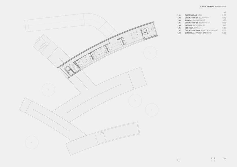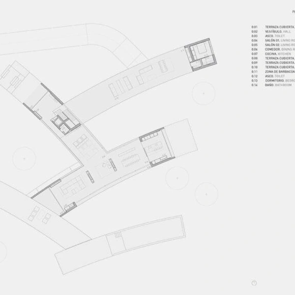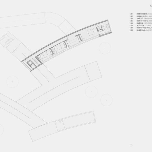 Планировка дома следует за естественным склоном участка. На самом нижнем уровне, откуда удобно выходить наружу, находятся бассейн и комнаты для гостей. Чуть выше расположена общая зона — гостиная, столовая и кухня с видом на соседнее озеро. На самом верхнем уровне, в длинном корпусе, будто парящем над землей, устроены спальни. Под этим корпусом образуется тенистая терраса.
