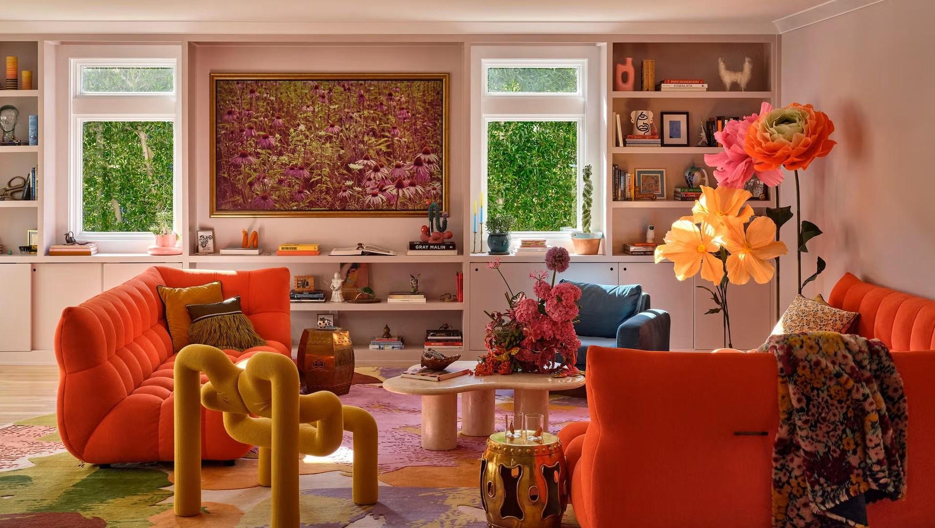 Самая используемая комната в доме находится прямо рядом с кухней. Диван Roche Bobois, оранжевый, как мандарин, соседствует с лавандовыми стенами и встроенными книжными шкафами. Дизайнер выбрала лавандовый специально, чтобы приглушить энергию оранжевого. Огромные цветы из папье-маше — со свадьбы хозяев, которая прошла в Палм-Спрингс. Теперь это не просто декор, а трогательное напоминание о важном дне.
