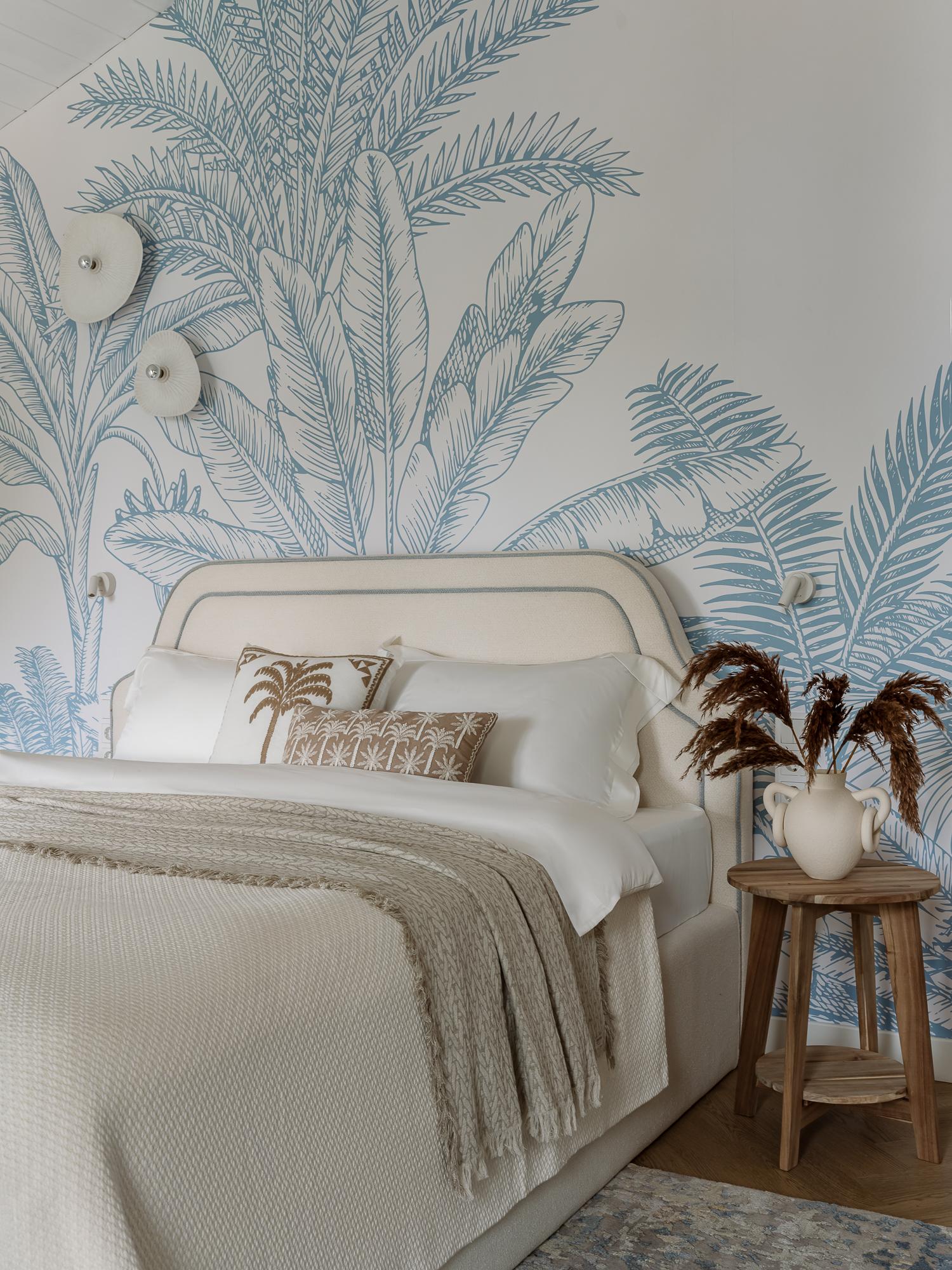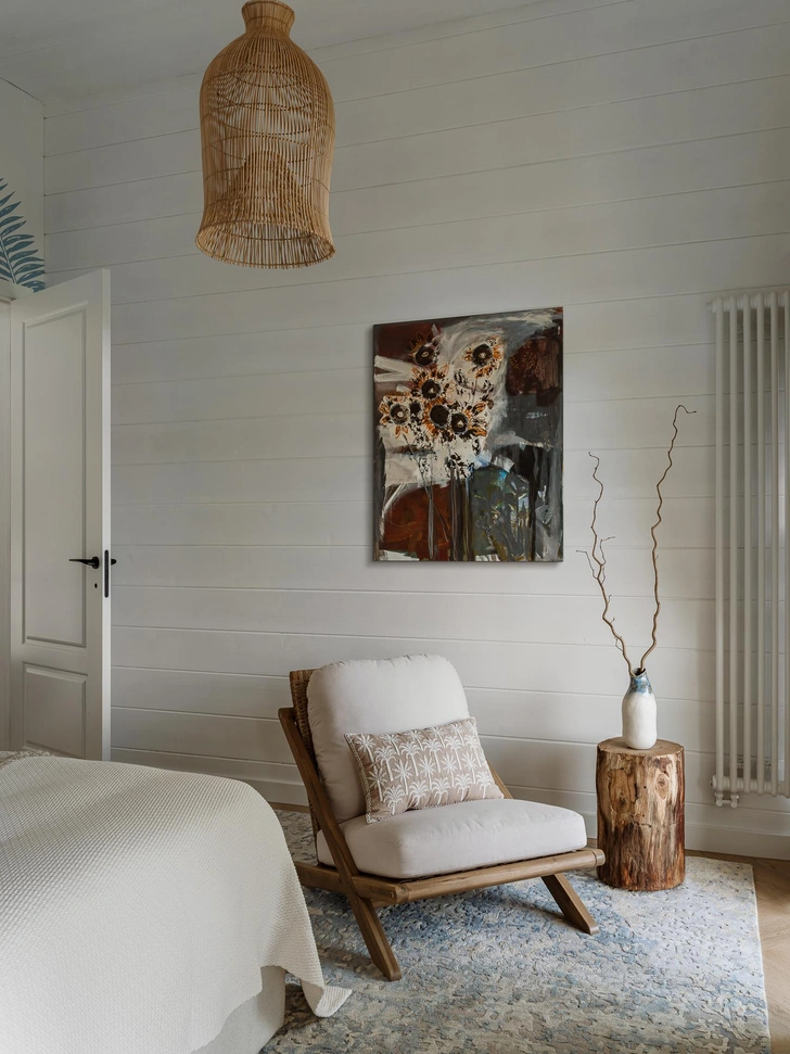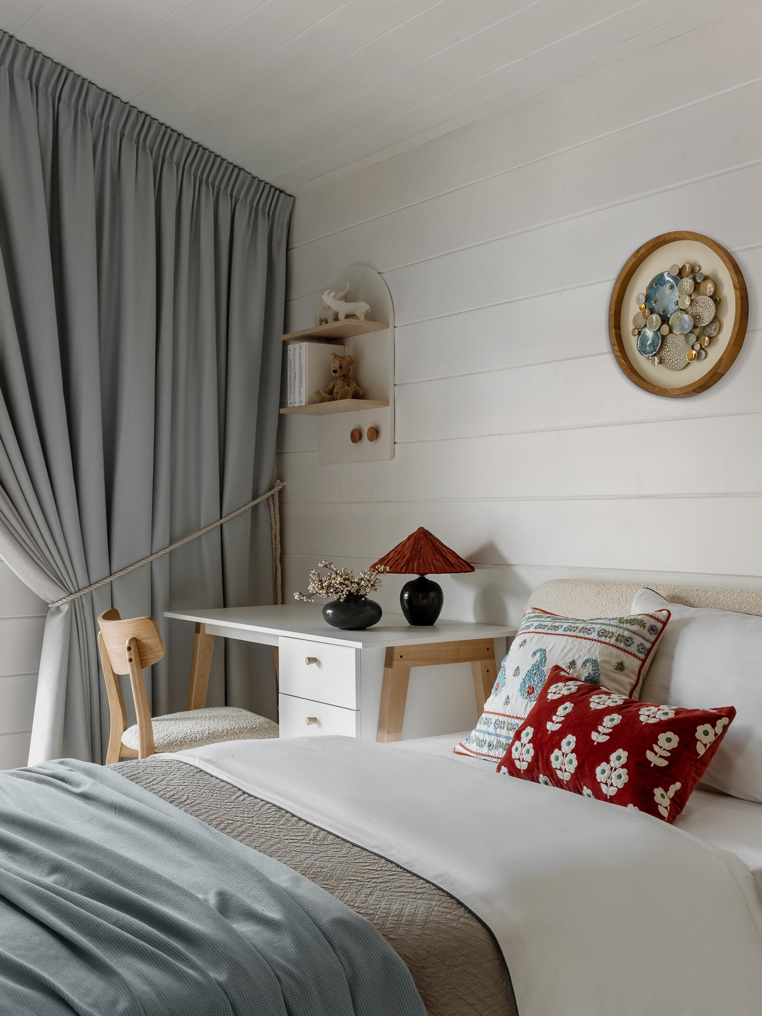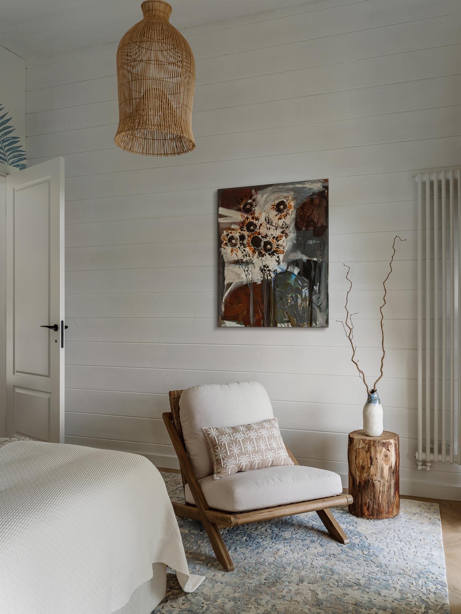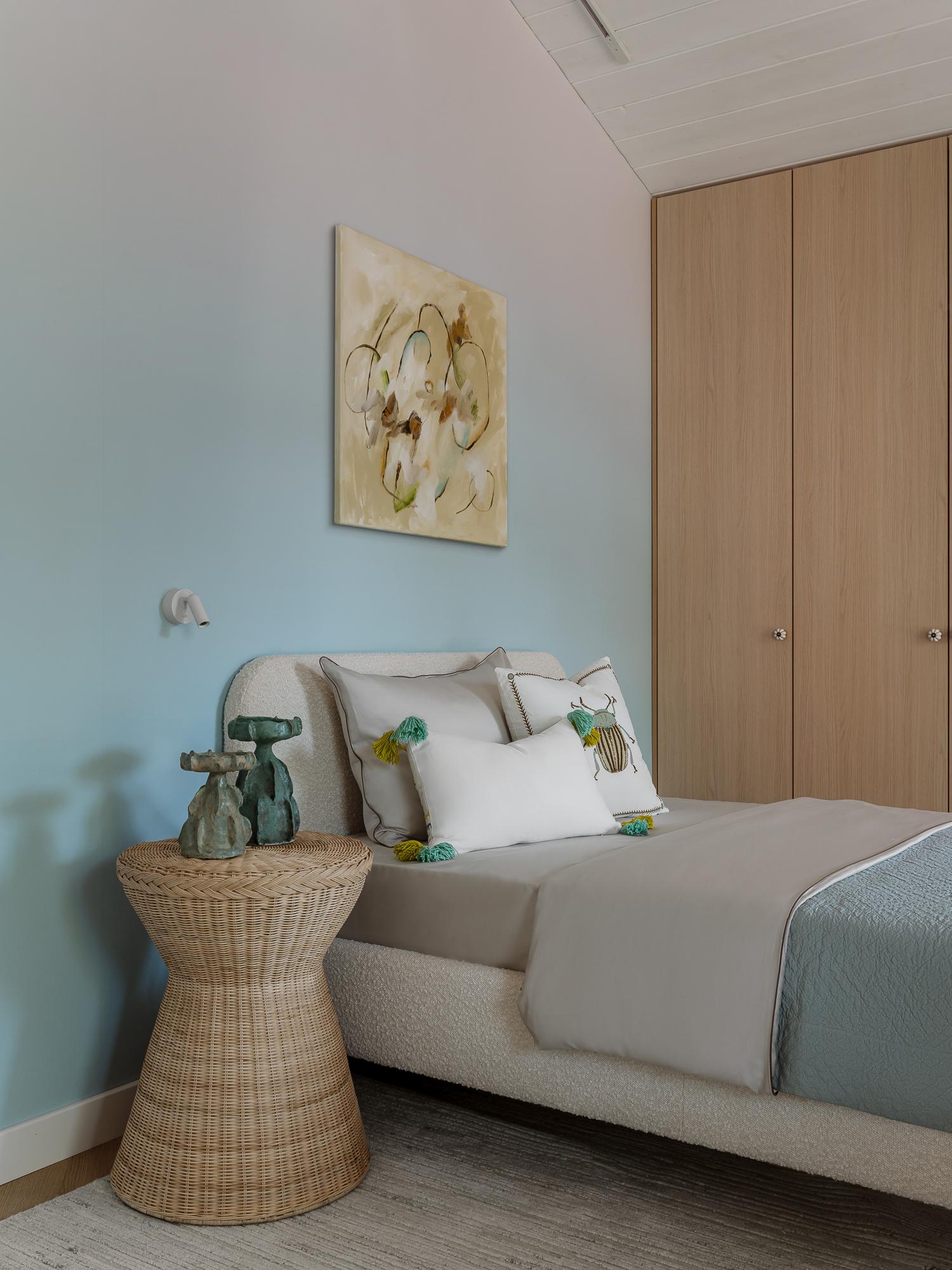 Все три спальни такие же светлые, как и весь дом, с акцентными панно, расширяющими пространство. В мастер-спальне царит безмятежность: нежный голубой цвет на стене, изящный голубой кант на кровати, уютное кресло и красочная картина, выступающая нежным контрастом. А главное — вид на сад и озеро.