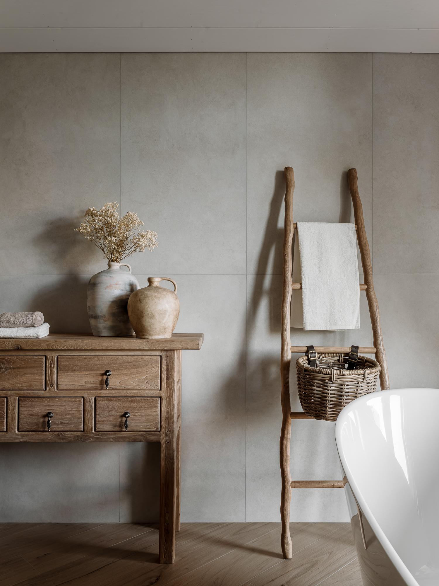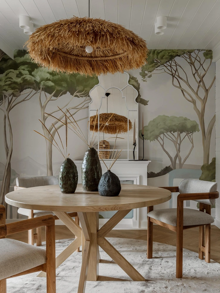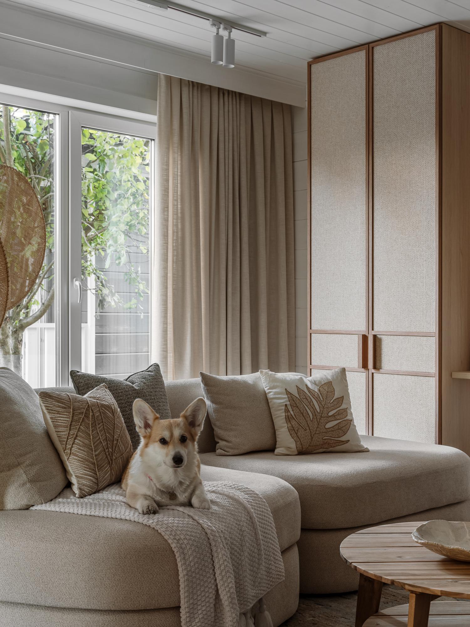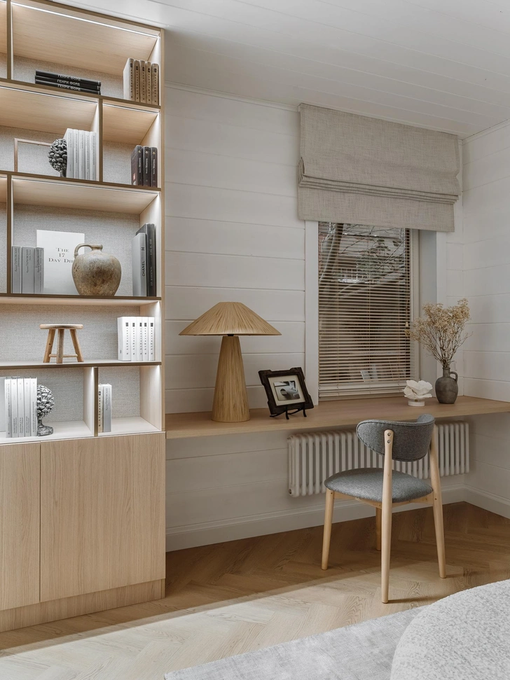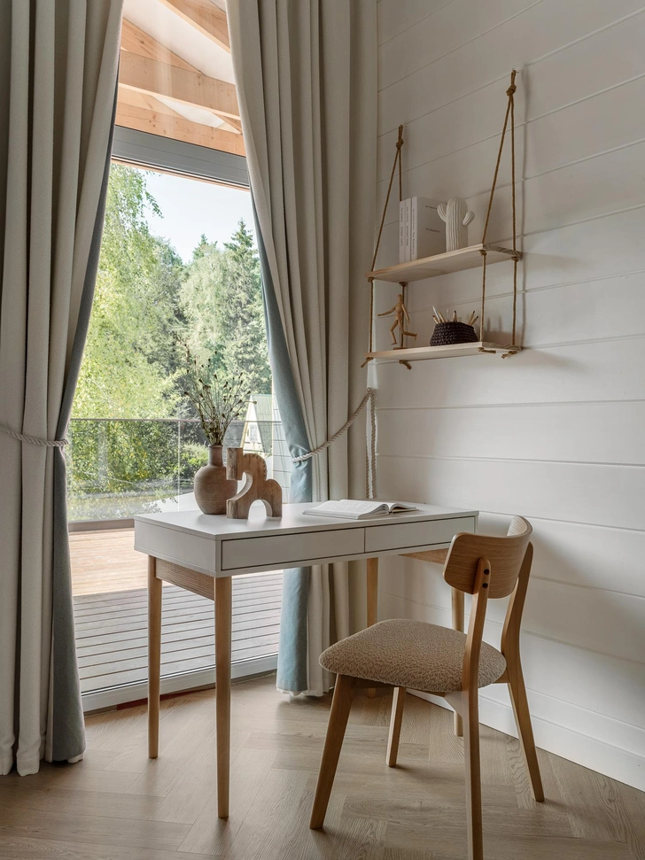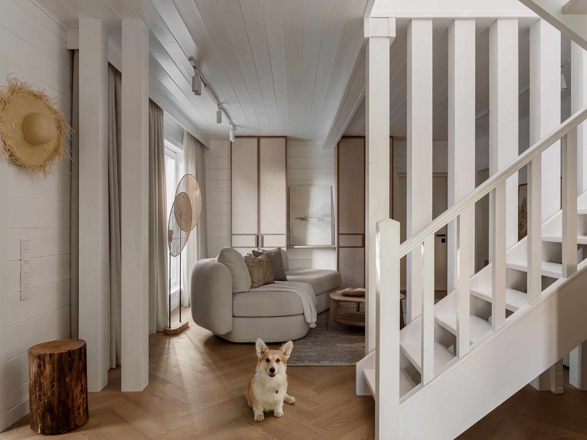 Когда я впервые здесь побывала, я очень вдохновилась: водная стихия, близость леса — все это отразилось в интерьере. Благодаря большим окнам эти пейзажи будто становятся частью дома. Я решила дополнить эту атмосферу средиземноморскими мотивами и светлым деревом: на контрасте с темным фасадом это смотрится эффектно.
