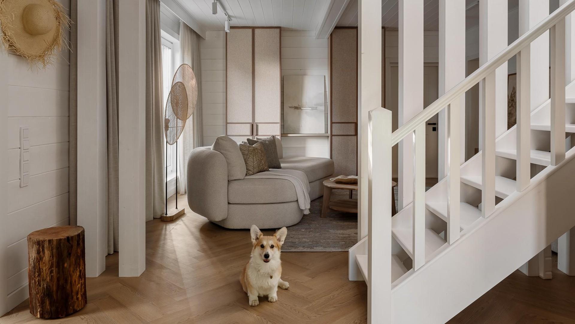 Заказчики купили этот участок из-за прекрасного вида и выхода к тихому красивому озеру. Они хотели вписать дом в живописный ландшафт и создать интерьер, который понравился бы молодой семье с двумя детьми. Это инвестиционный проект, поэтому он должен быть, с одной стороны, универсальным, а с другой — не безликим, с интересными акцентами.