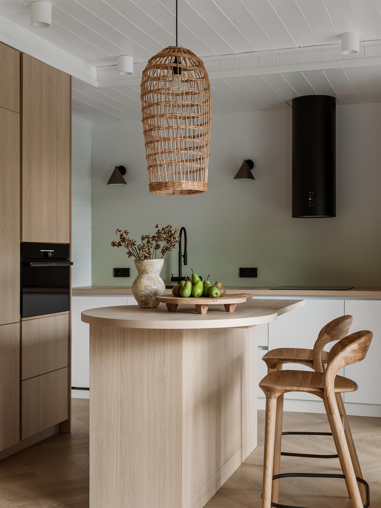 На первом этаже находятся большая кухня-столовая, гостиная и кабинет, санузел. Из-за того, что планировку было не изменить, комнаты получились не такими просторными, как хотелось, зато мне удалось скорректировать все пропорции за счет мебели. Кухня получилась лаконичной: без верхних шкафов, с красивым скругленным островом, над которым висит прекрасный ротанговый светильник.
