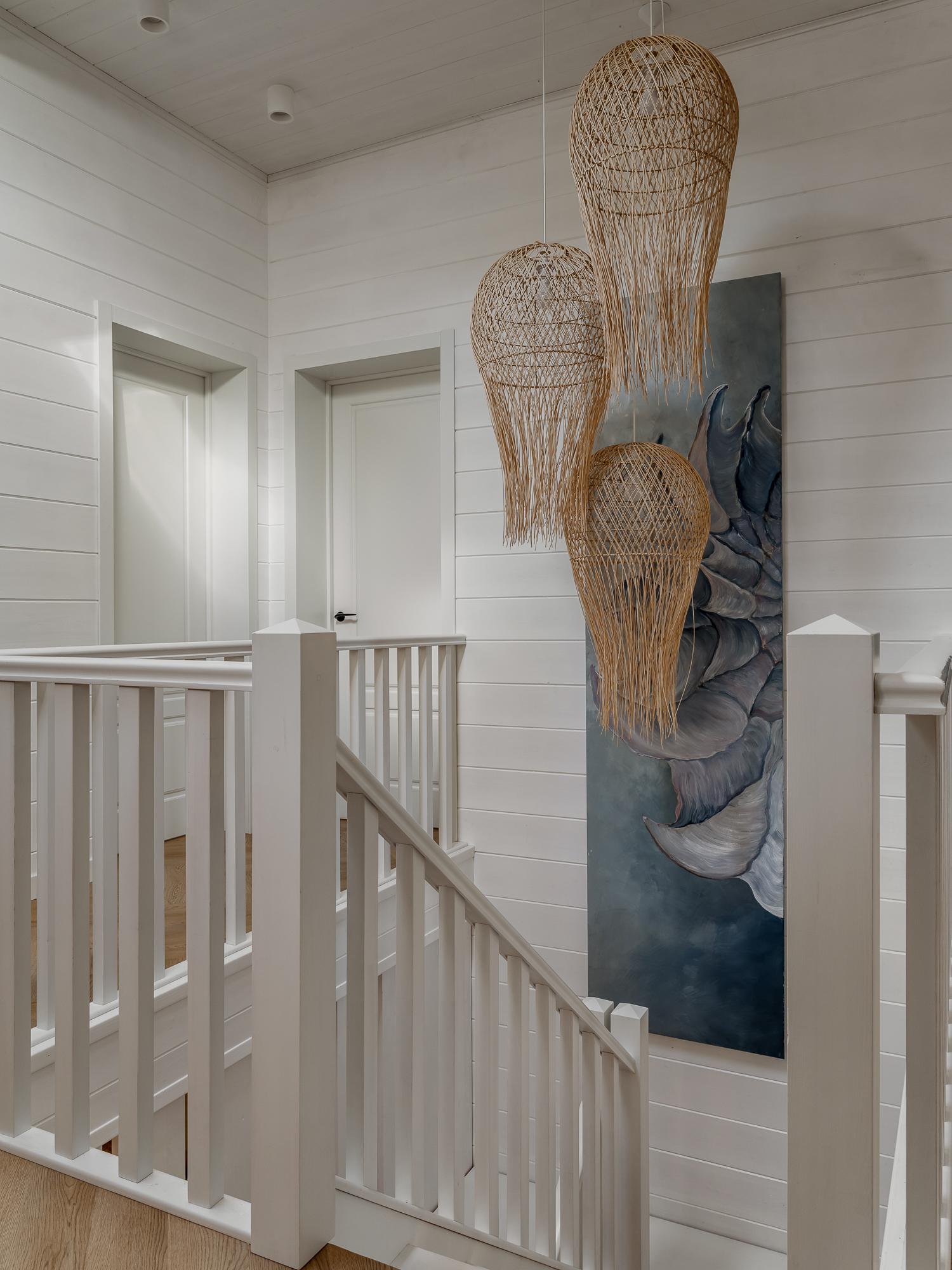 На втором этаже — две детские, спальня родителей и ванная комната. Туда можно подняться по красивой белой лестнице и заодно заметить большую картину (80х300см), которую я написала прямо в этом доме. Мне очень хотелось написать что-то абстрактное, но при этом вписывающееся в морскую тематику — поэтому я изобразила часть ракушки, похожую на цветок.