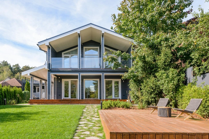 Дом не новый, и заказчик захотел его полностью перестроить и расширить. Задача оказалось очень сложной, я столкнулась с таким впервые: стены, коммуникации и проемы нельзя было не только переносить, но и сдвигать. Мне помогали опытные строители деревянных домов. Зато мы увеличили площадь почти вдвое: добавили три большие террасы со стеклянным ограждением и гараж, а на месте старого сарая — новый гостевой домик с таким же фасадным решением.