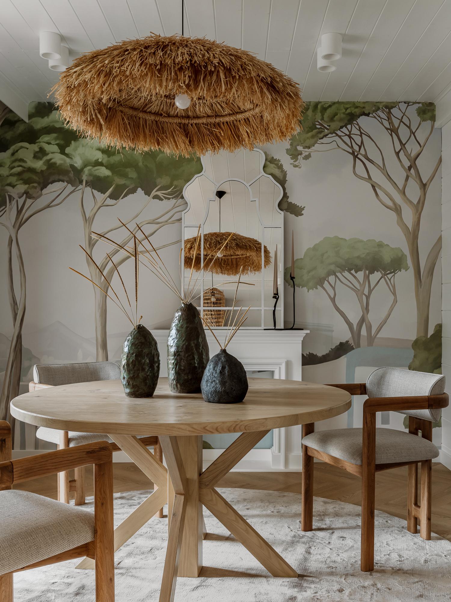 Стену в столовой украшает панно со средиземноморским пейзажем. Его дополняет композиция из каминного портала и зеркала. Иногда бывает, что интерьер собирается сразу, но какой-то предмет ищешь долго — этим предметом и стало зеркало, сложно было найти подходящий размер. Я купила его в золотой раме и перекрасила в белый — заказчики не сразу меня поняли, но когда увидели результат, удивились.