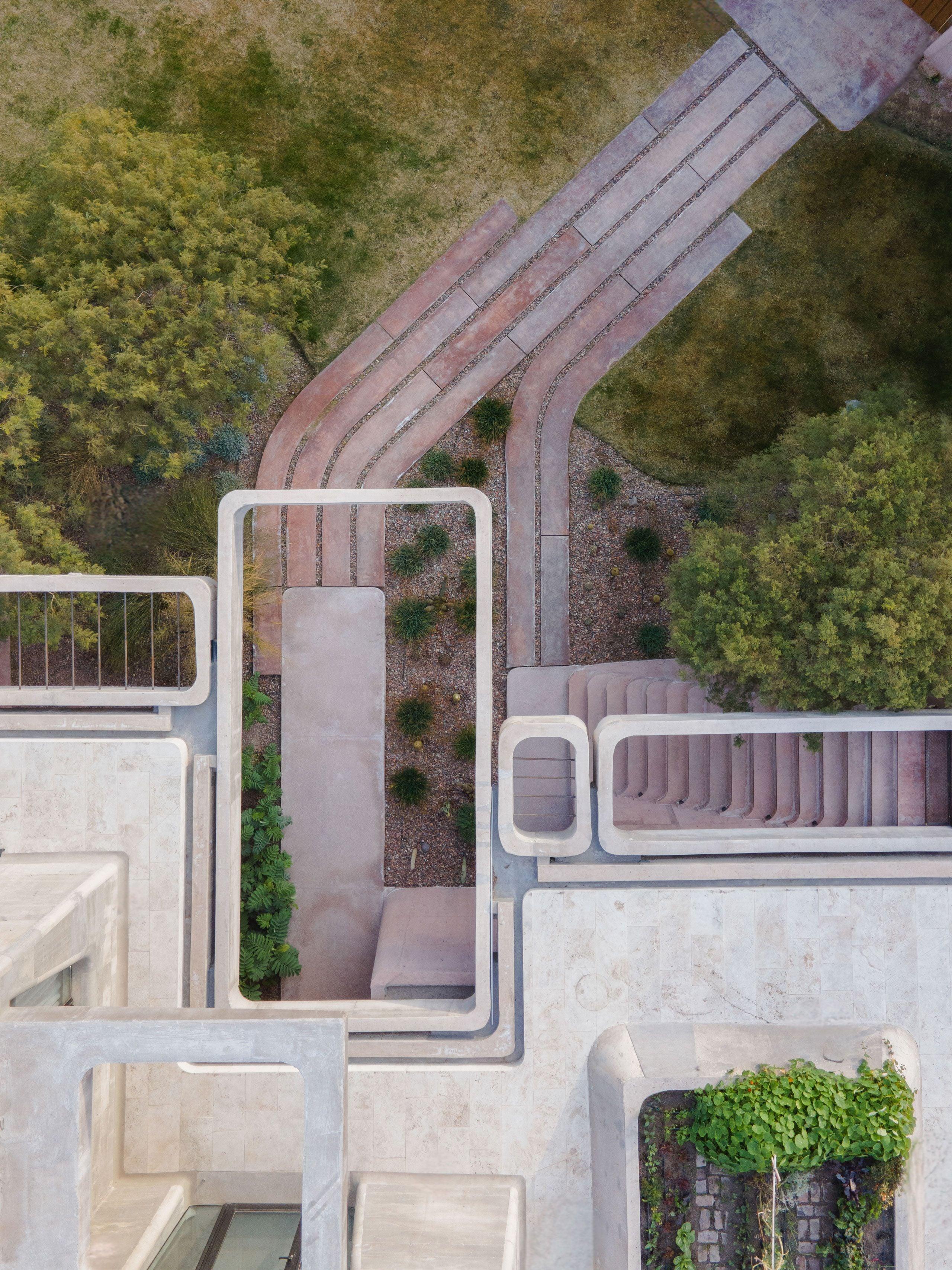 Бетон, главный материал проекта, создавался не по шаблону: его цвет и текстуру подбирали непосредственно на месте, добиваясь идеального слияния с местными скалами и почвой. В итоге массивные стены кажутся не построенными, а выросшими из холма, как его естественное продолжение. Этот принцип авторы называют «абстрактной природой» — когда архитектура не копирует, а усиливает ощущения от ландшафта.