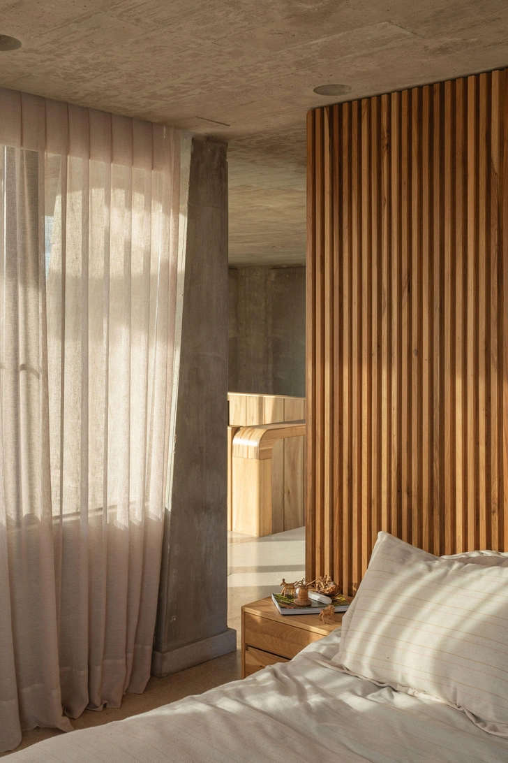Внутренние помещения продолжают философию «честности». Бетон здесь не прячут под штукатуркой — его фактура, следы опалубки, становятся главным декором. Натуральное дерево и полы из терраццо вносят необходимую теплоту и тактильное разнообразие.