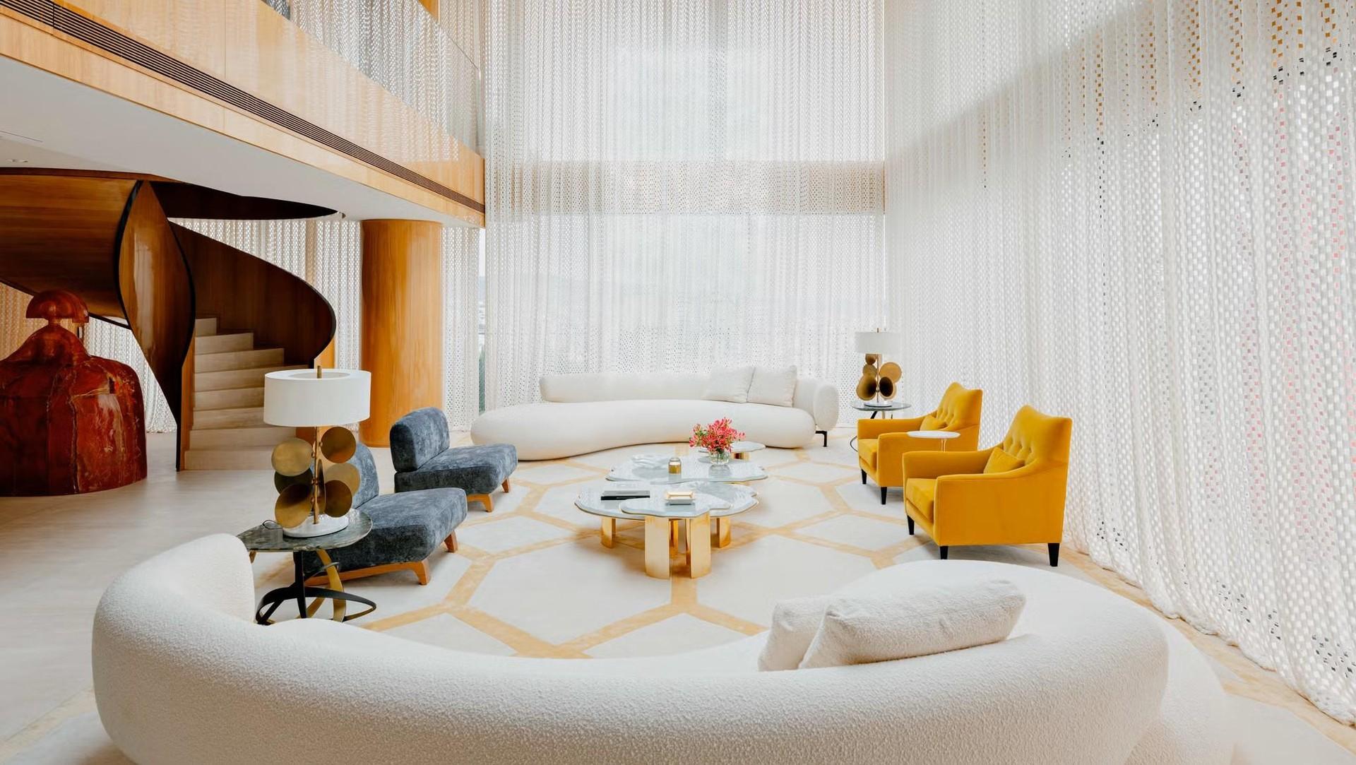 Гостиную украшают два дивана June, дизайна Жадера Алмейды. Два желтых бархатных кресла Newton по дизайну Патрика Наггара стоят рядом с парой стульев, изготовленных на заказ Паскалем Амбросио, лампой и геридоном от Эрве ван дер Стратена. Журнальный столик, Paolo Castelli. Ковер и шторы — макраме Vitrine.