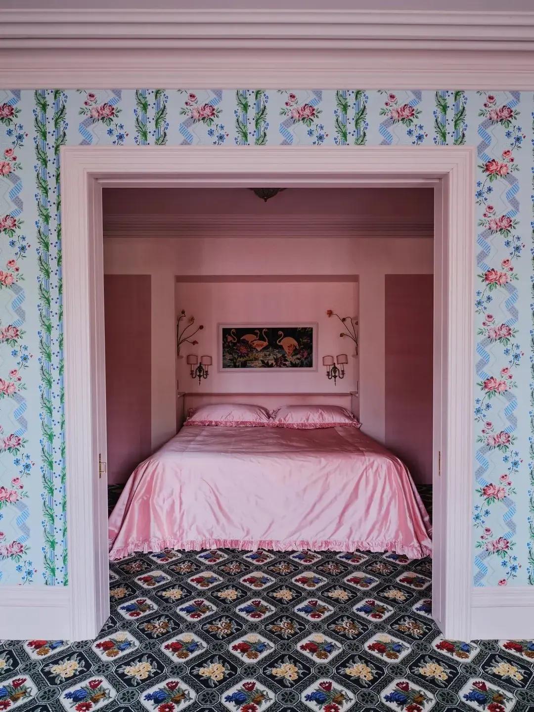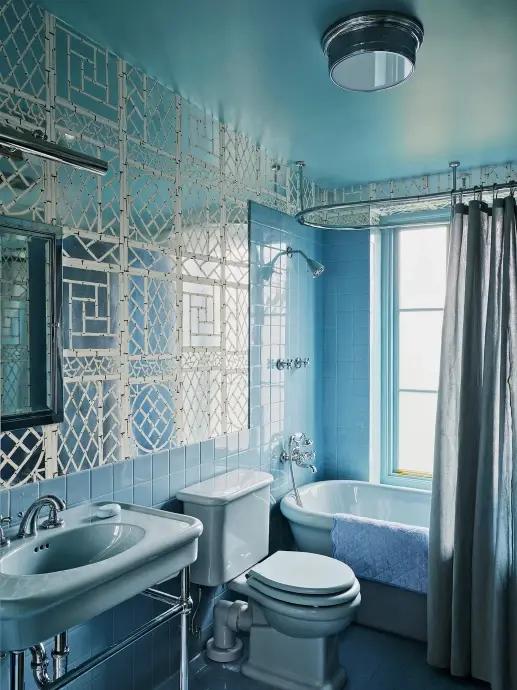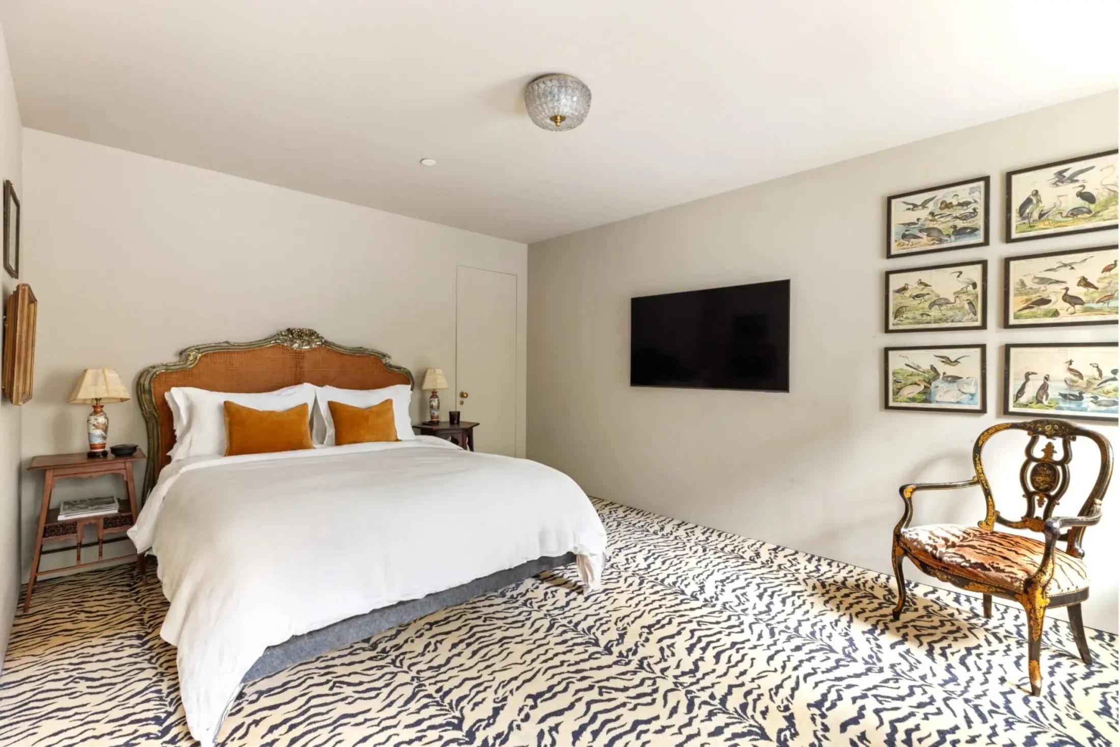 Настоящим камнем преткновения для консервативных ценителей интерьера стала главная ванная комната. Дизайнер Билли Коттон решился на смелый шаг, использовав там ковровое покрытие с геометрическим принтом Pierre Frey.